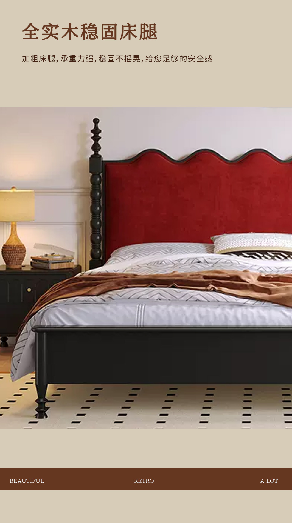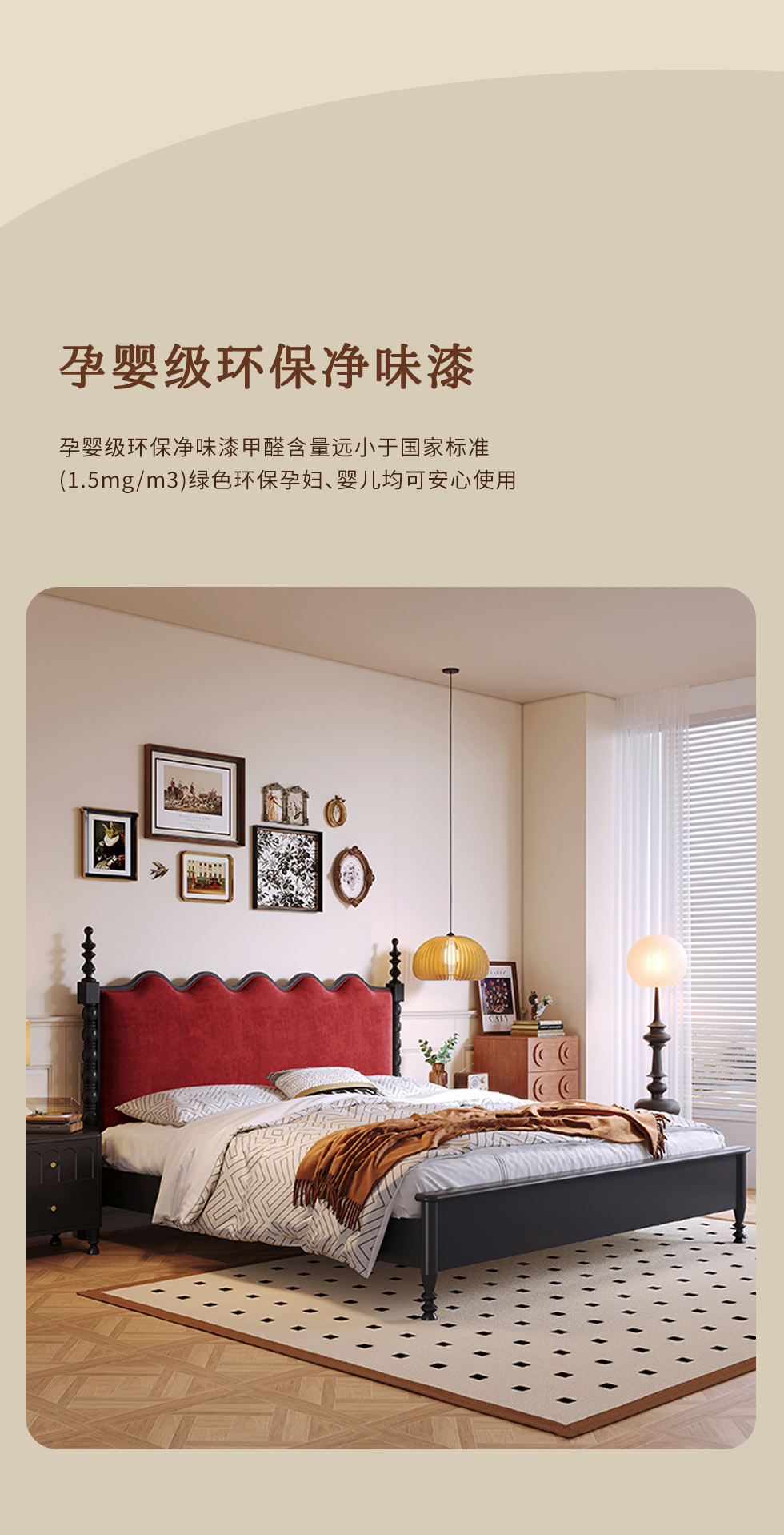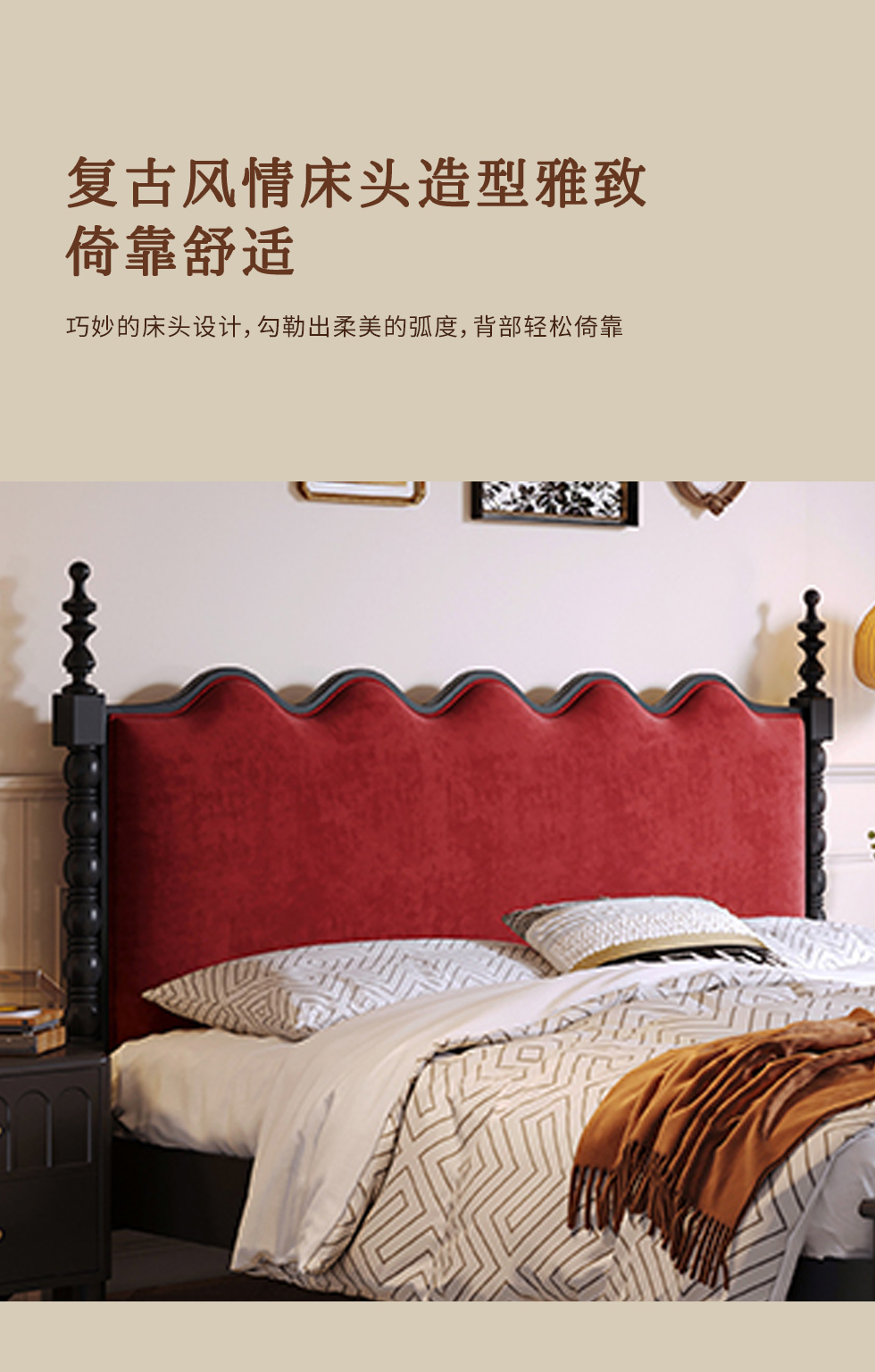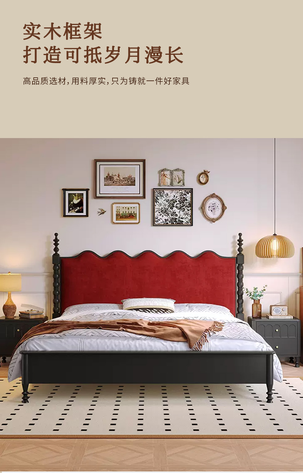 中古·尚 网红 中古风 进口像胶木+布艺+高回弹海绵+多层实木板+全实木床板+碳素钢五金配件 黑红色 1.8米床