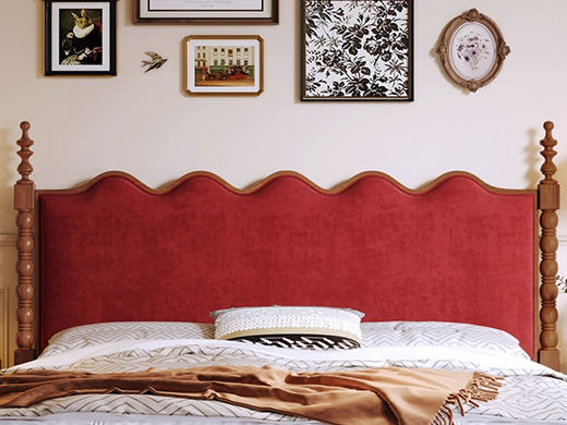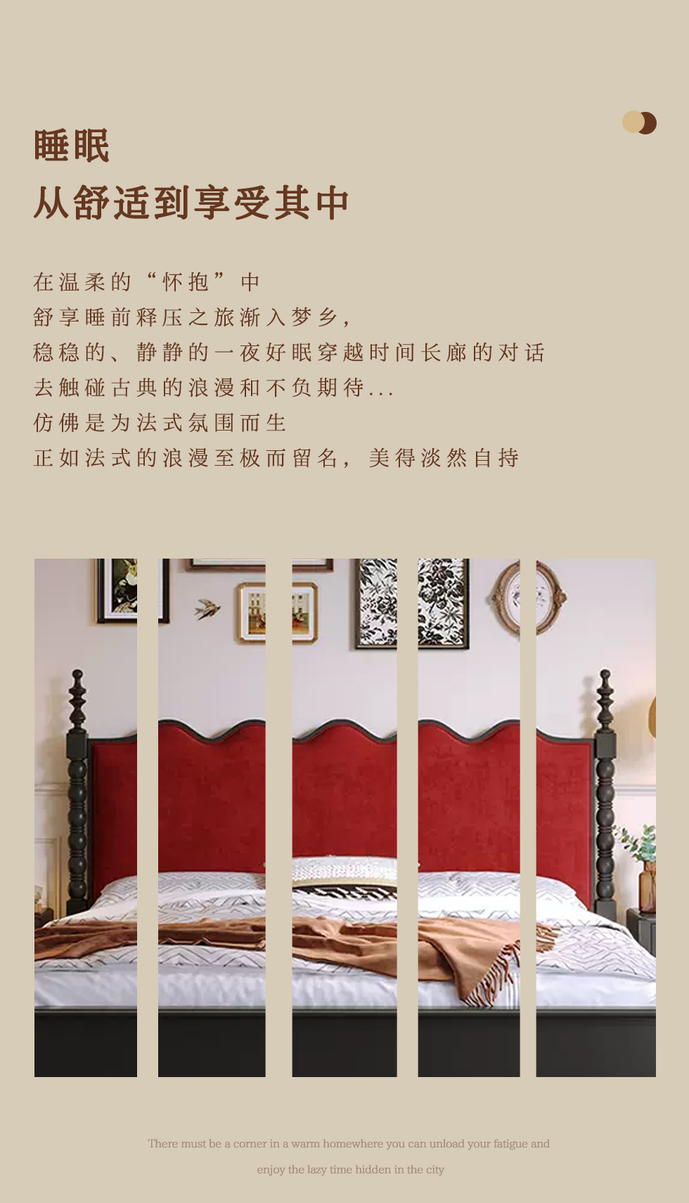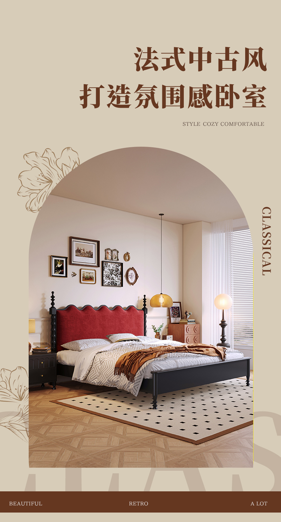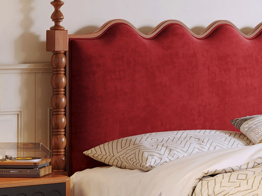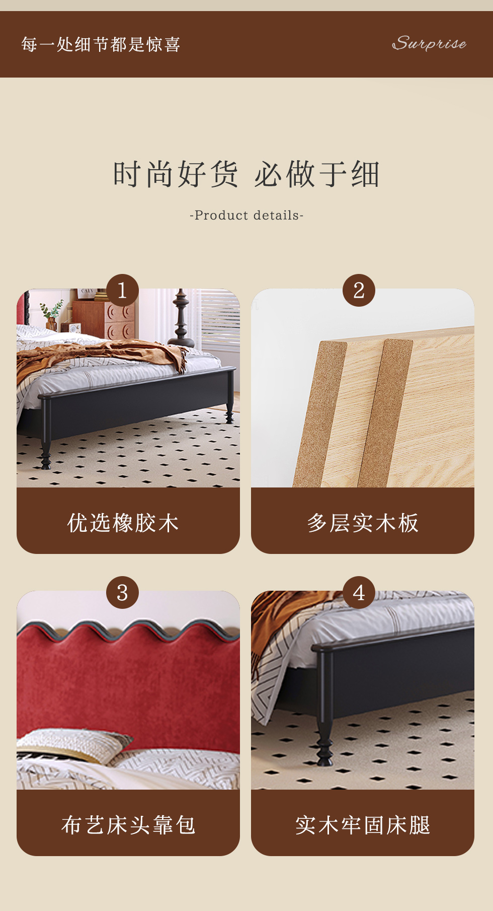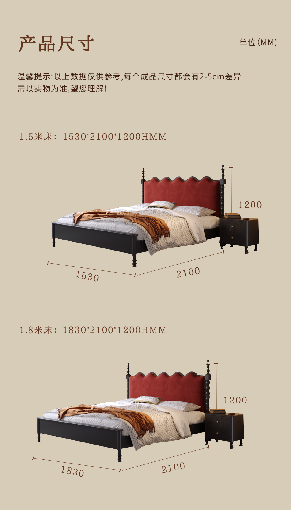 中古·尚 网红 中古风 进口像胶木+布艺+高回弹海绵+多层实木板+全实木床板+碳素钢五金配件 黑红色 1.8米床