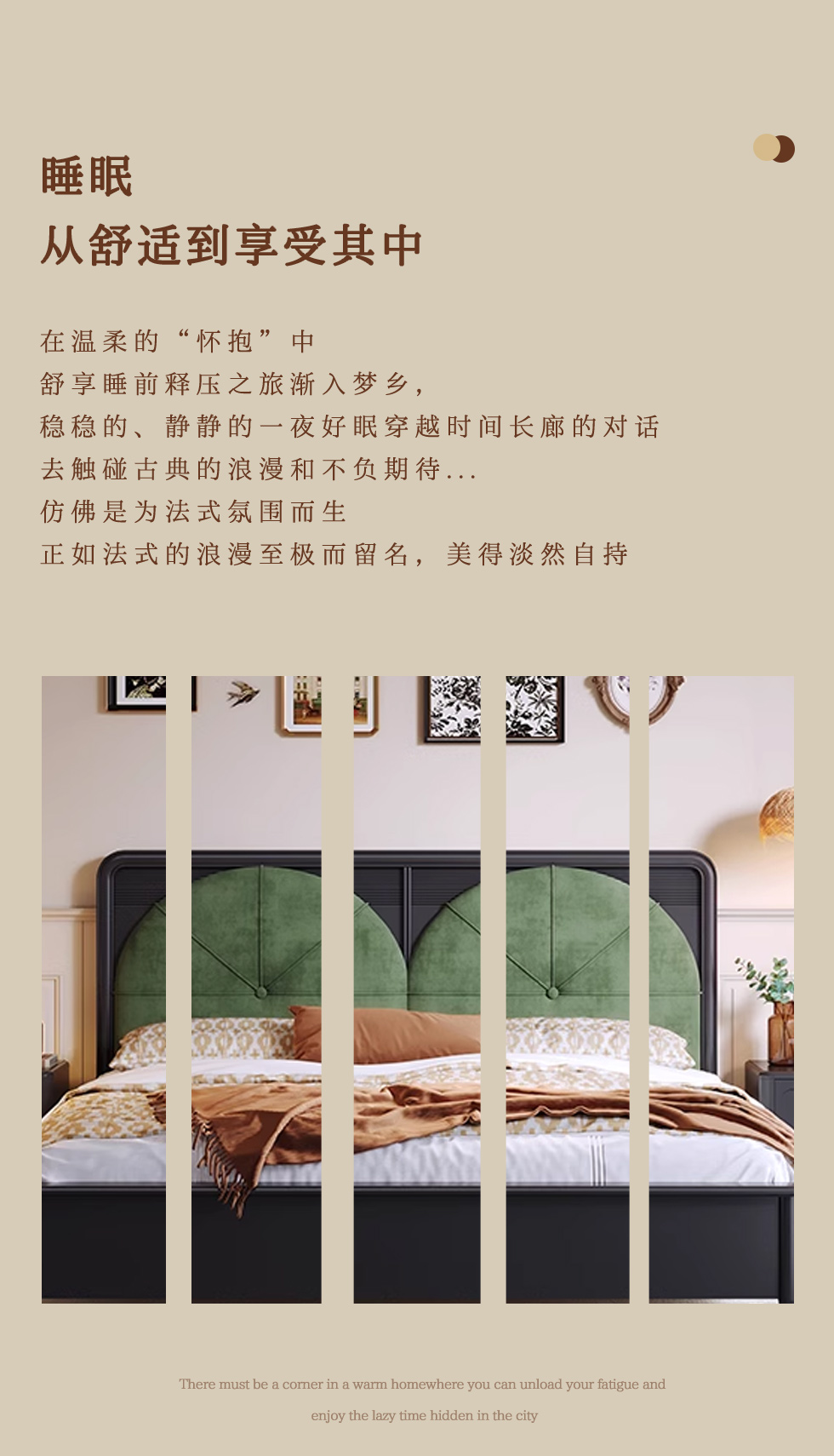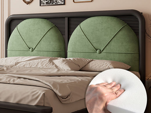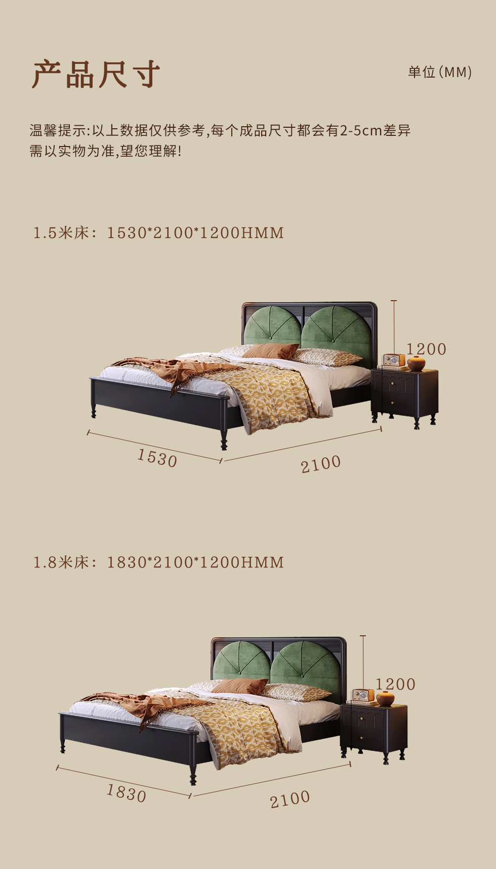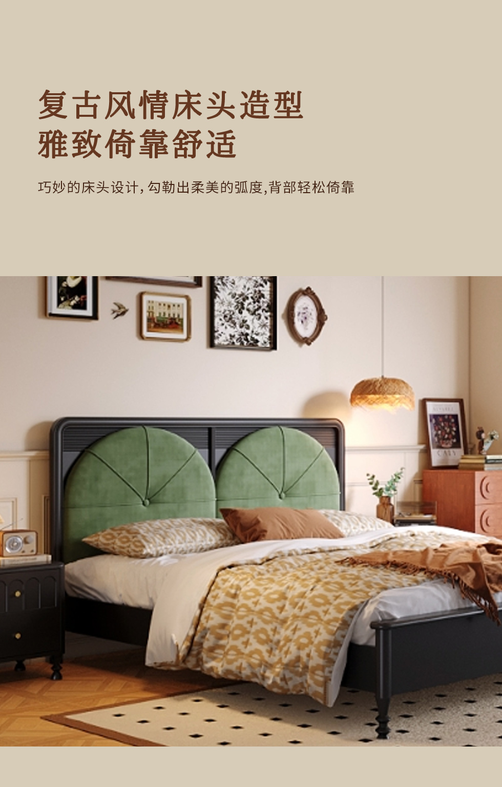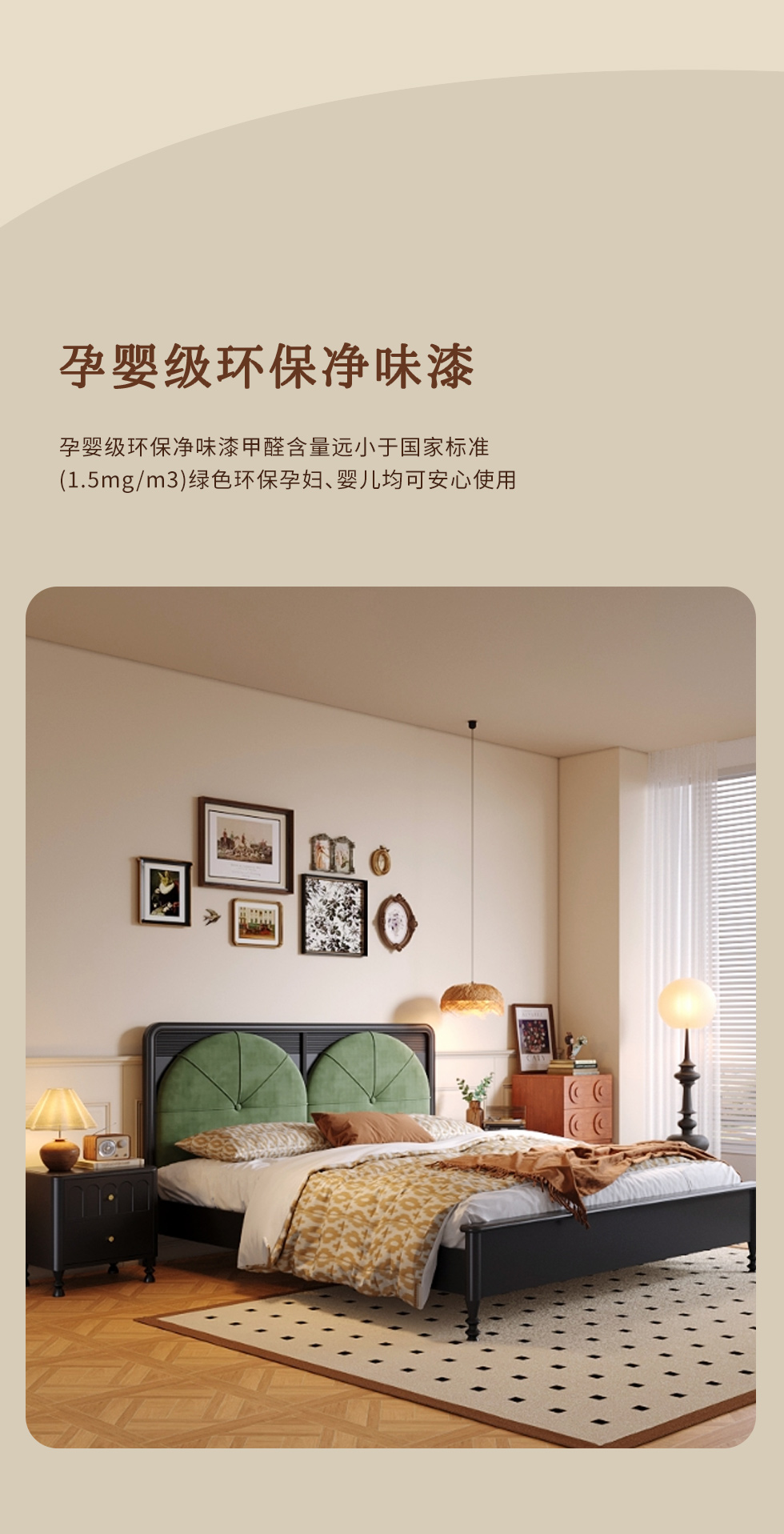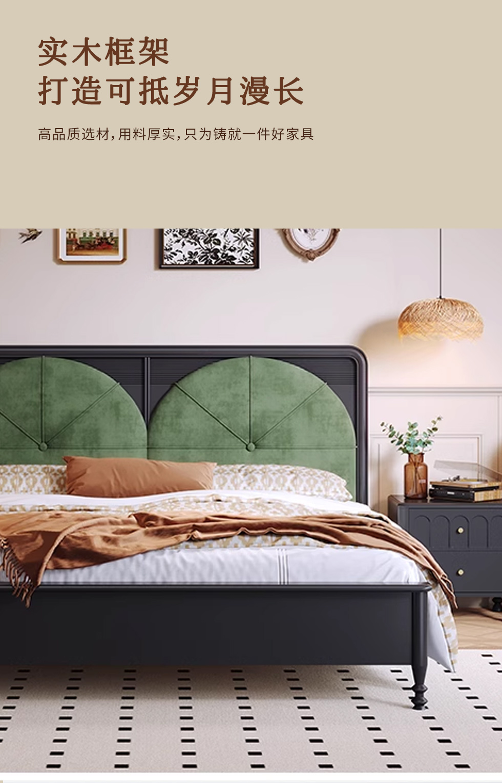 中古·尚 网红 中古风 进口像胶木+布艺+高回弹海绵+多层实木板+全实木床板+碳素钢五金配件 黑绿色 1.8米床