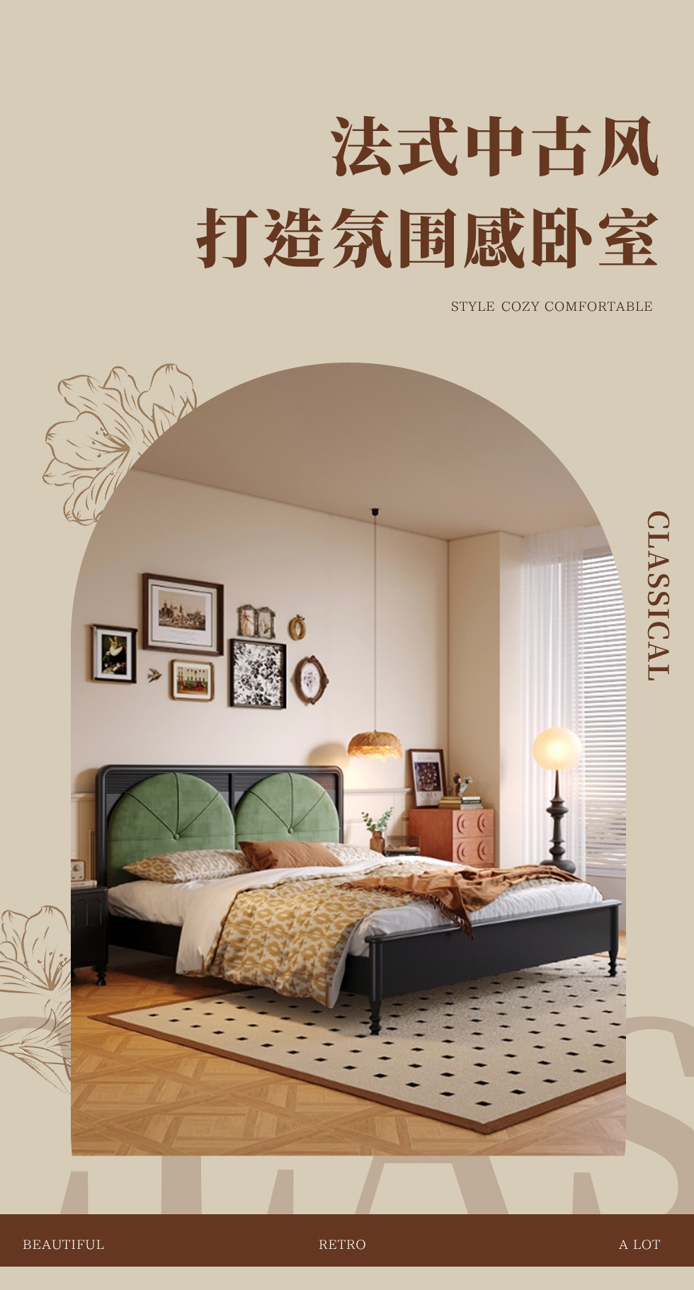 中古·尚 网红 中古风 进口像胶木+布艺+高回弹海绵+多层实木板+全实木床板+碳素钢五金配件 黑红色 1.8米床¥6044