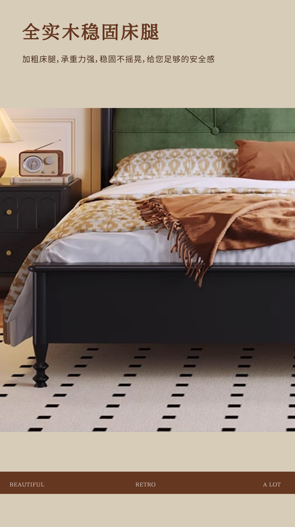 中古·尚 网红 中古风 进口像胶木+多层实木板+全实木床板+碳素钢五金配件 黑色 1.8米床