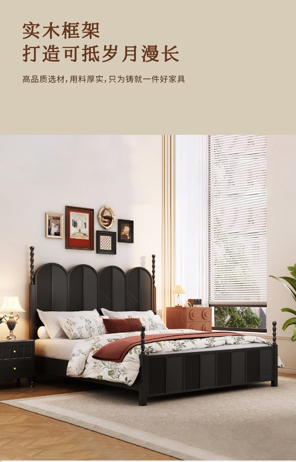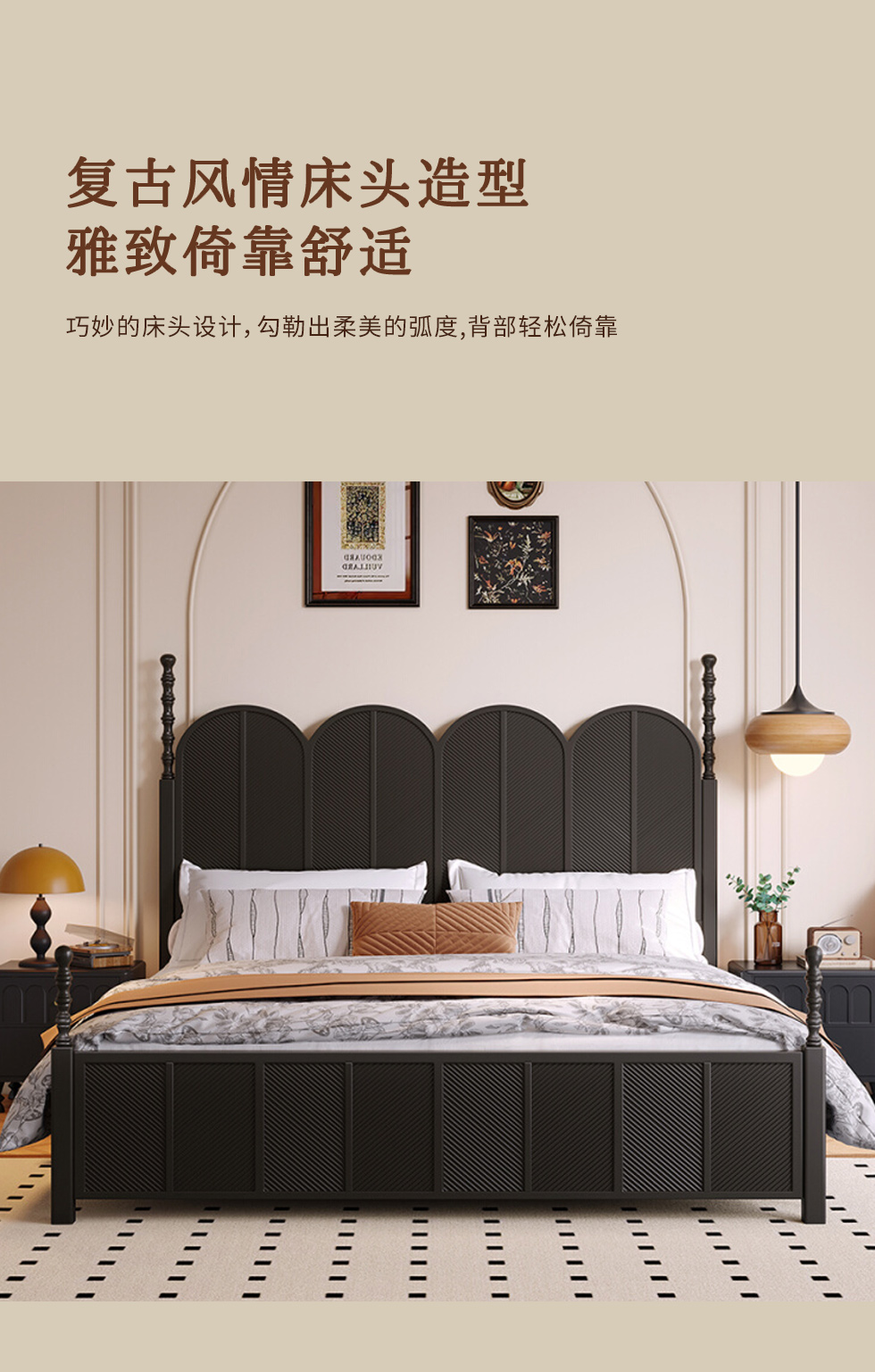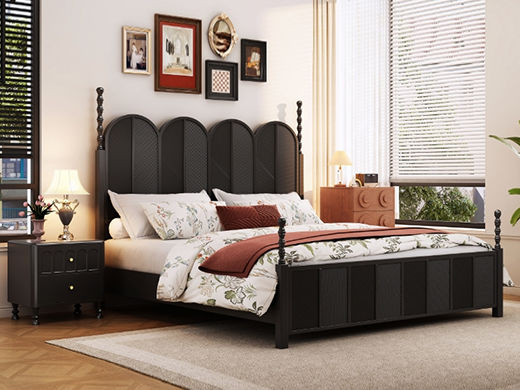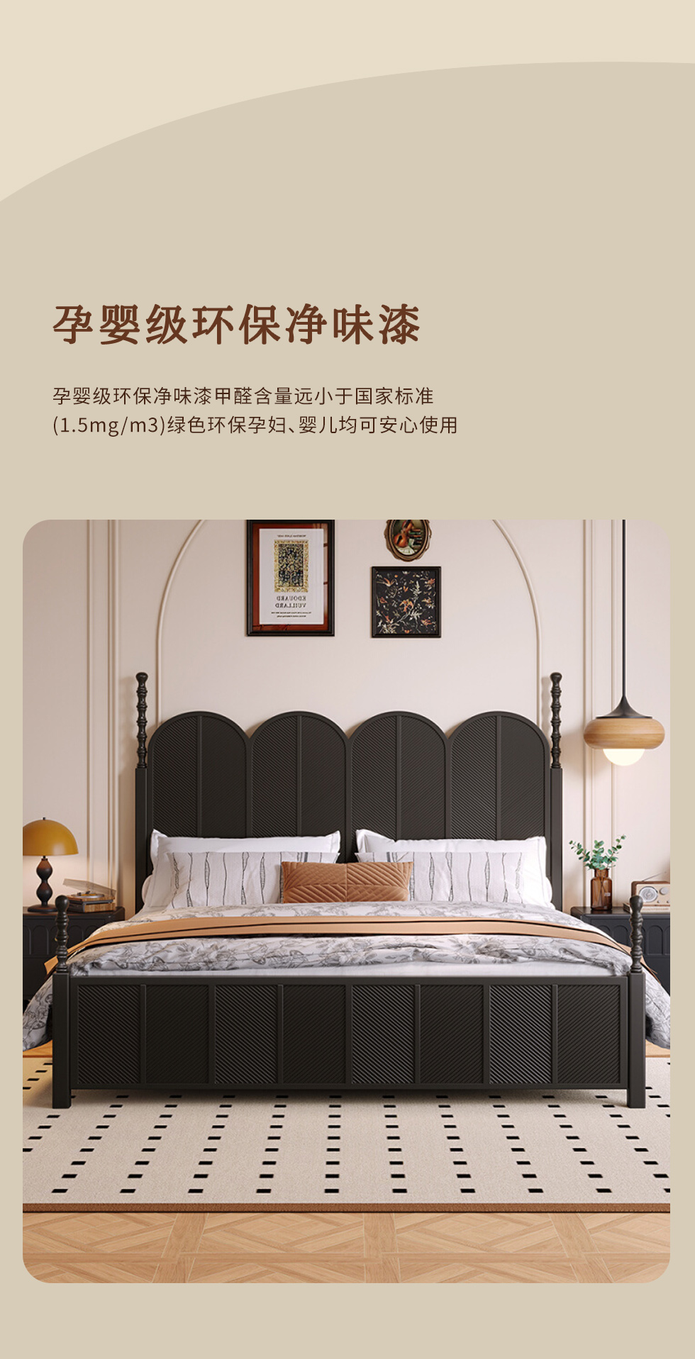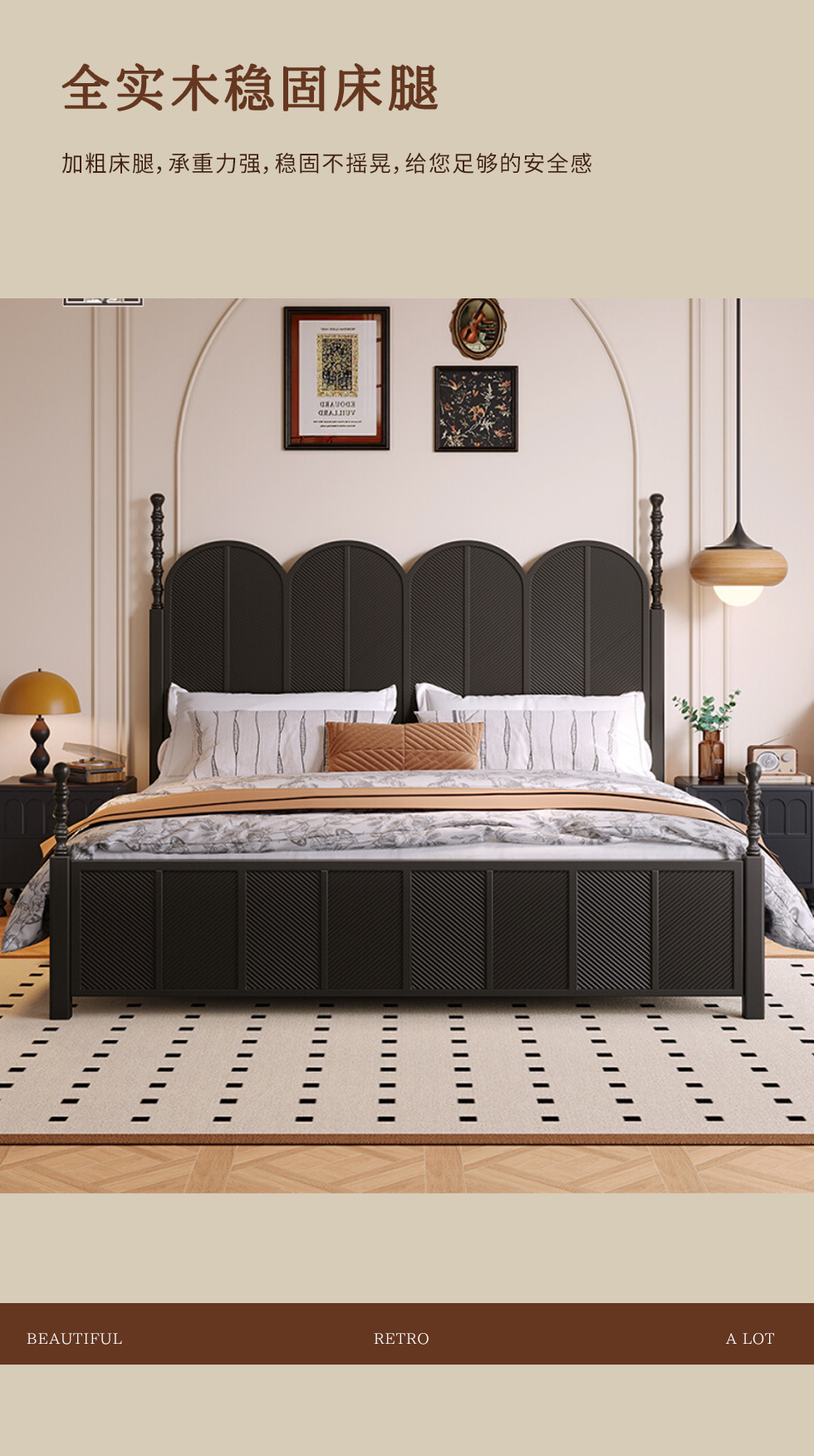 中古·尚 网红 中古风 进口像胶木+多层实木板+全实木床板+碳素钢五金配件 黑色 1.8米床