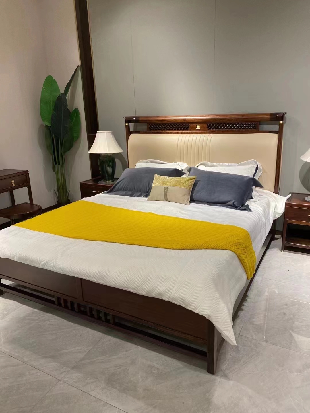 美檀家居 新中式 进口黑檀木+仿真皮+高回弹海绵+多层实木板+静音床板+电镀五金 黑檀色 1.8米床