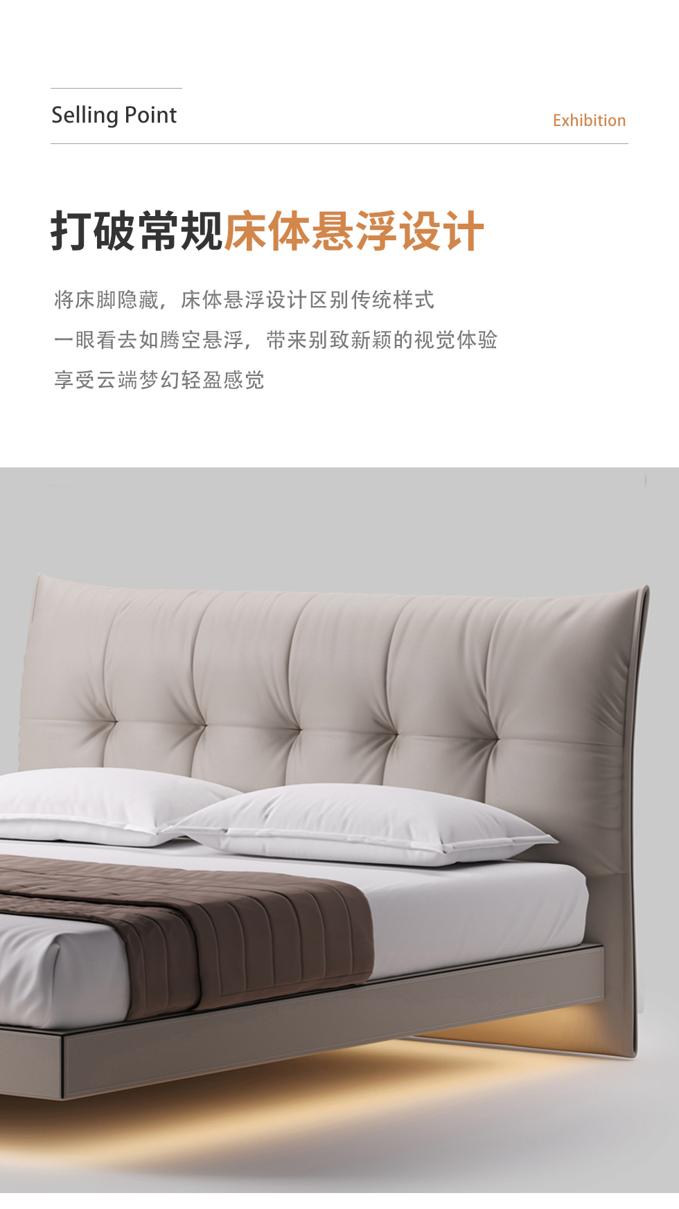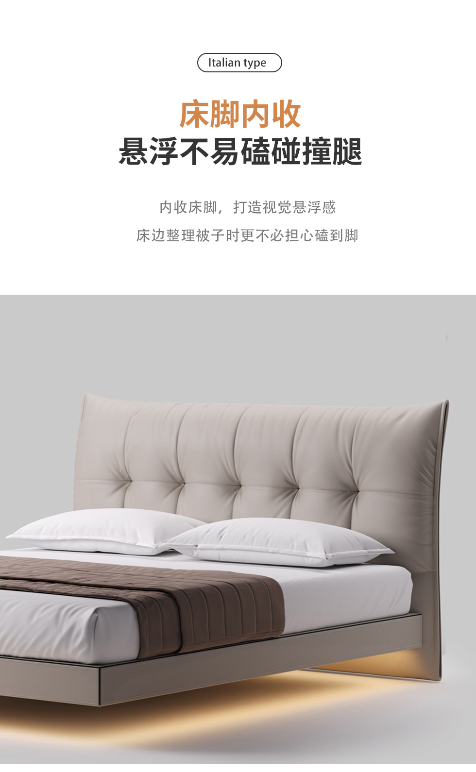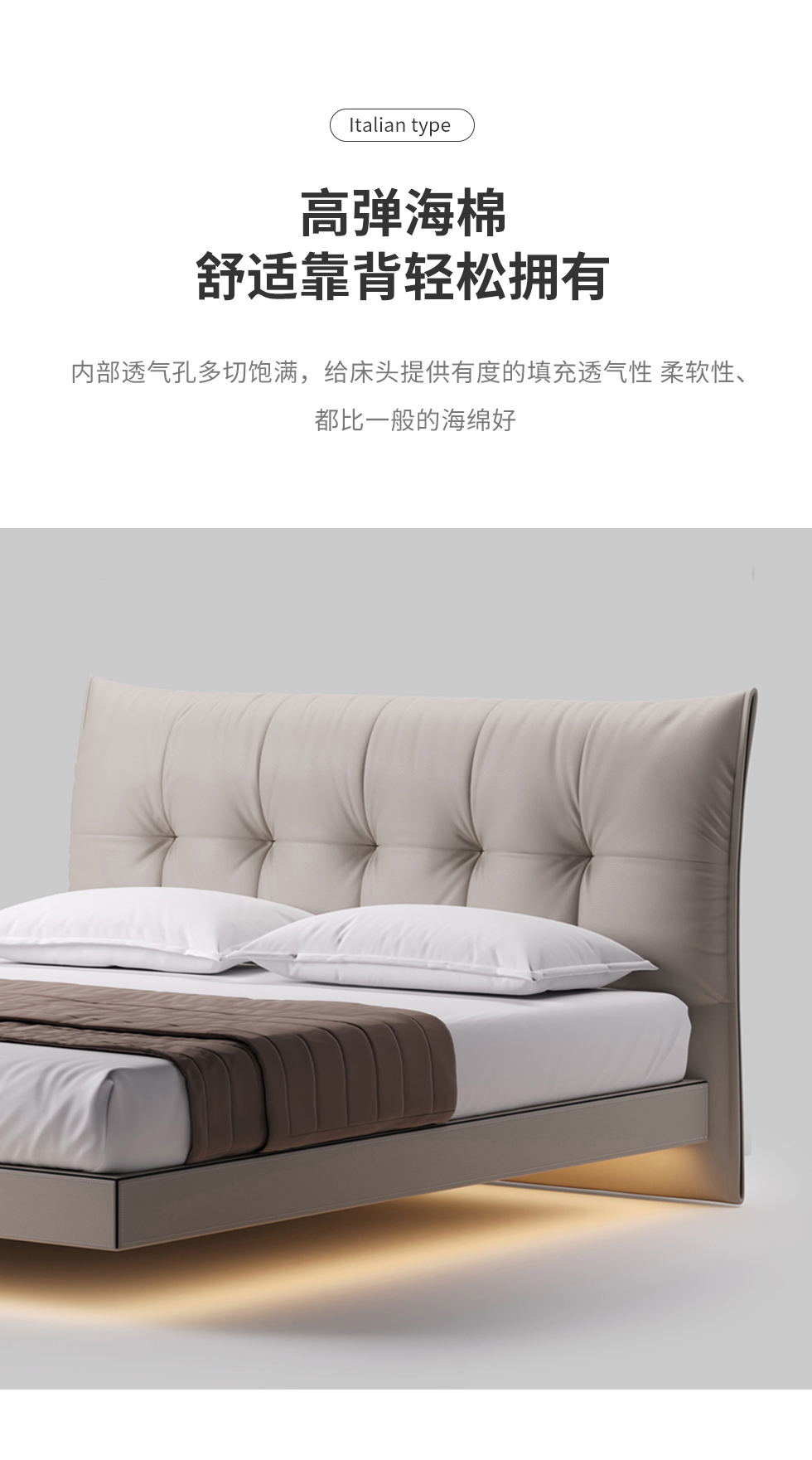 德卡图 现代简约 全头层黄牛皮 全实木整体床架俄罗斯落叶松+多层板+高弹海棉+紫罗兰海棉 1.8*2.0米悬浮床¥6505