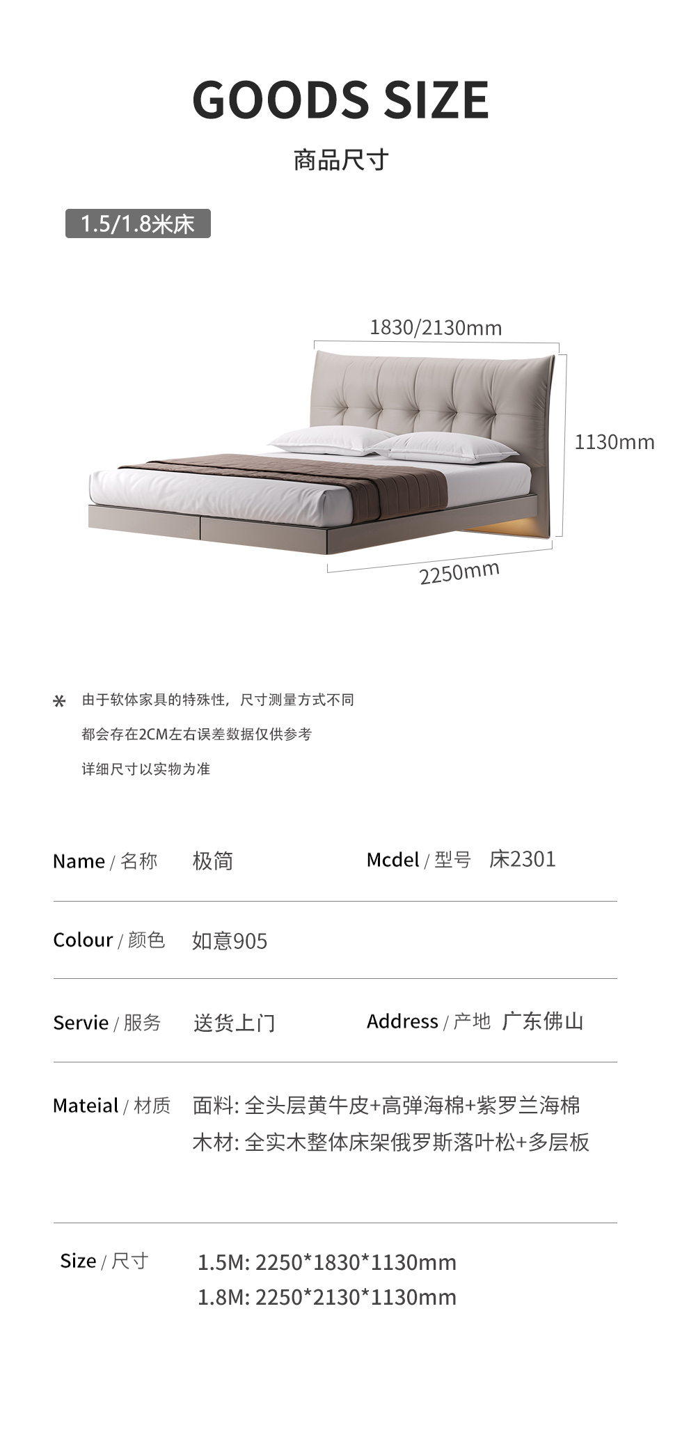 德卡图 现代简约 全头层黄牛皮 全实木整体床架俄罗斯落叶松+多层板+高弹海棉+紫罗兰海棉 1.8*2.0米悬浮床¥6505
