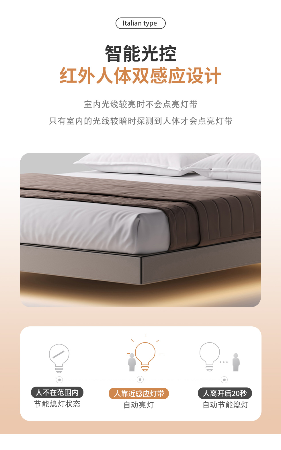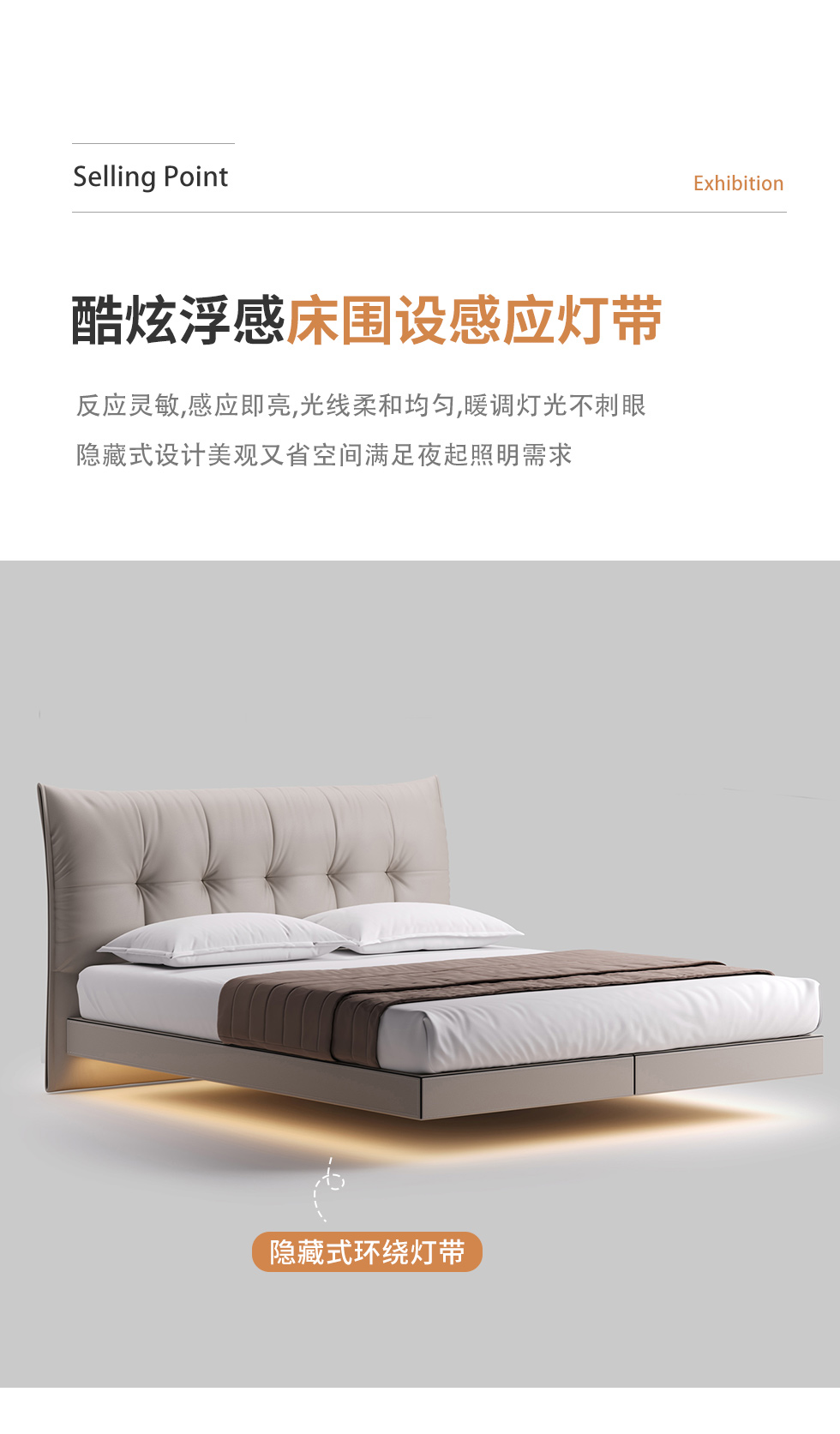 德卡图 现代简约 全头层黄牛皮 全实木整体床架俄罗斯落叶松+多层板+高弹海棉+紫罗兰海棉 1.8*2.0米悬浮床¥10841