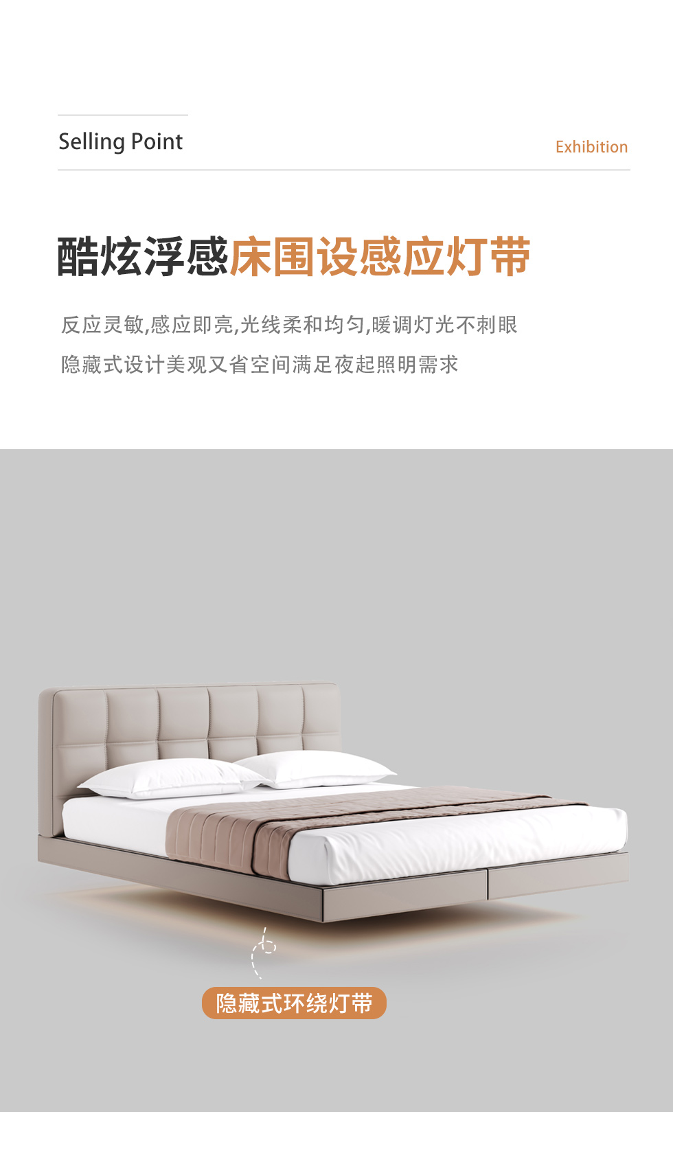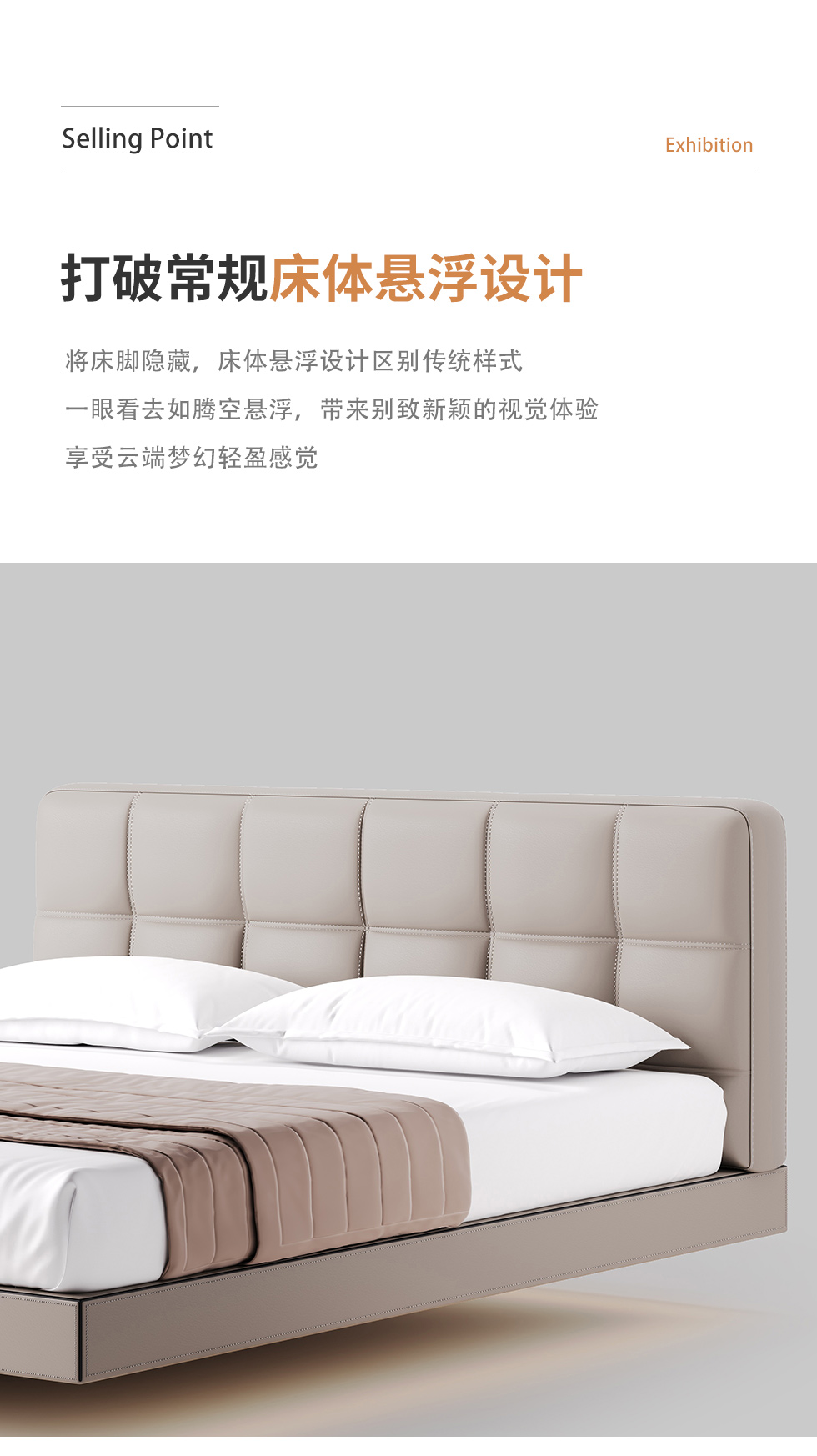 德卡图 现代简约 全头层黄牛皮 全实木整体床架俄罗斯落叶松+多层板+高弹海棉+紫罗兰海棉 1.8*2.0米悬浮床¥10841