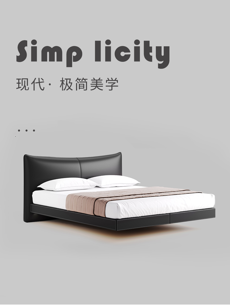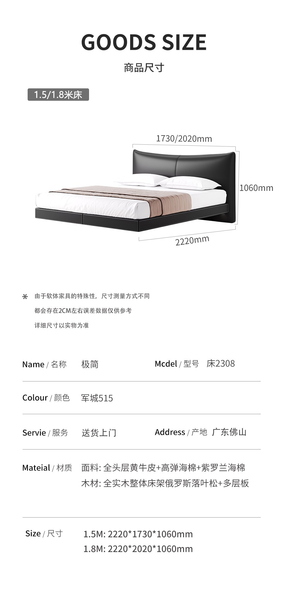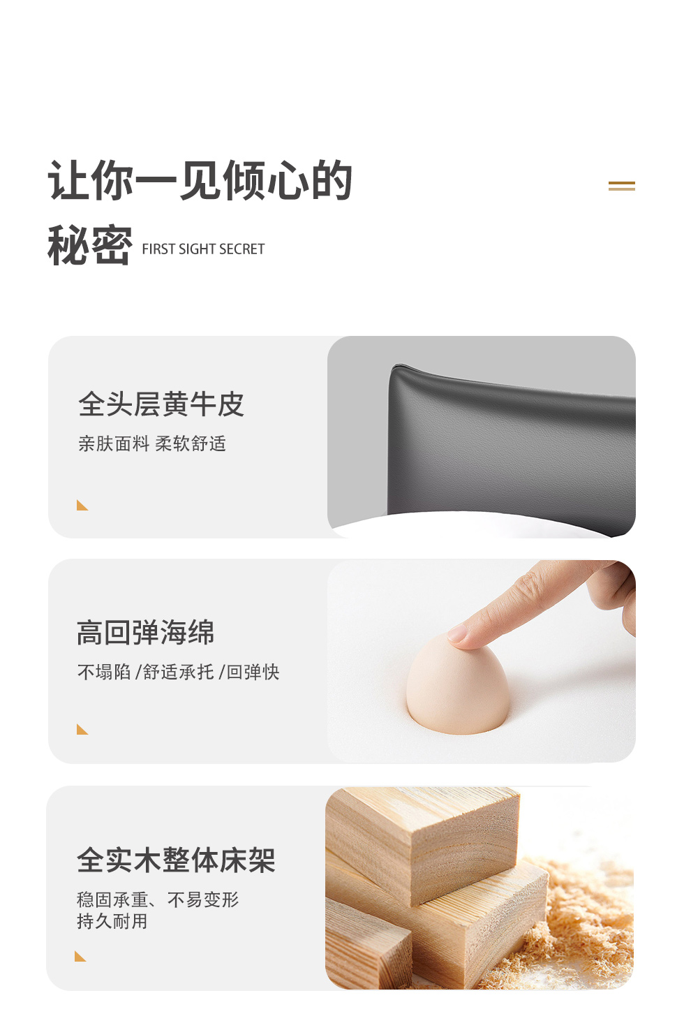 德卡图 现代简约 全头层黄牛皮 全实木整体床架俄罗斯落叶松+多层板+高弹海棉+紫罗兰海棉 1.8*2.0米悬浮床¥6505
