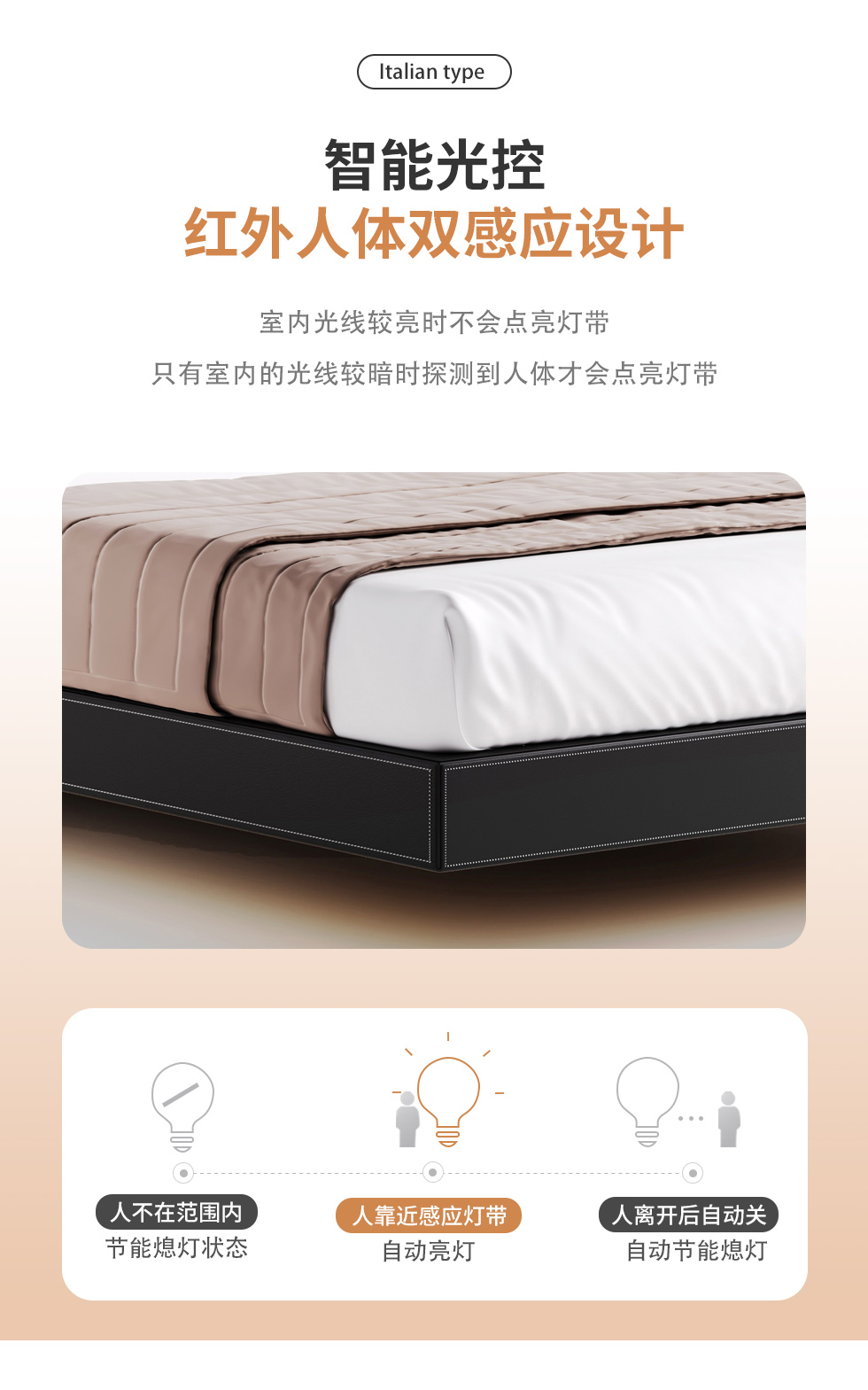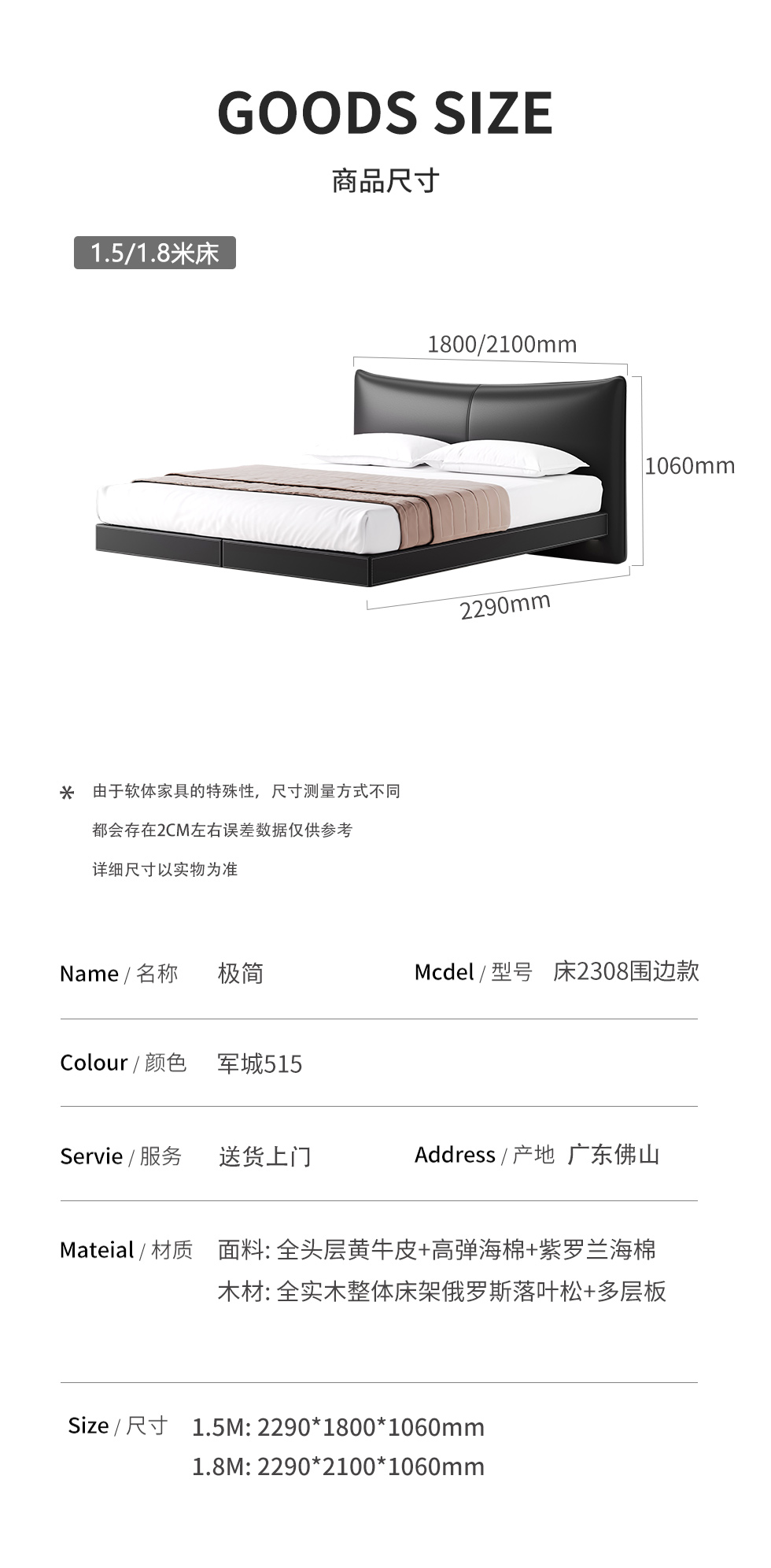 德卡图 现代简约 全头层黄牛皮 全实木整体床架俄罗斯落叶松+多层板+高弹海棉+紫罗兰海棉 1.8*2.0米悬浮床¥6505