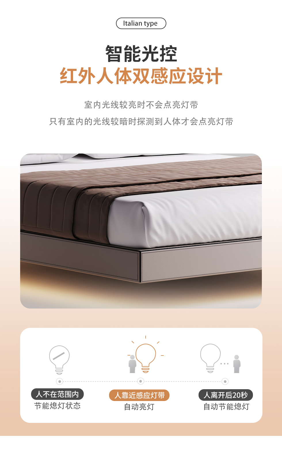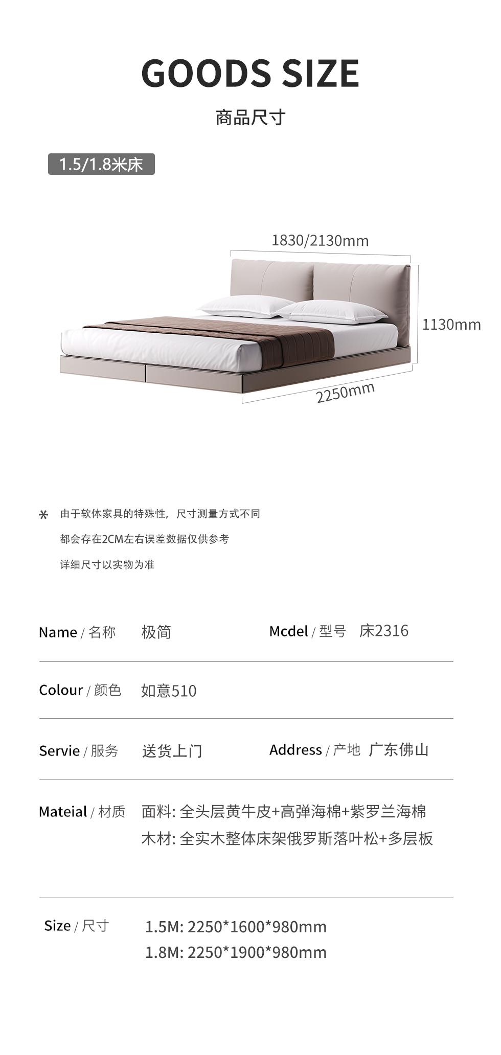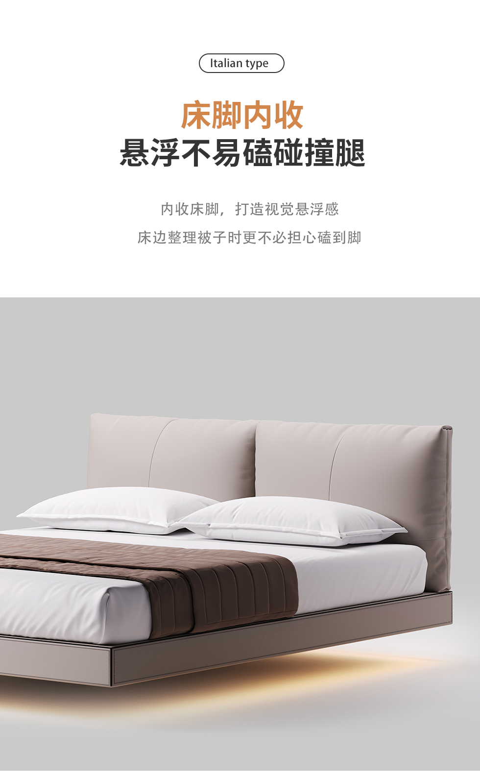德卡图 现代简约 全头层黄牛皮 全实木整体床架俄罗斯落叶松+多层板+高弹海棉+紫罗兰海棉 1.8*2.0米悬浮床