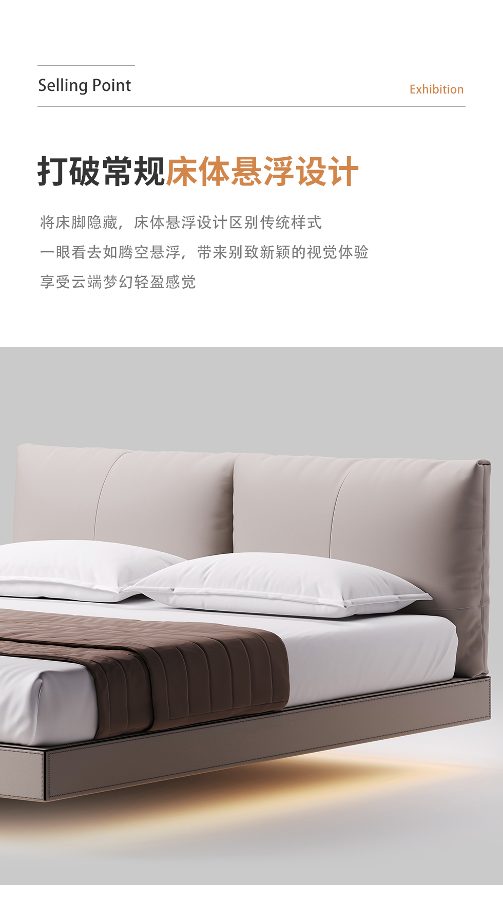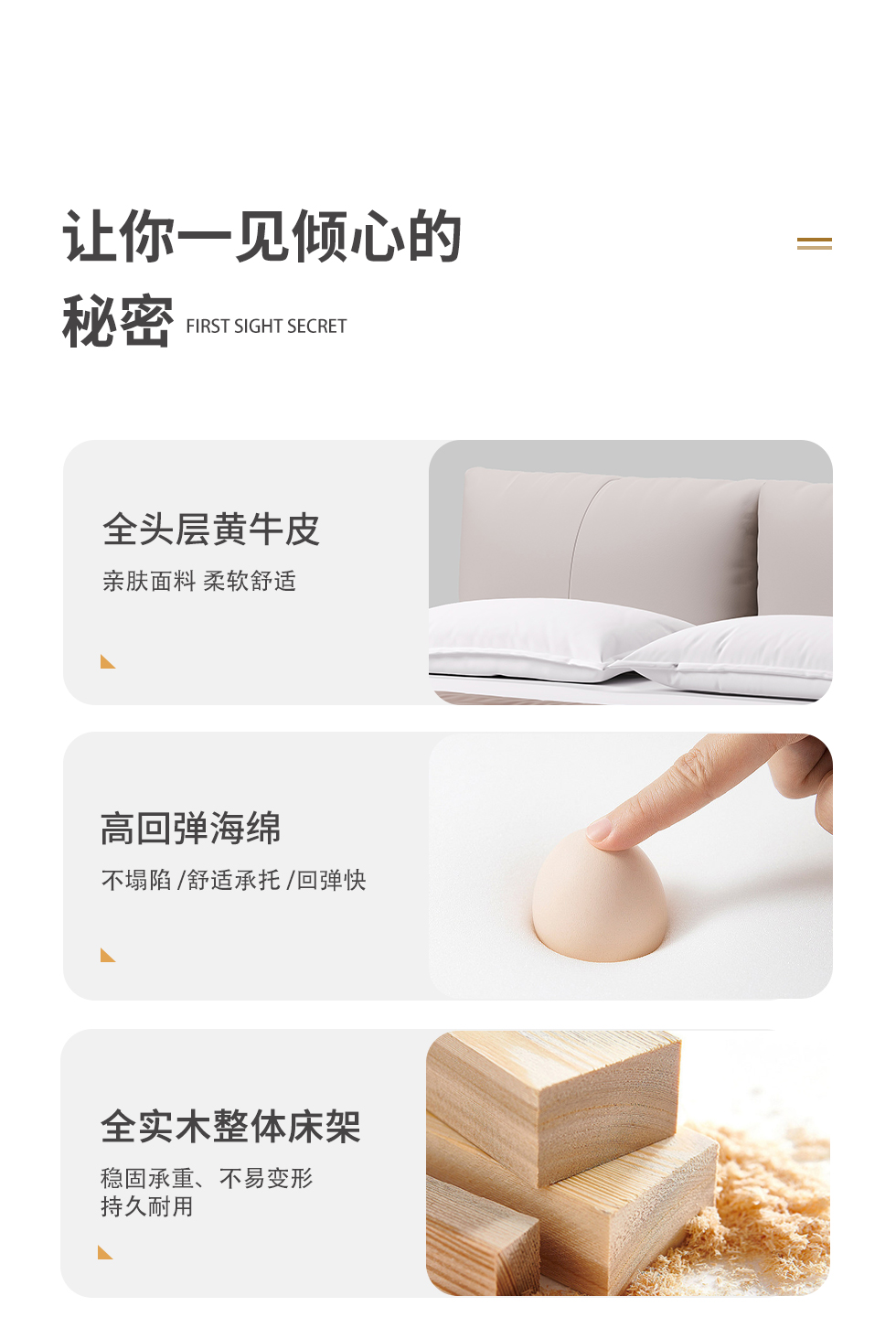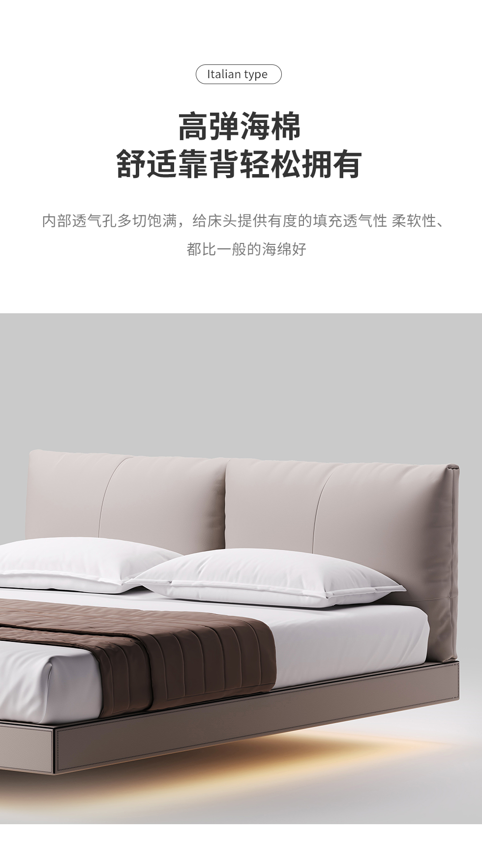 德卡图 现代简约 全头层黄牛皮 全实木整体床架俄罗斯落叶松+多层板+高弹海棉+紫罗兰海棉 1.5*2.0米悬浮床