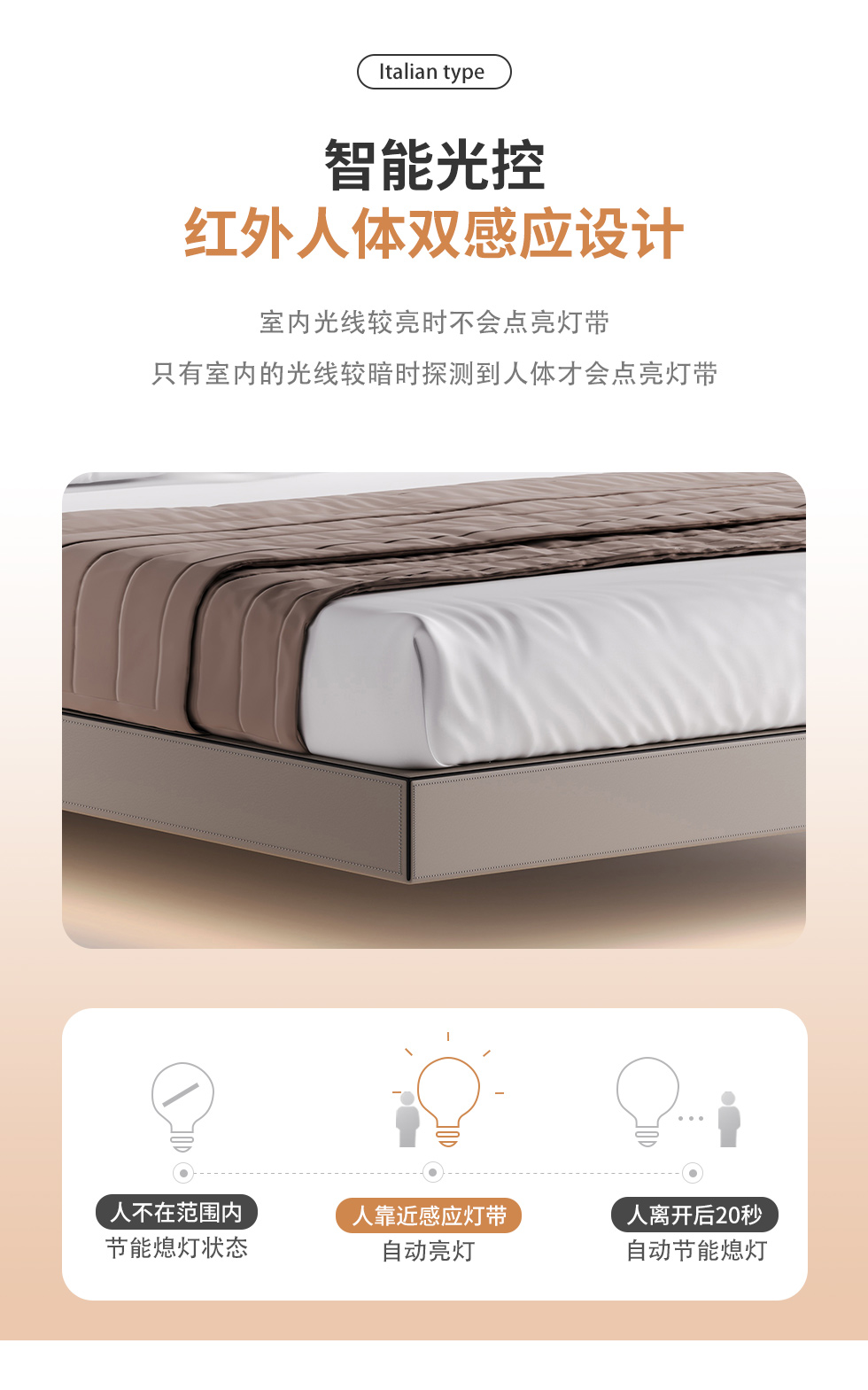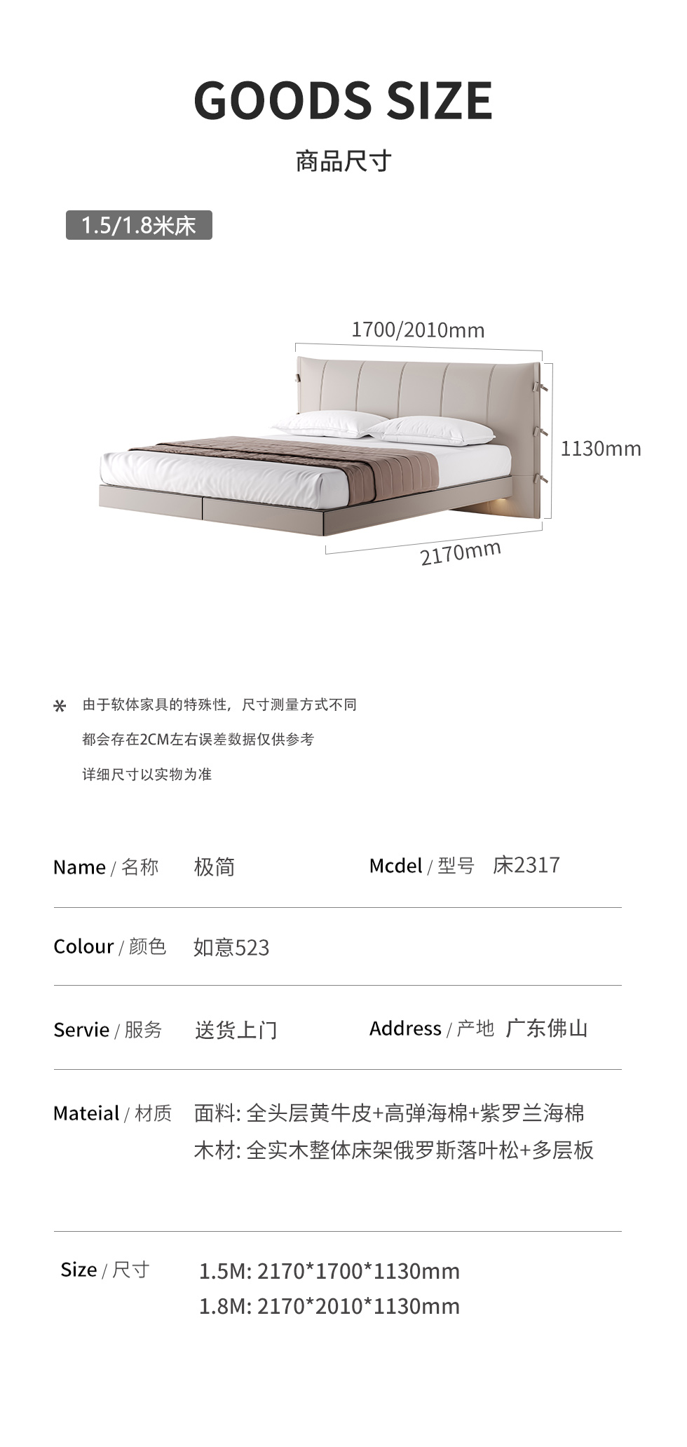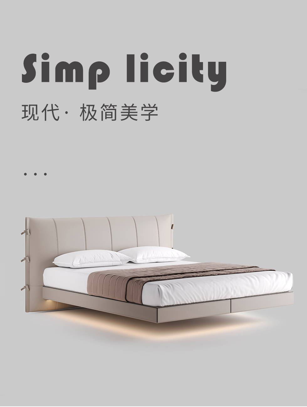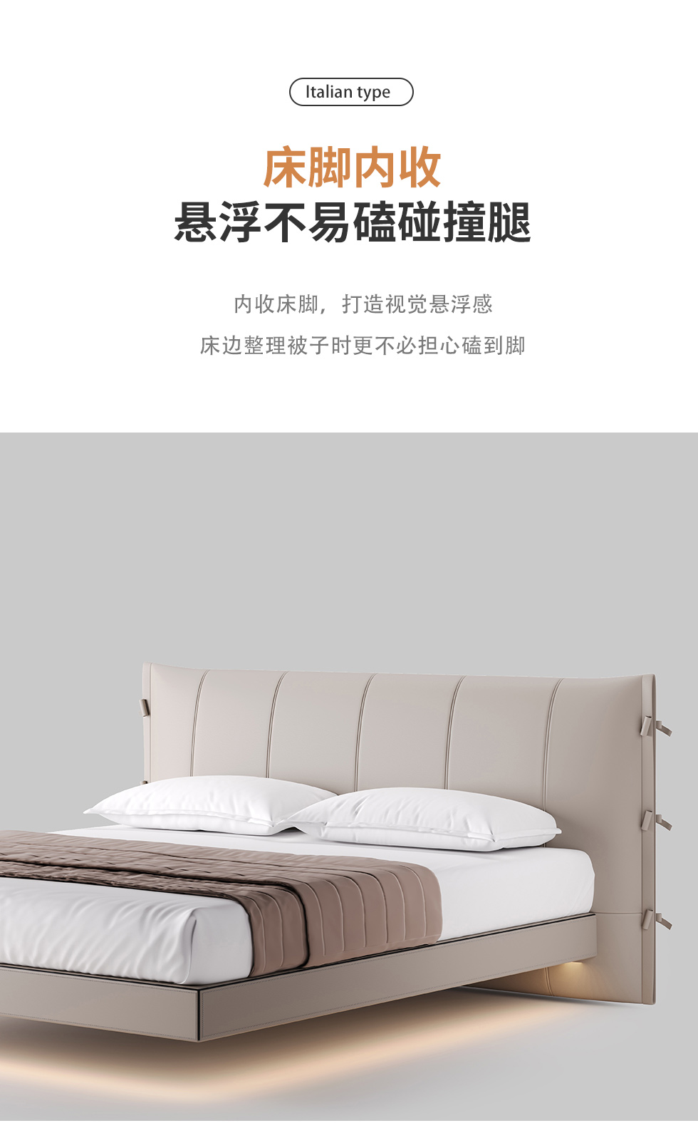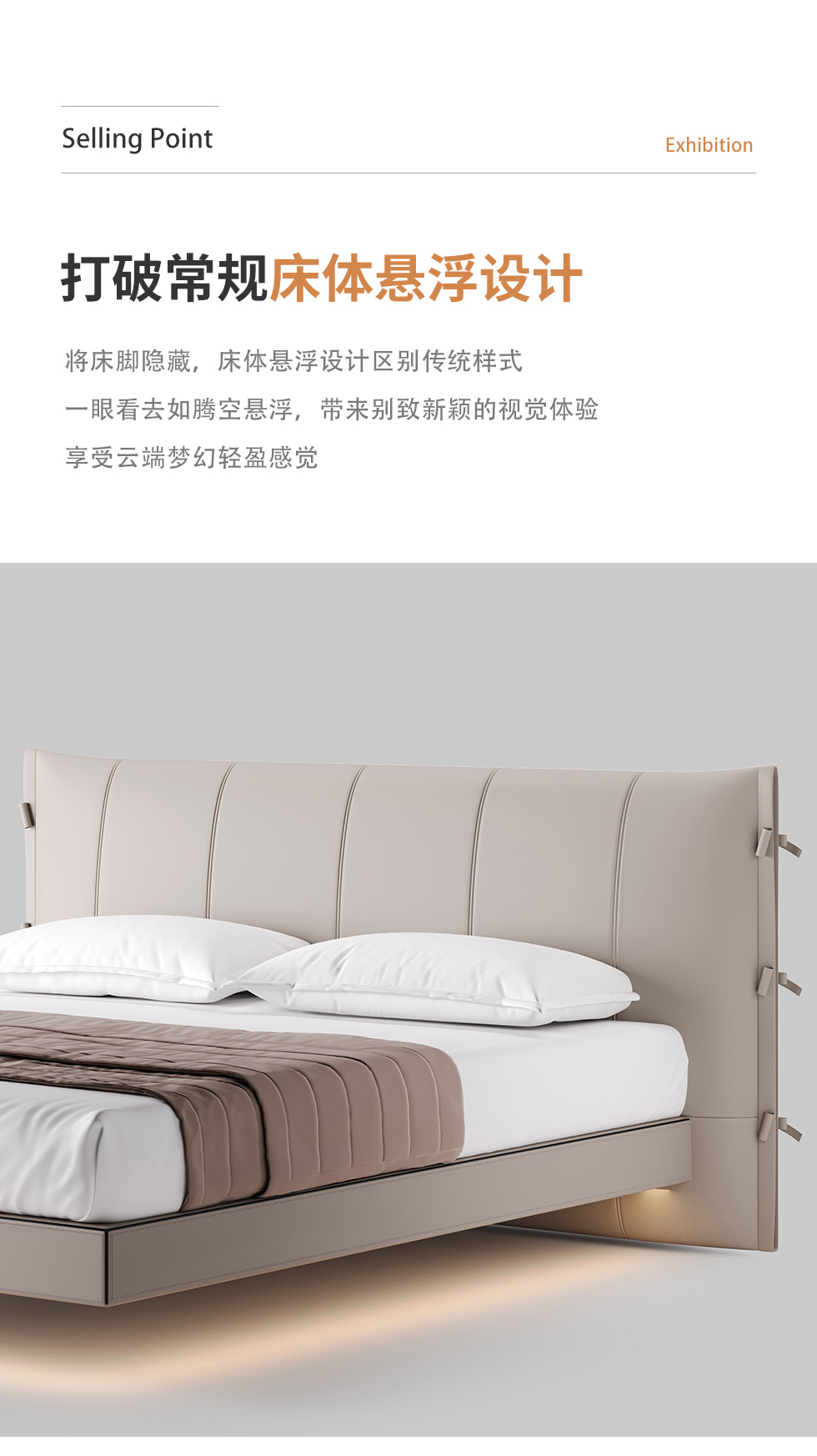 德卡图 现代简约 全头层黄牛皮 全实木整体床架俄罗斯落叶松+多层板+高弹海棉+紫罗兰海棉 1.8*2.0米悬浮床
