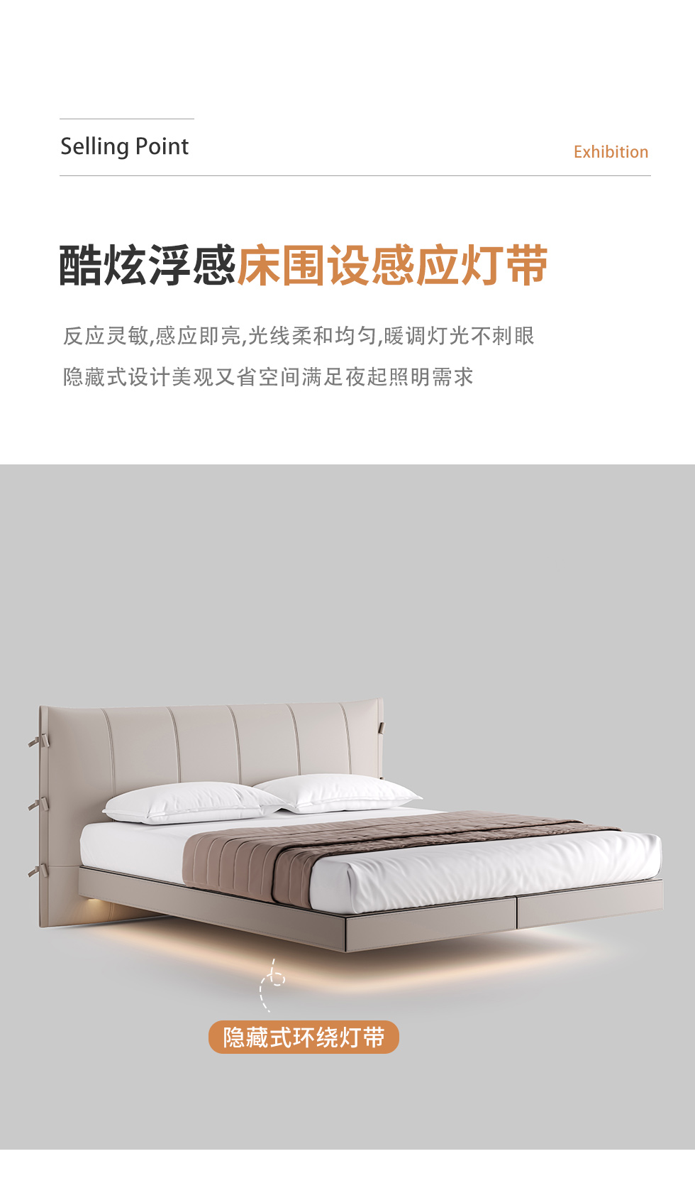 德卡图 现代简约 全头层黄牛皮 全实木整体床架俄罗斯落叶松+多层板+高弹海棉+紫罗兰海棉 1.8*2.0米悬浮床¥11652