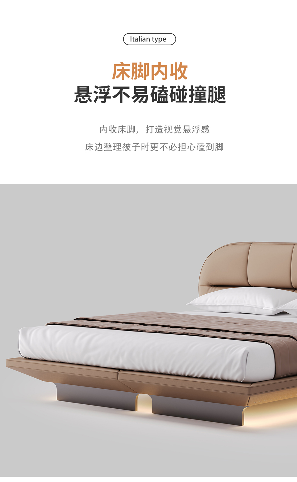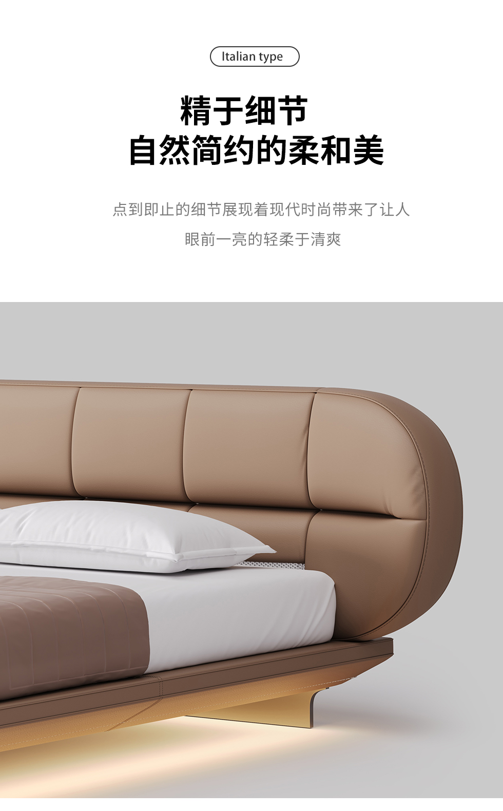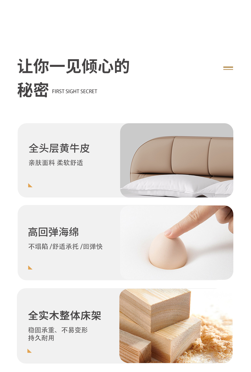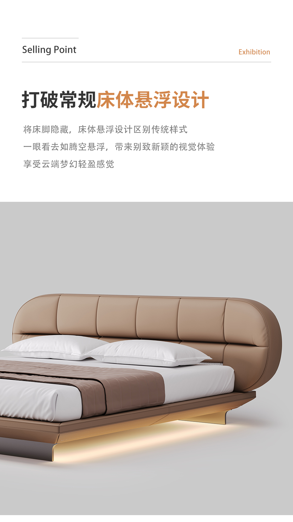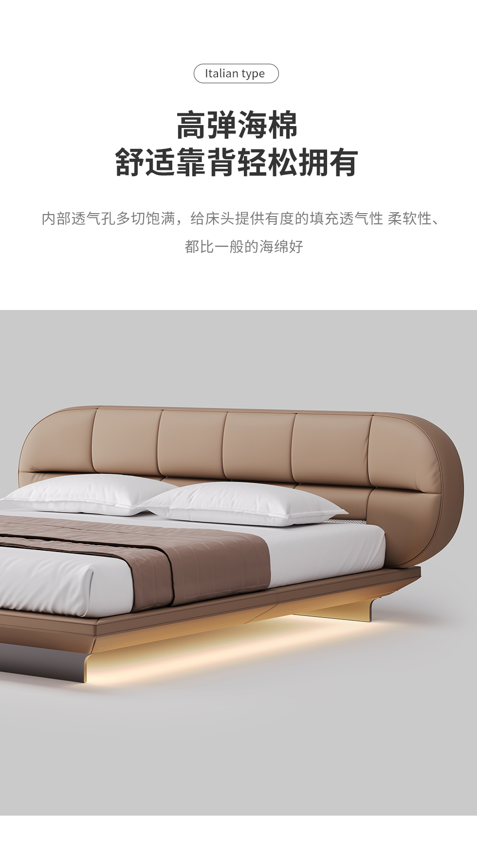 德卡图 现代简约 全头层黄牛皮 全实木整体床架俄罗斯落叶松+多层板+高弹海棉+紫罗兰海棉 1.8*2.0米悬浮床