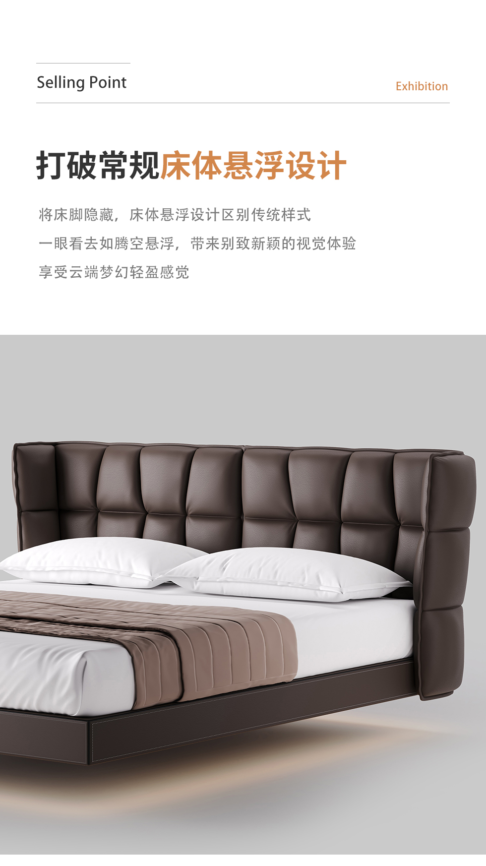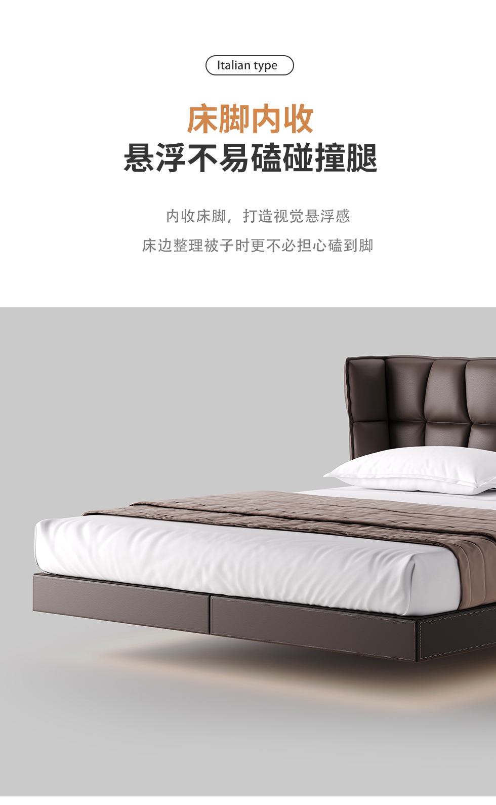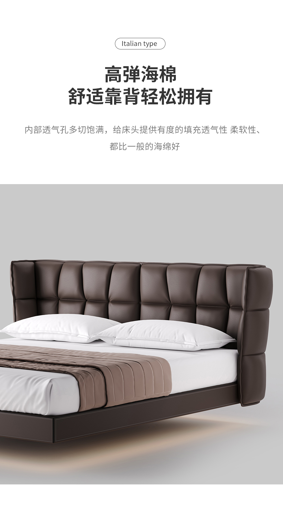 德卡图 现代简约 全头层黄牛皮 全实木整体床架俄罗斯落叶松+多层板+高弹海棉+紫罗兰海棉 1.8*2.0米悬浮床¥11652