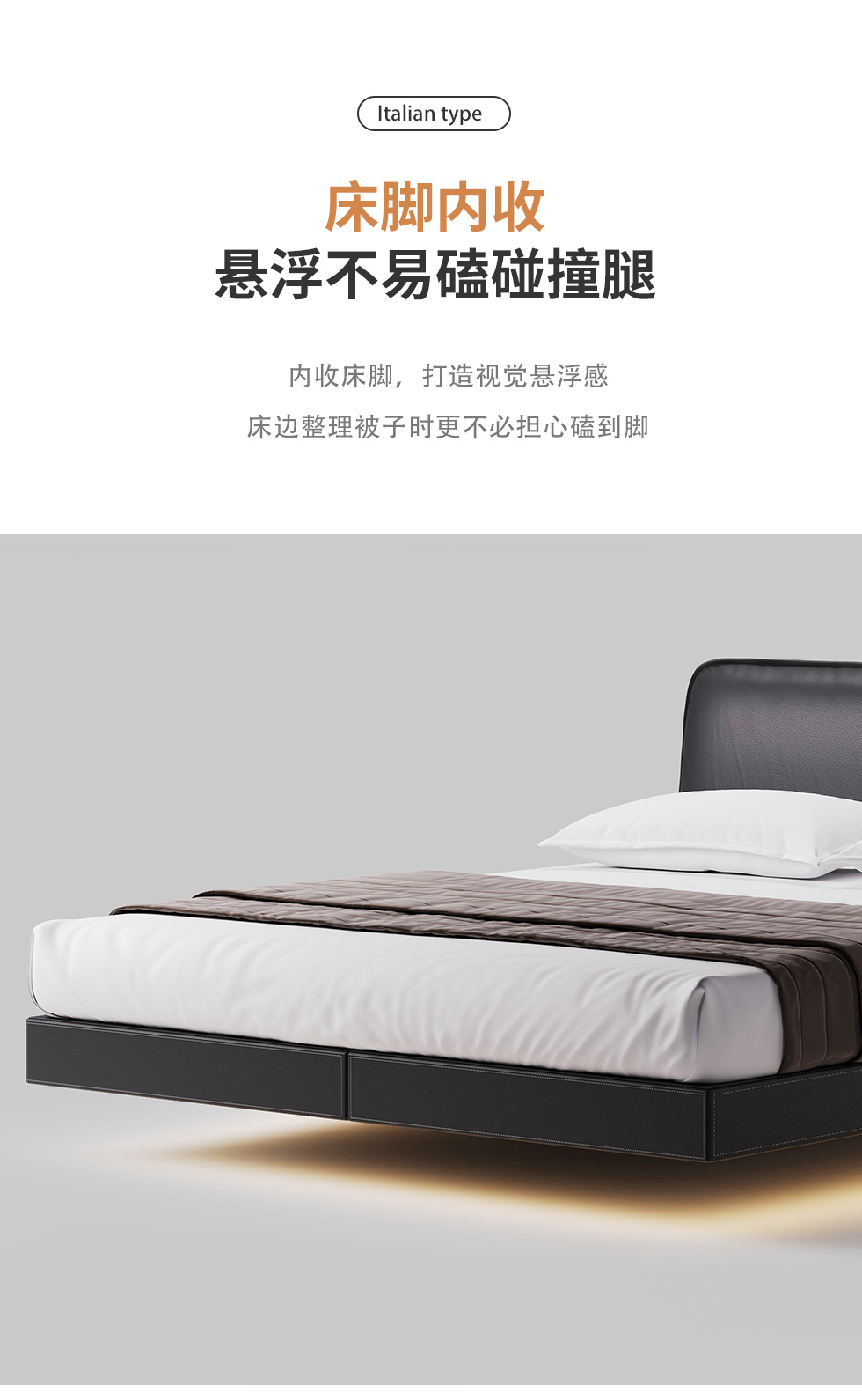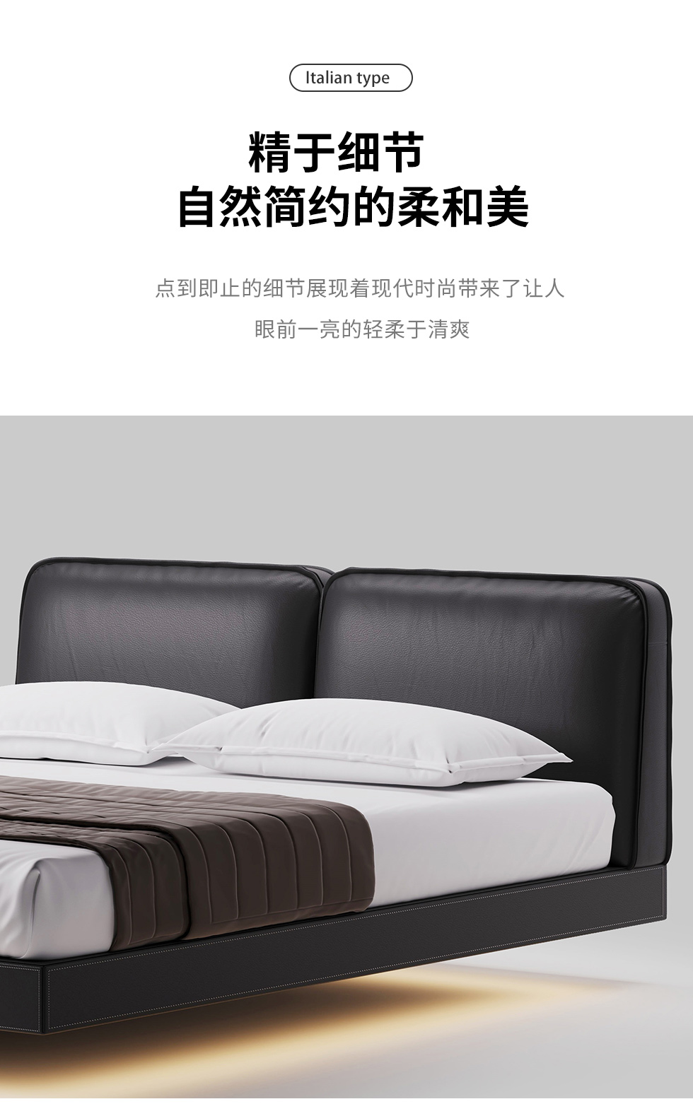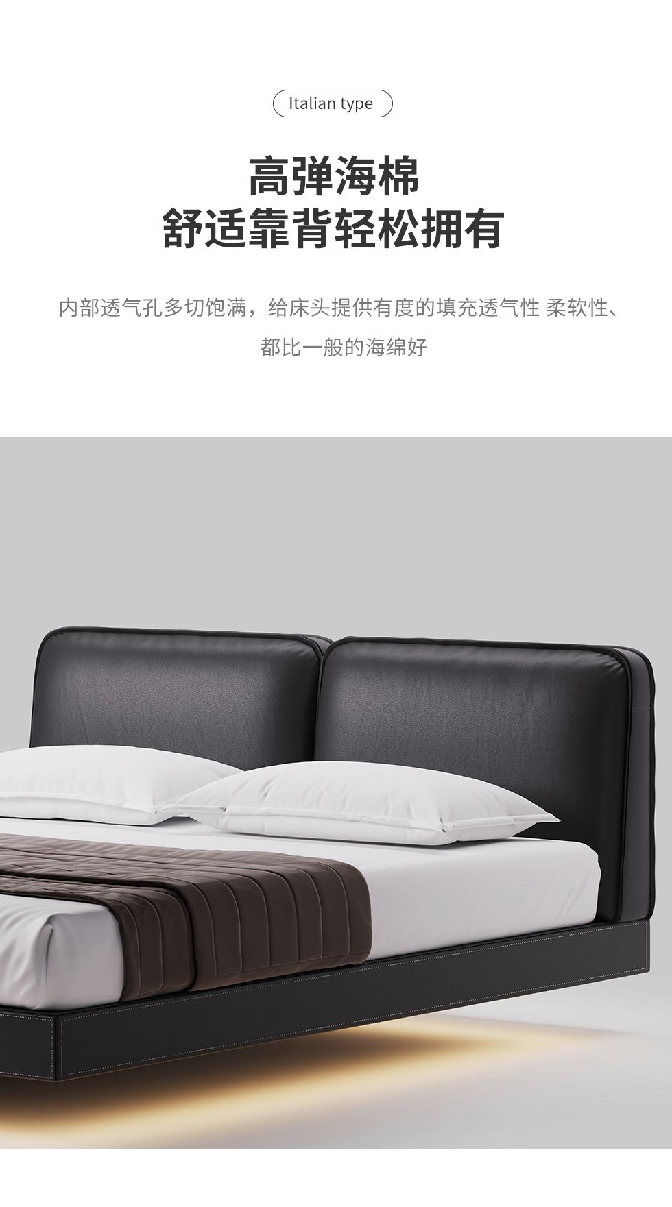 德卡图 现代简约 全头层黄牛皮 全实木整体床架俄罗斯落叶松+多层板+高弹海棉+紫罗兰海棉 1.8*2.0米悬浮床¥11652