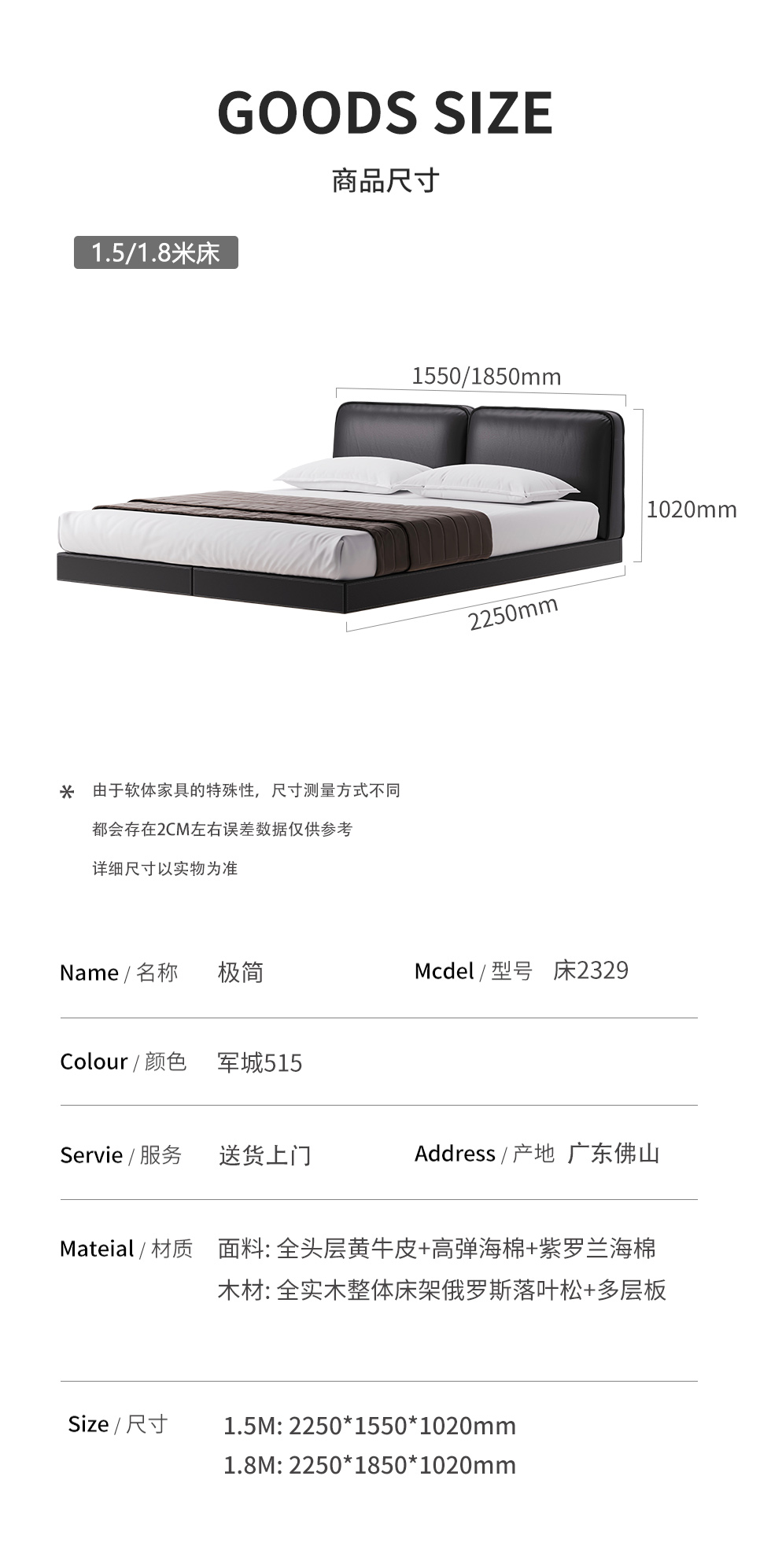 德卡图 现代简约 全头层黄牛皮 +棉麻布全实木整体床架俄罗斯落叶松+多层板+高弹海棉+紫罗兰海棉 1.8*2.0米悬浮床| 商品详情 | 规格参数 | 评价(0) | 购买咨询() | 产品实拍图 | 服务标准 |