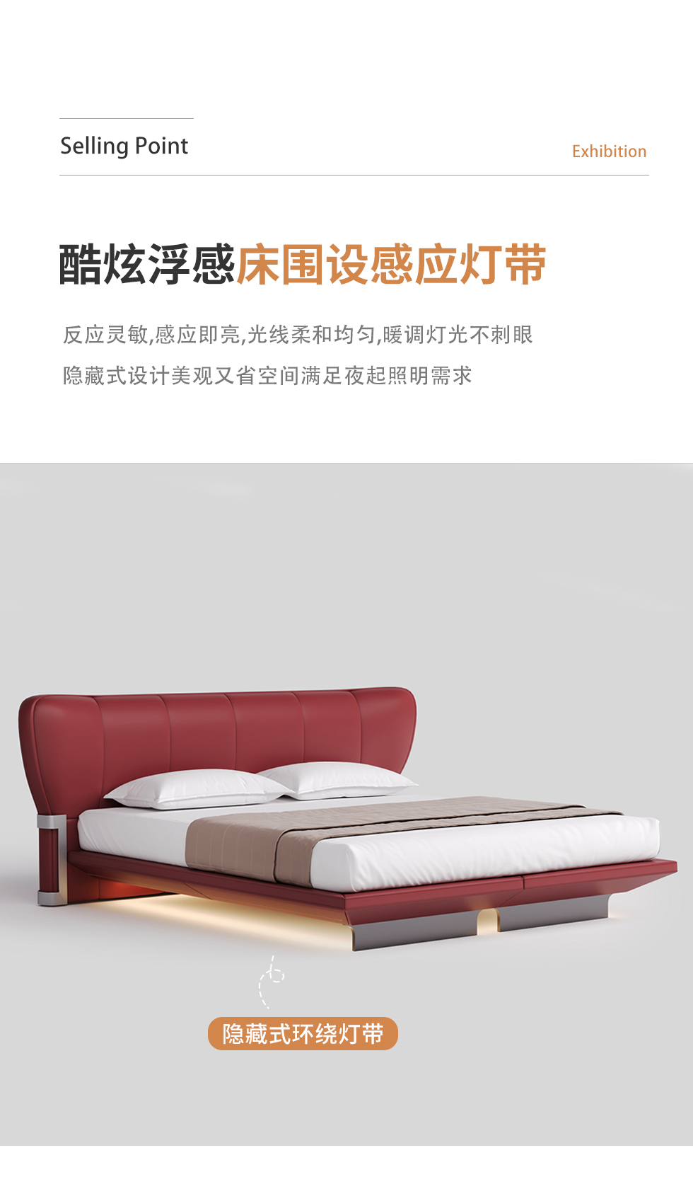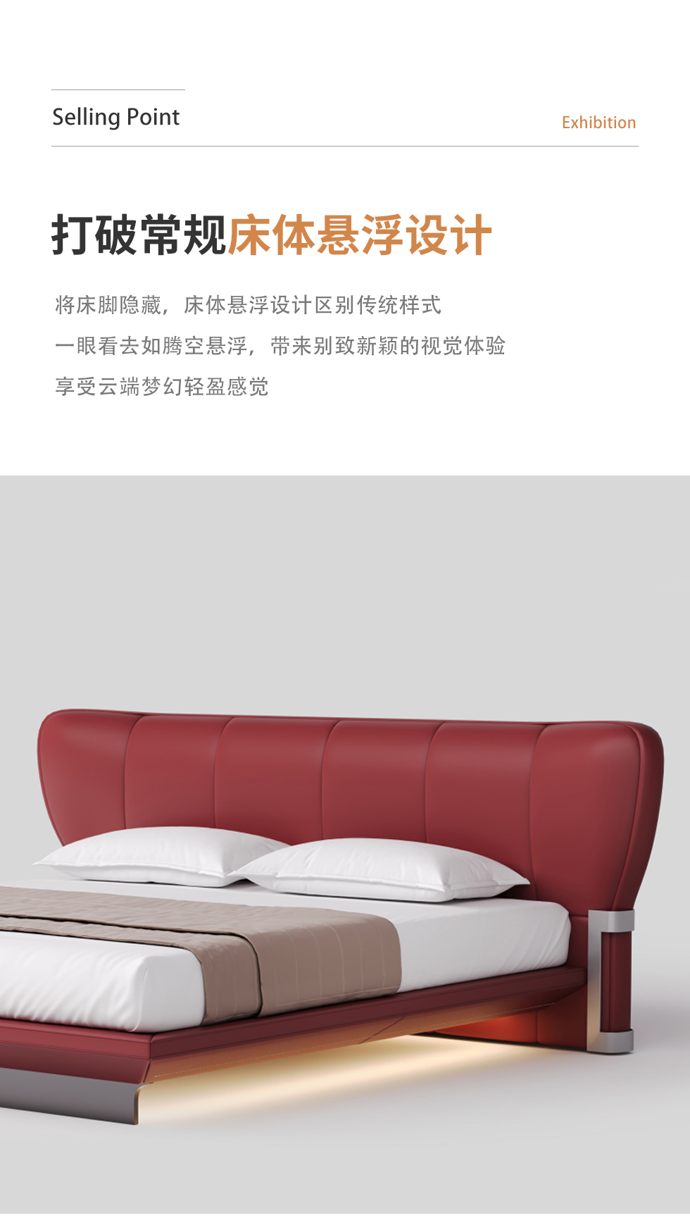 德卡图 现代简约 全头层黄牛皮 全实木整体床架俄罗斯落叶松+多层板+高弹海棉+紫罗兰海棉 1.8*2.0米悬浮床¥7314