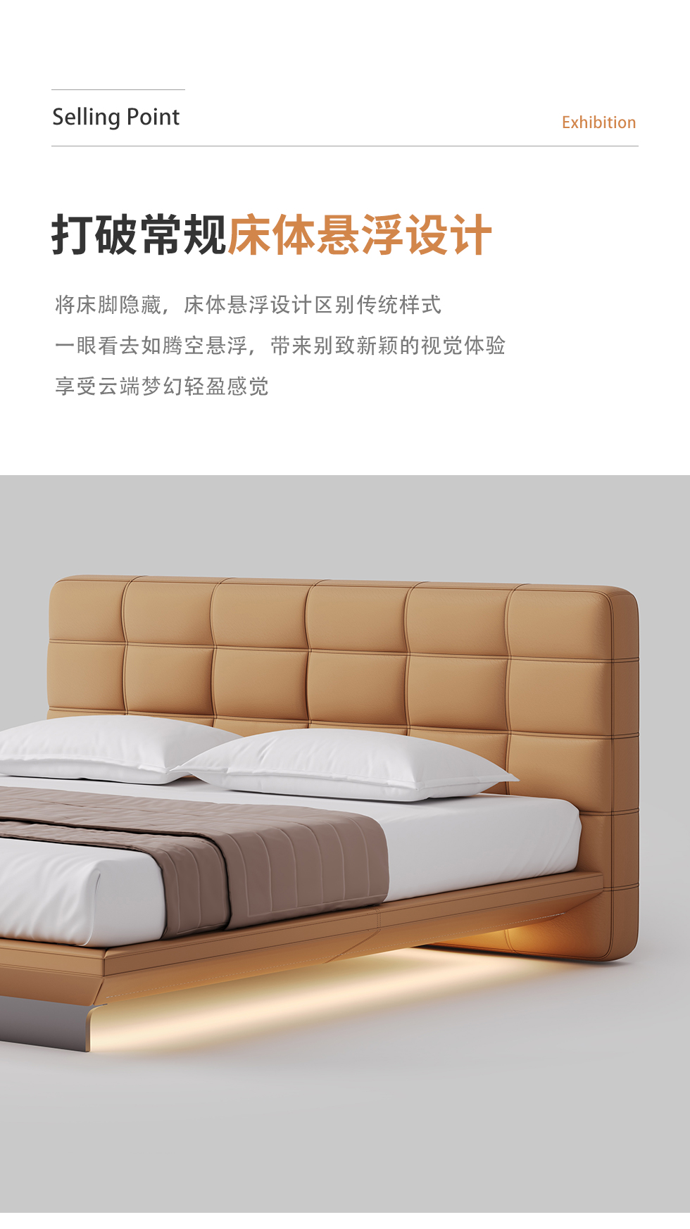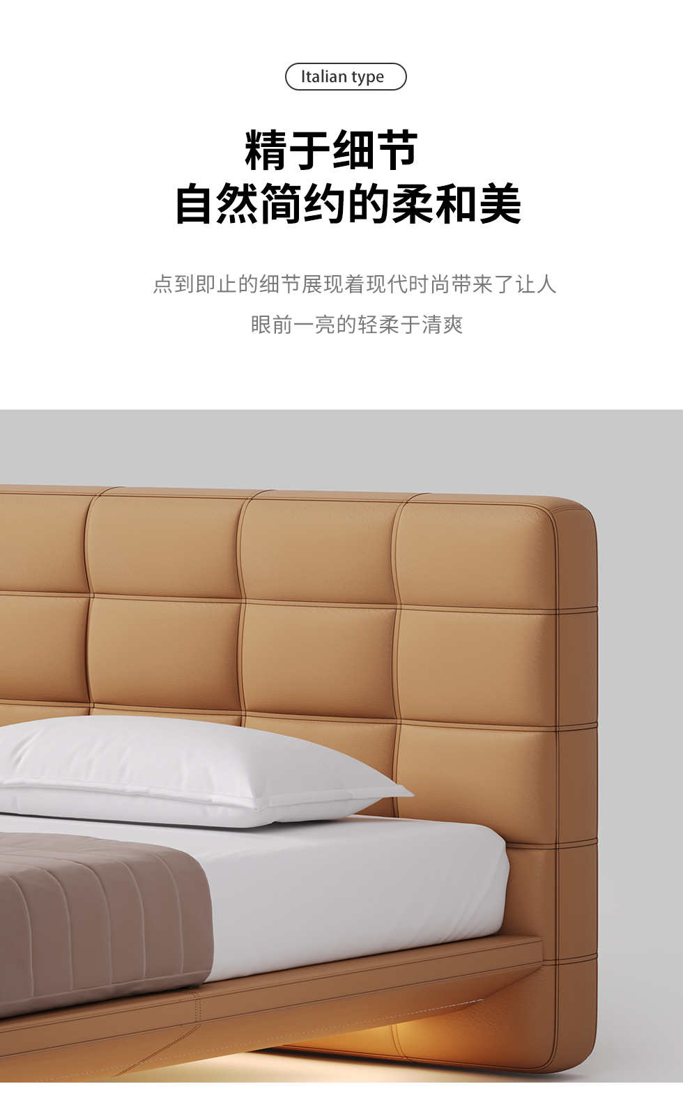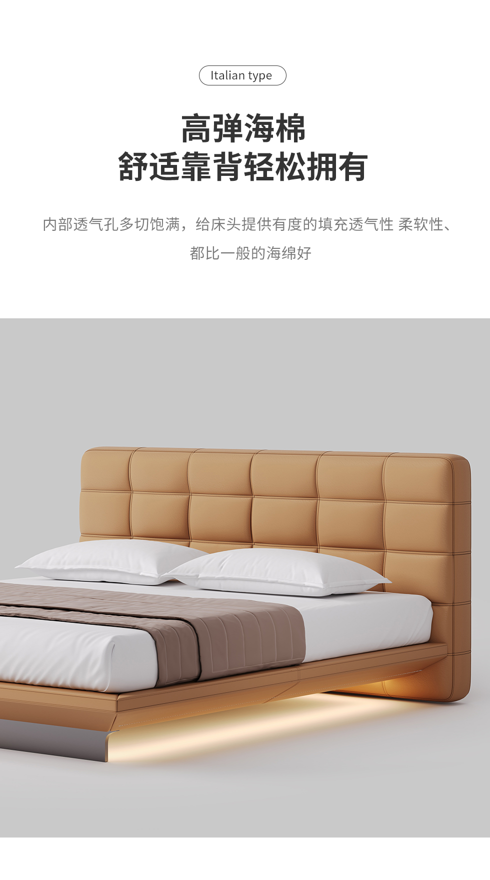德卡图 现代简约 全头层黄牛皮 全实木整体床架俄罗斯落叶松+多层板+高弹海棉+紫罗兰海棉 1.8*2.0米悬浮床