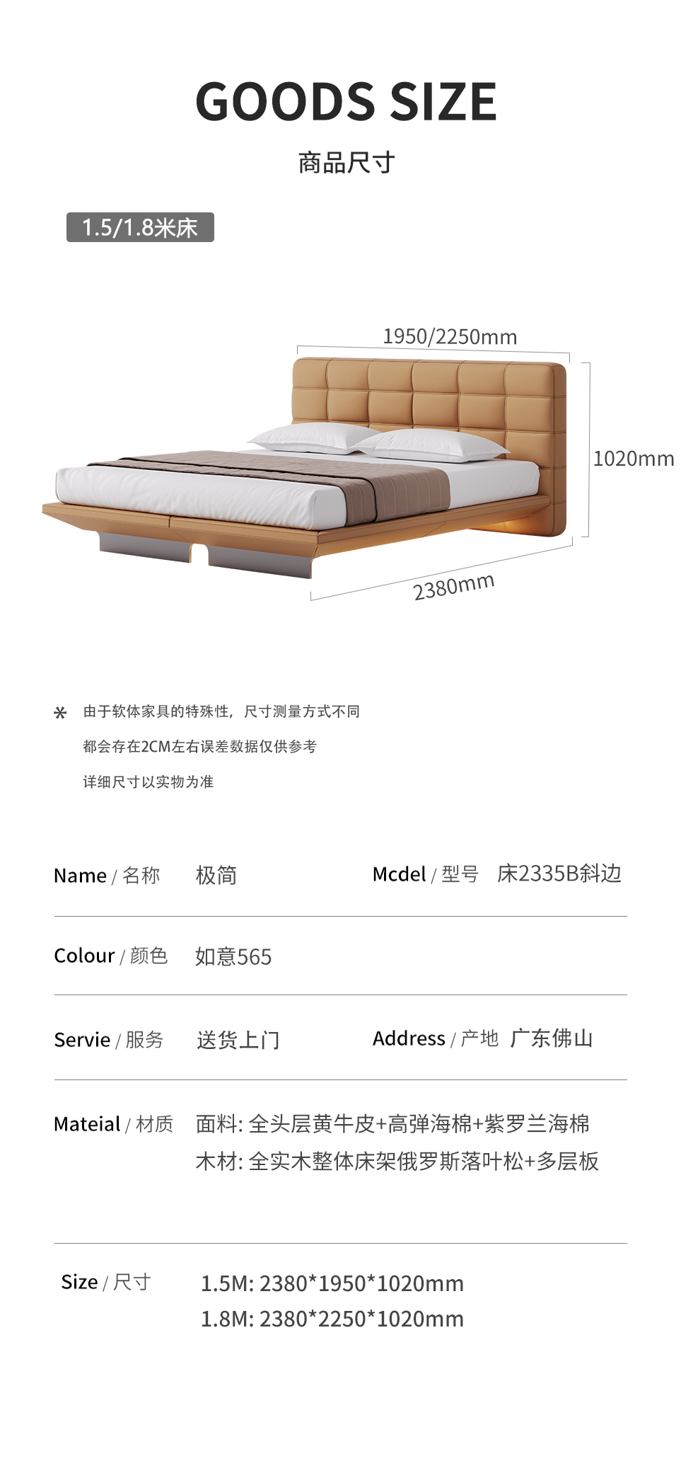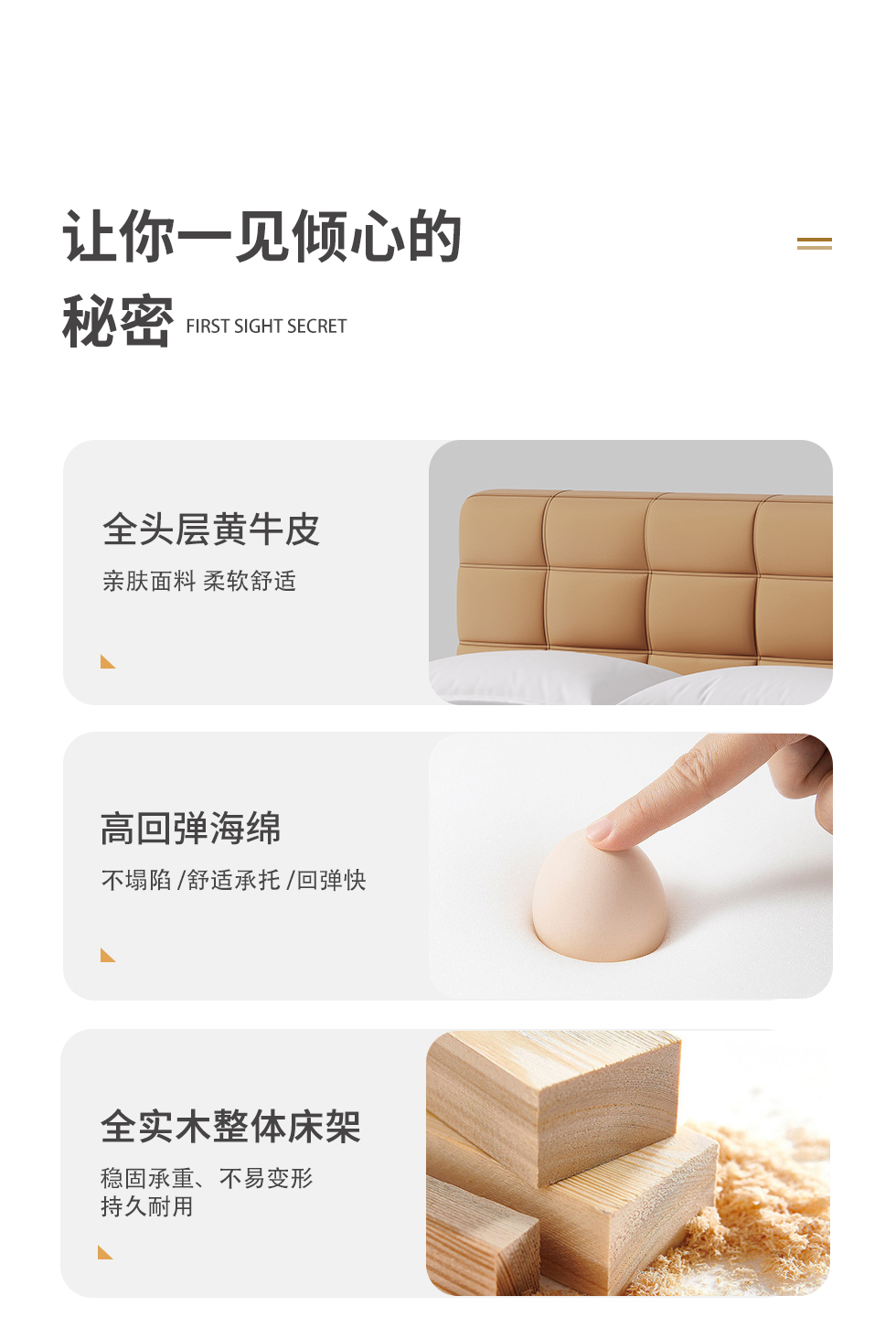 德卡图 现代简约 全头层黄牛皮 全实木整体床架俄罗斯落叶松+多层板+高弹海棉+紫罗兰海棉 1.8*2.0米悬浮床¥6505