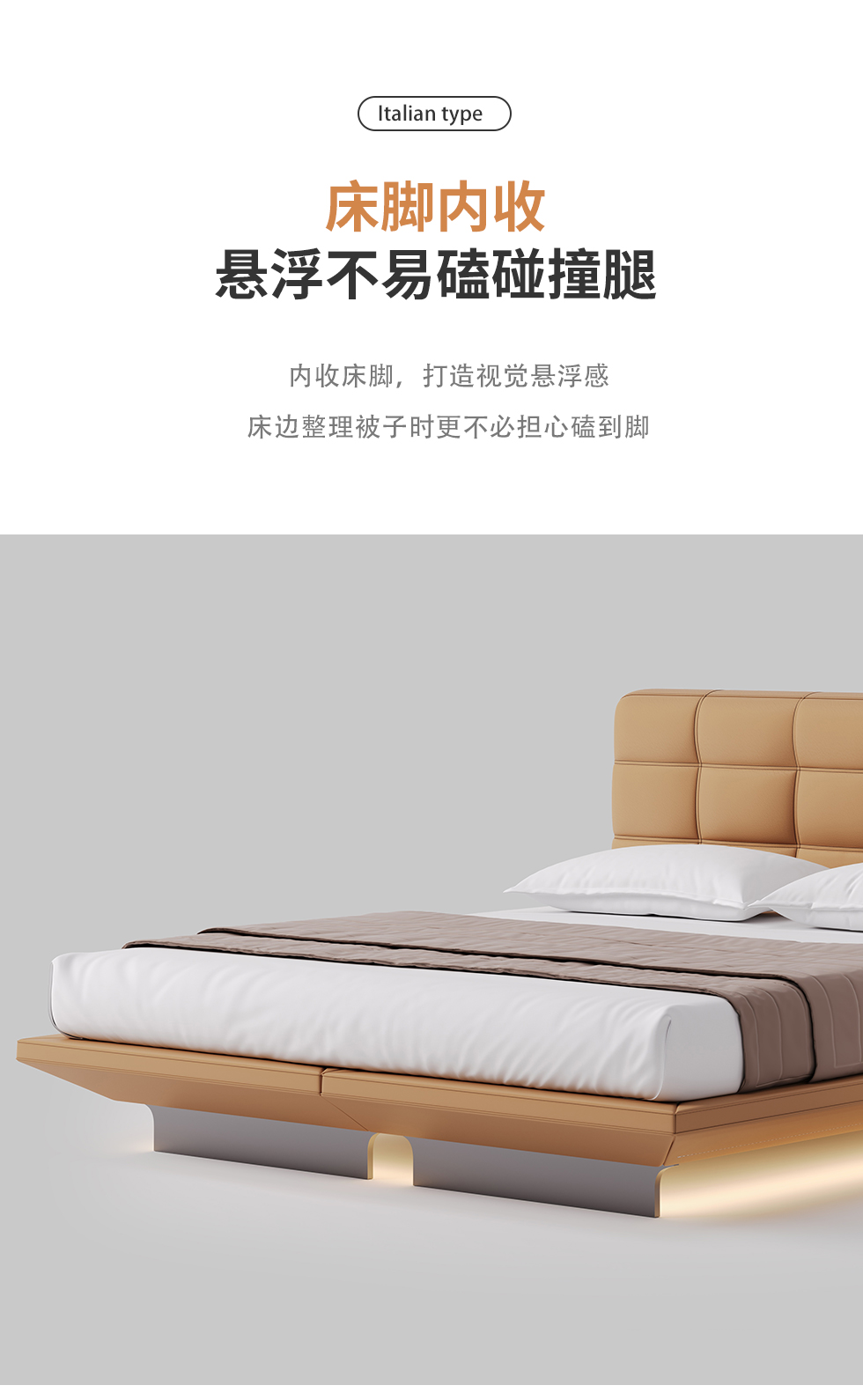 德卡图 现代简约 全头层黄牛皮 全实木整体床架俄罗斯落叶松+多层板+高弹海棉+紫罗兰海棉 1.8*2.0米悬浮床¥10841