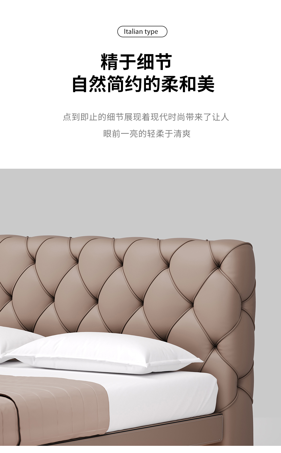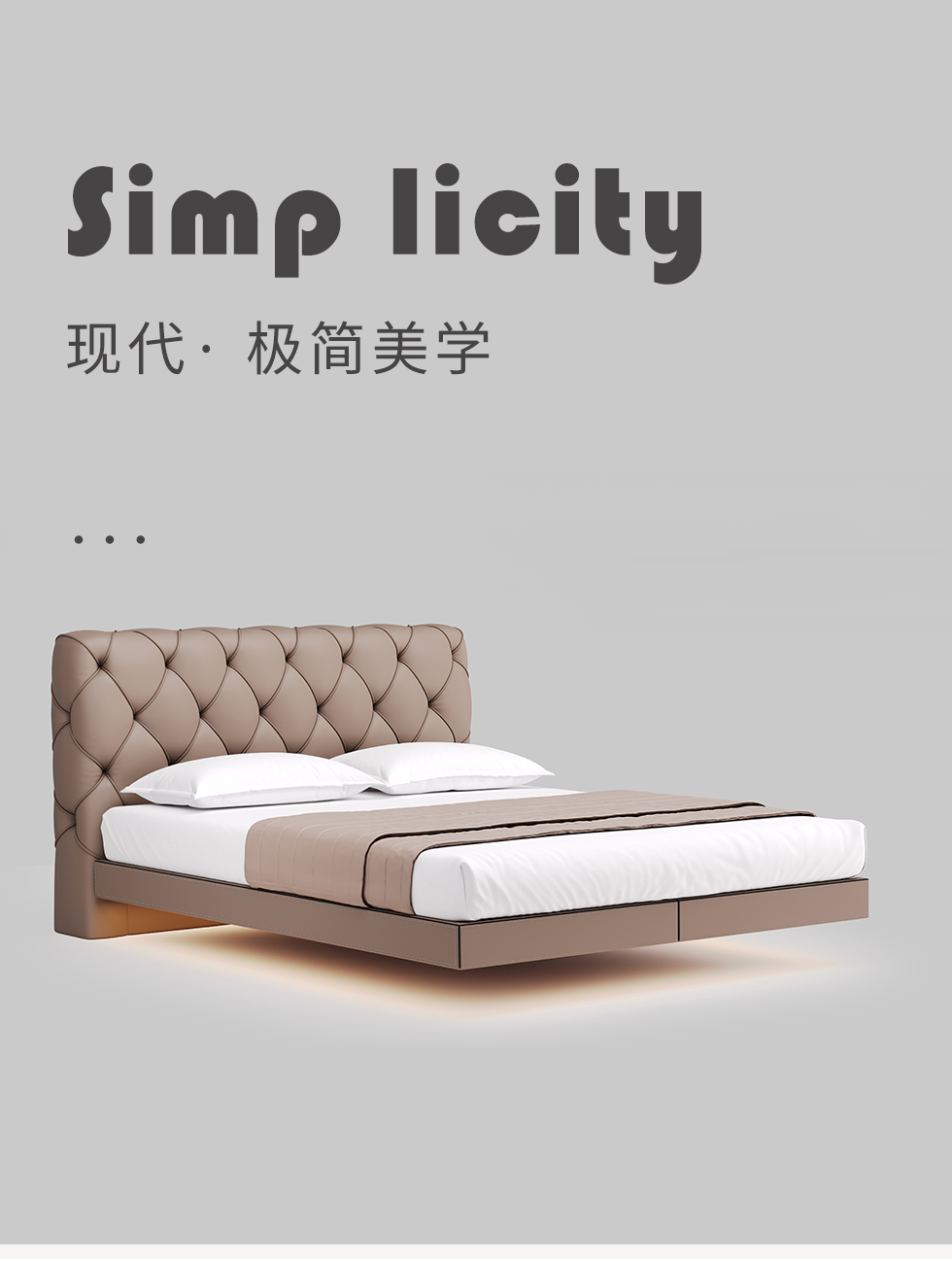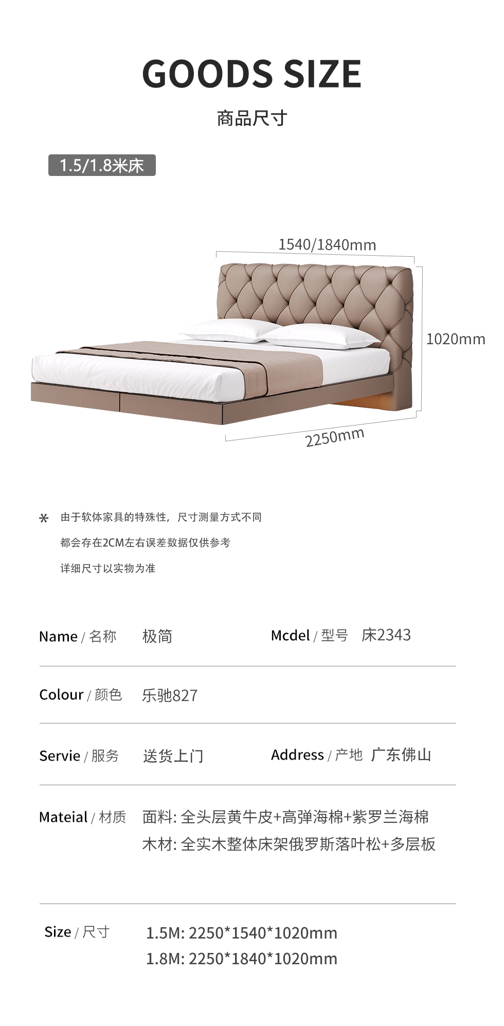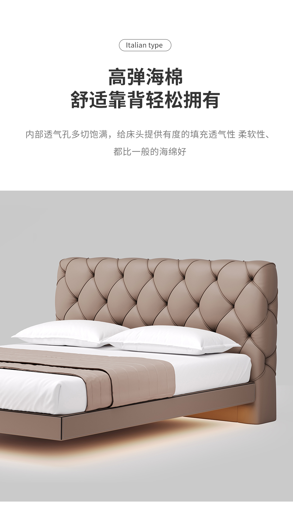 德卡图 现代简约 全头层黄牛皮 全实木整体床架俄罗斯落叶松+多层板+高弹海棉+紫罗兰海棉 1.8*2.0米悬浮床¥6505