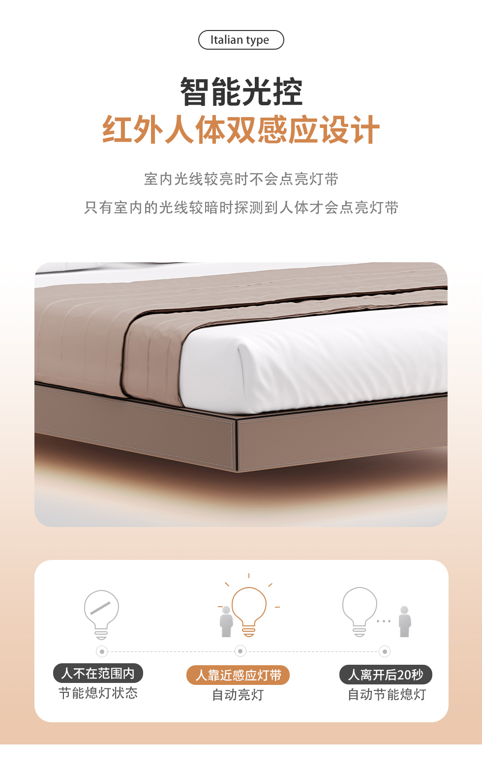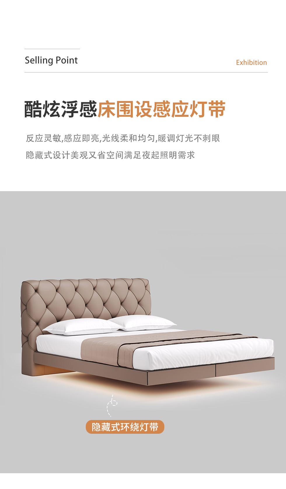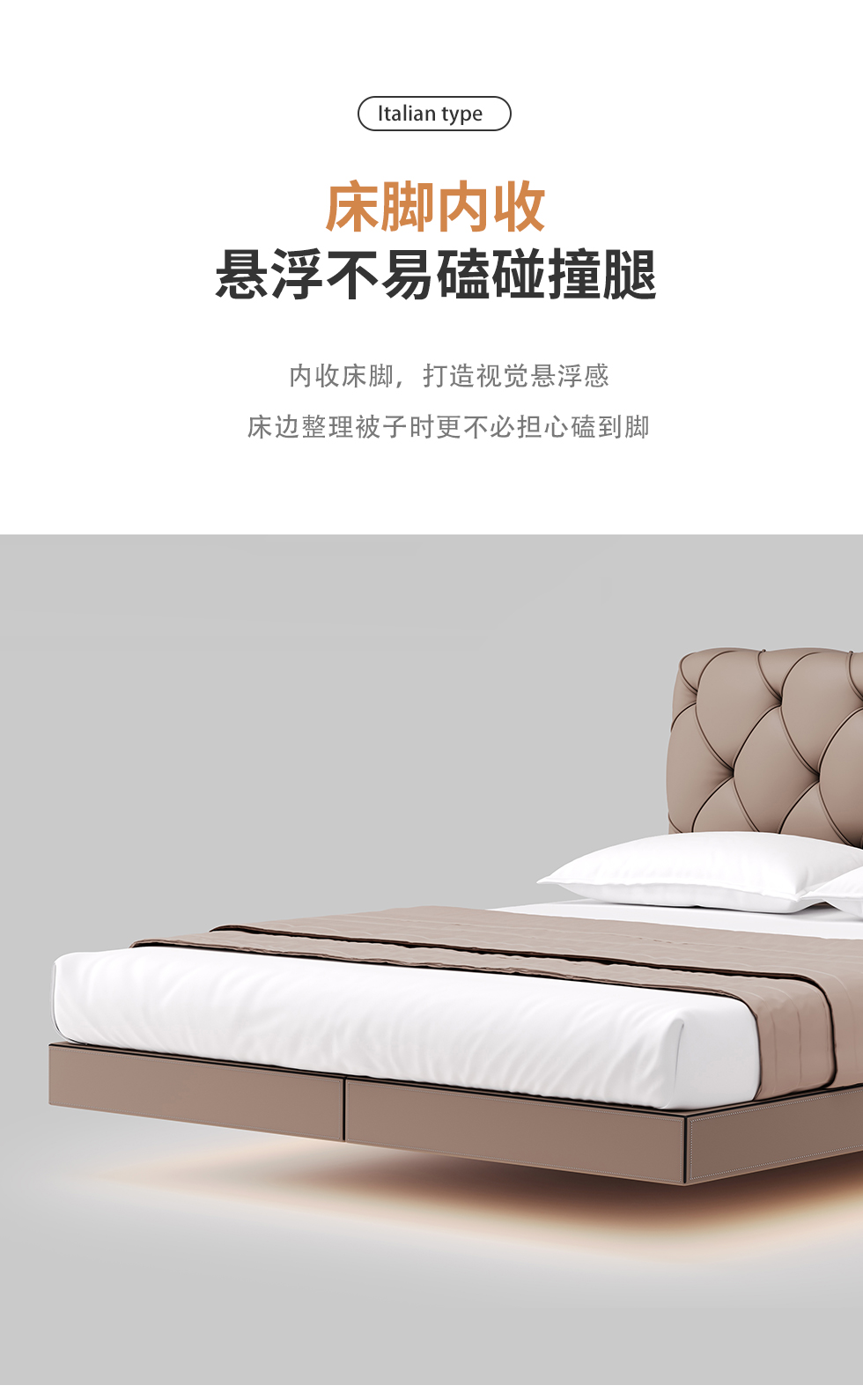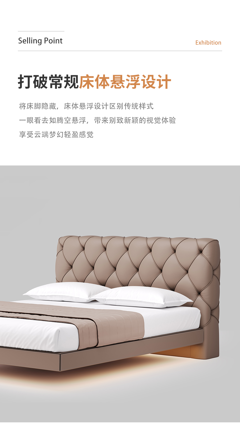 德卡图 现代简约 全头层黄牛皮 全实木整体床架俄罗斯落叶松+多层板+高弹海棉+紫罗兰海棉 1.8*2.0米悬浮床¥10841