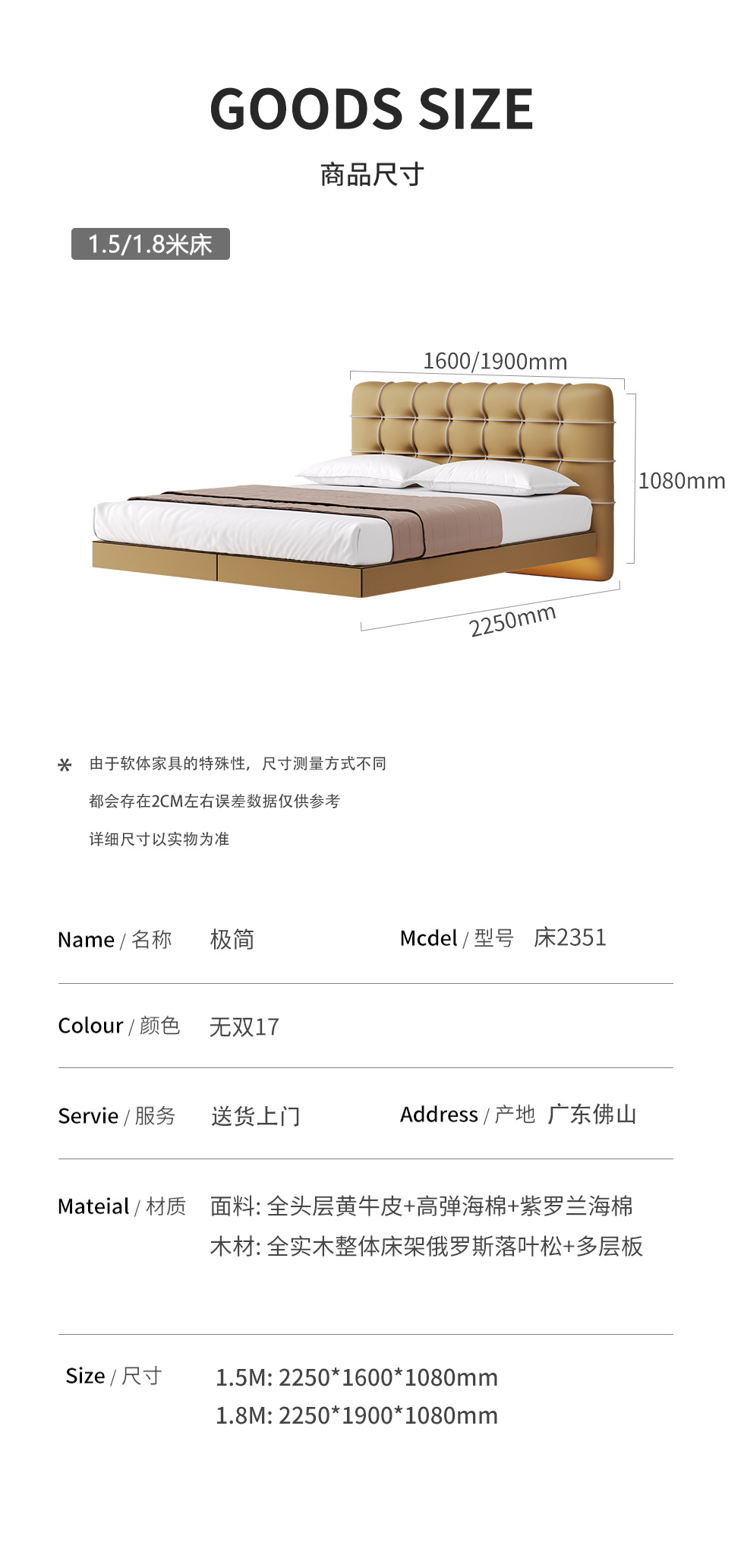德卡图 现代简约 全头层黄牛皮 全实木整体床架俄罗斯落叶松+多层板+高弹海棉+紫罗兰海棉 1.8*2.0米悬浮床| 商品详情 | 规格参数 | 评价(0) | 购买咨询() | 产品实拍图 | 服务标准 |