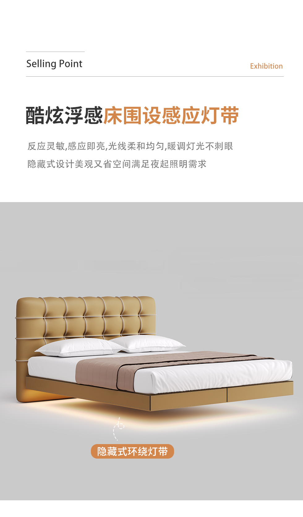 德卡图 现代简约 全头层黄牛皮 全实木整体床架俄罗斯落叶松+多层板+高弹海棉+紫罗兰海棉 1.8*2.0米悬浮床¥6505