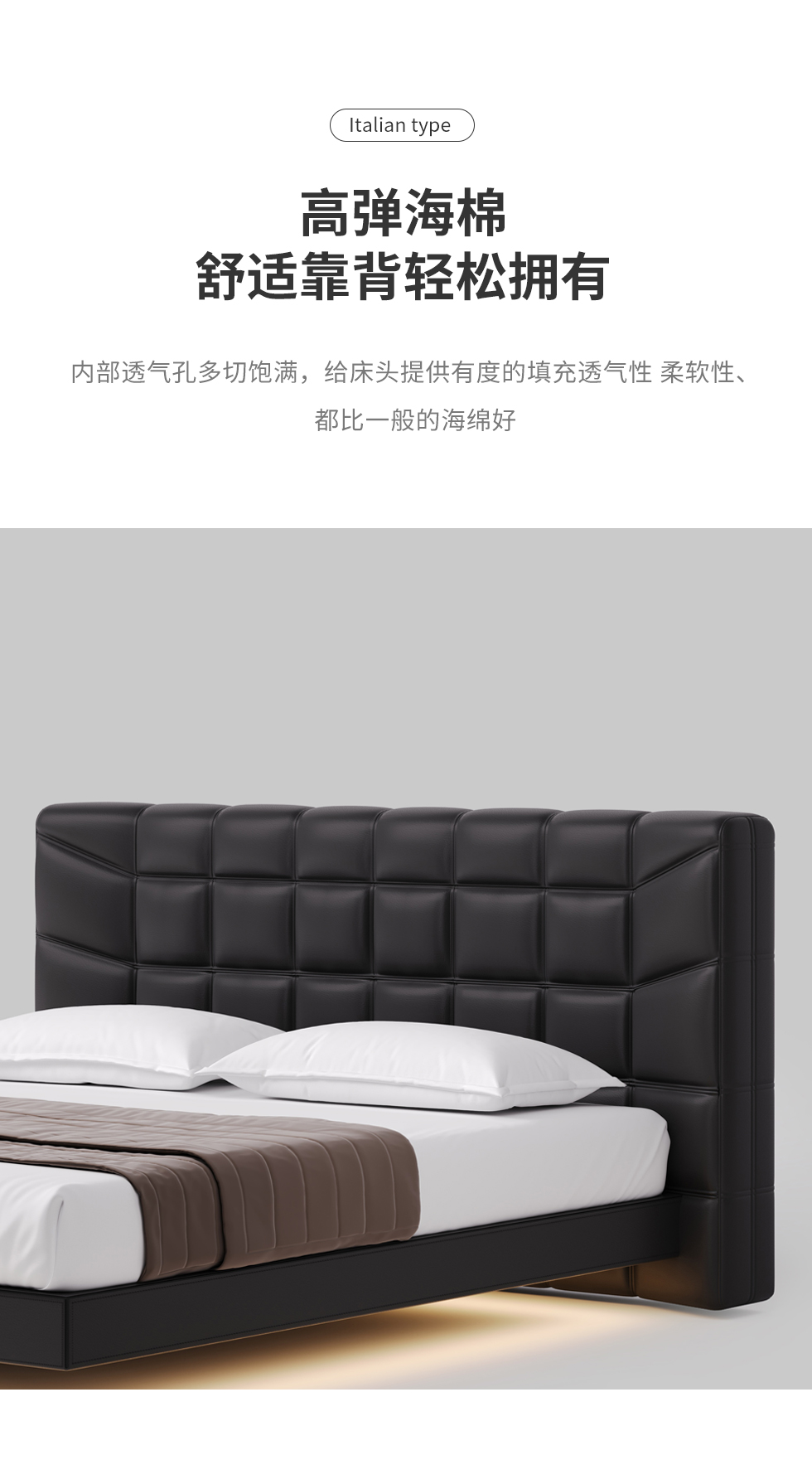 德卡图 现代简约 全头层黄牛皮 全实木整体床架俄罗斯落叶松+多层板+高弹海棉+紫罗兰海棉 1.8*2.0米悬浮床¥11652
