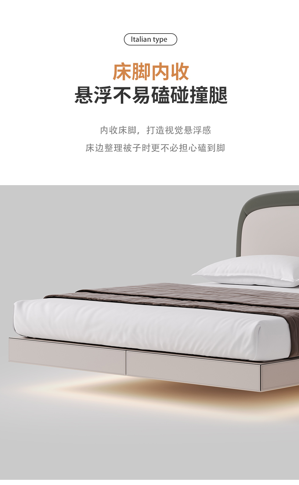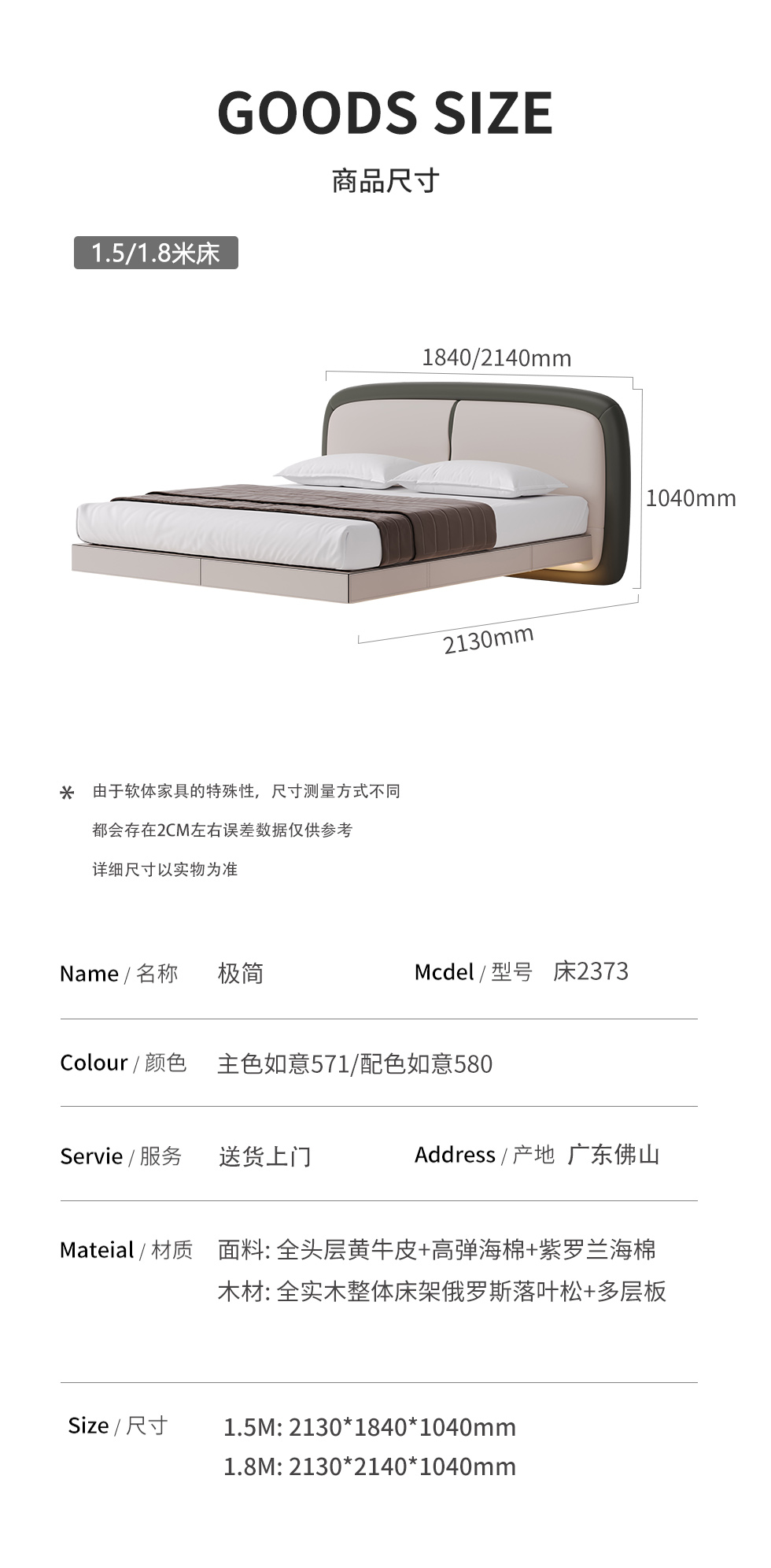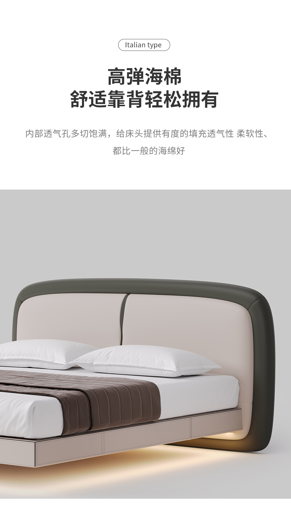 德卡图 现代简约 全头层黄牛皮 全实木整体床架俄罗斯落叶松+多层板+高弹海棉+紫罗兰海棉 1.8*2.0米悬浮床
