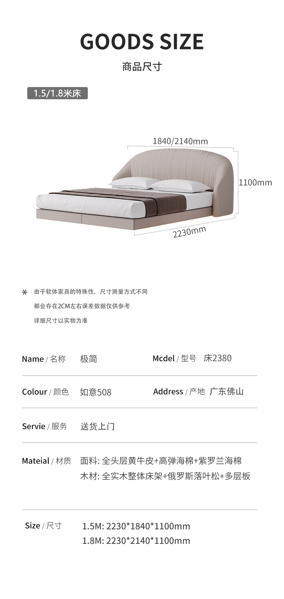 德卡图 现代简约 全头层黄牛皮 全实木整体床架俄罗斯落叶松+多层板+高弹海棉+紫罗兰海棉 1.8*2.0米悬浮床¥7044
