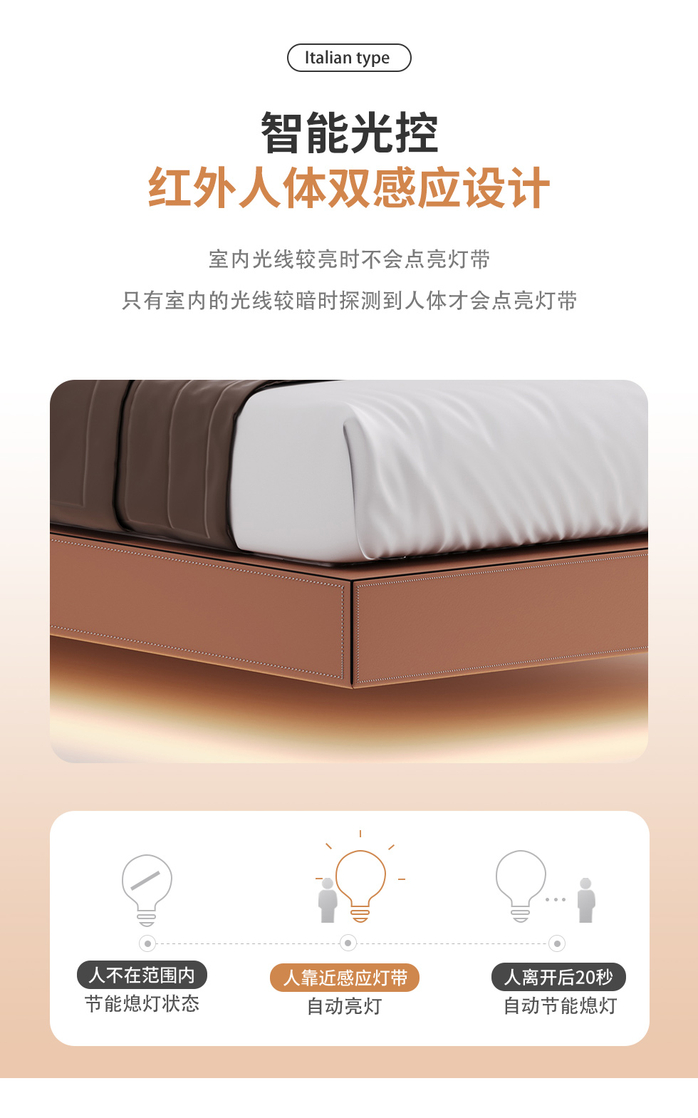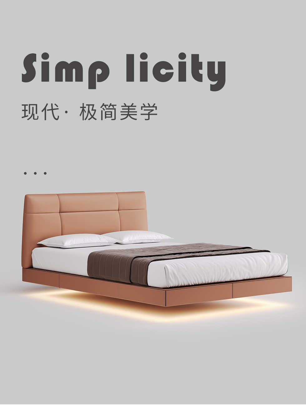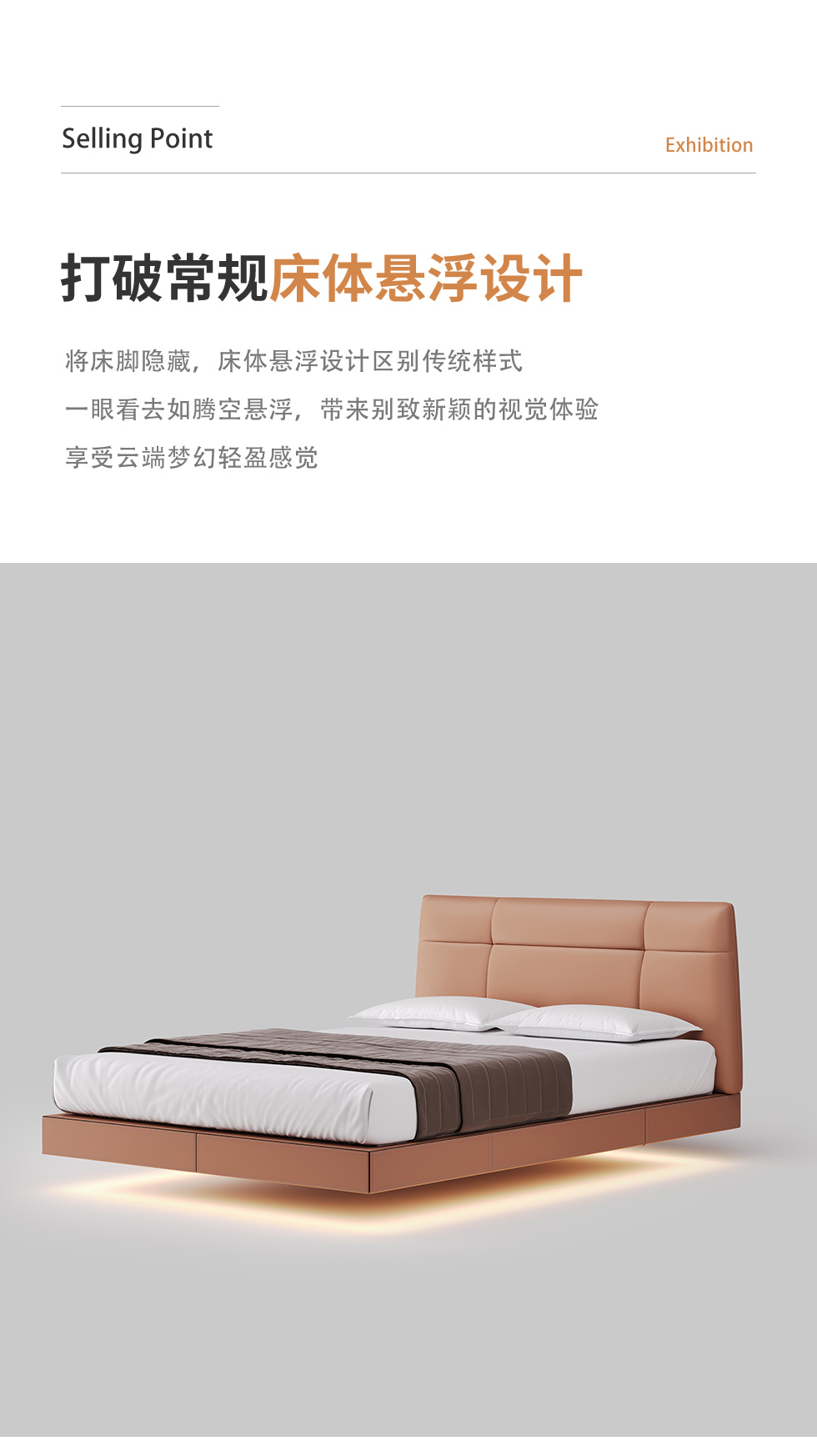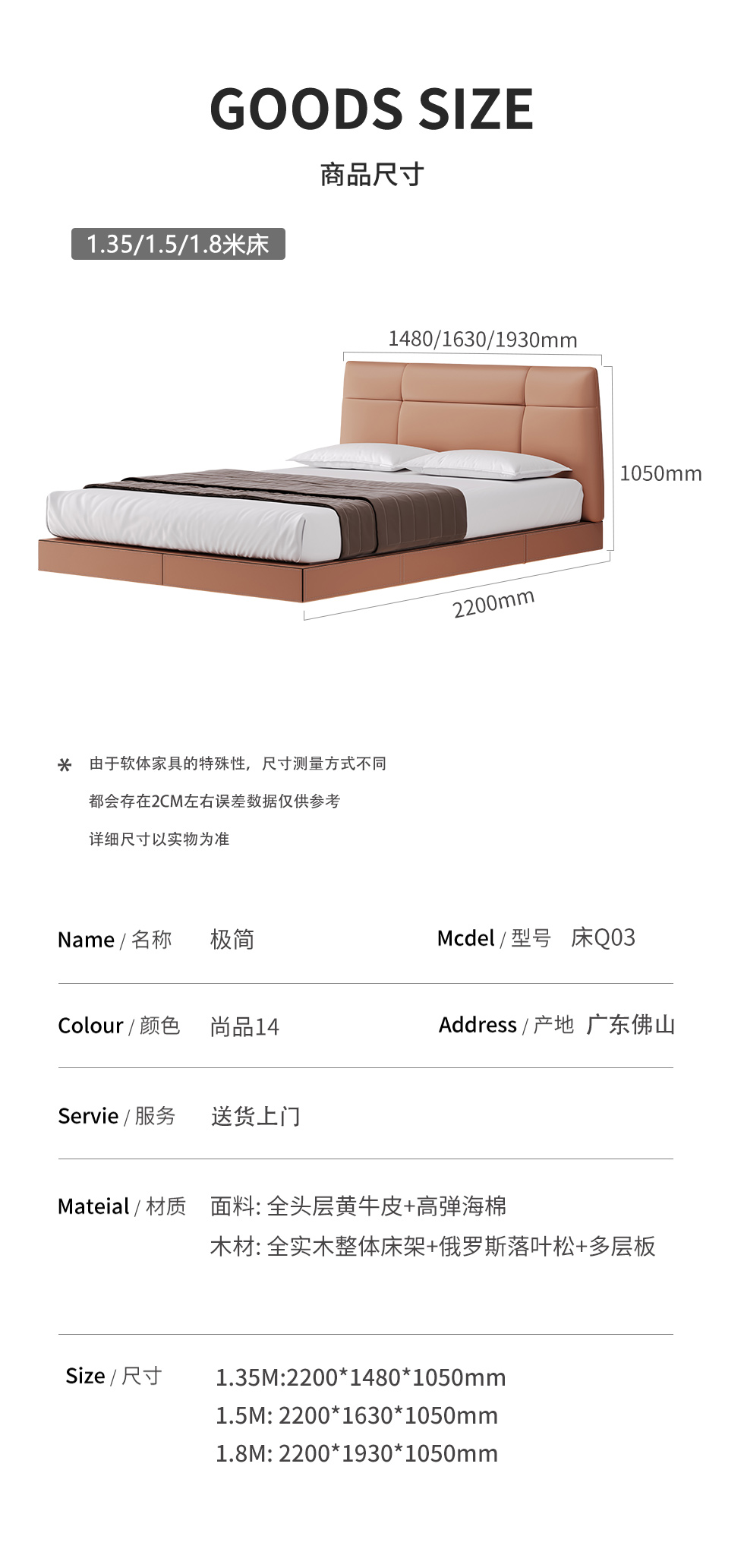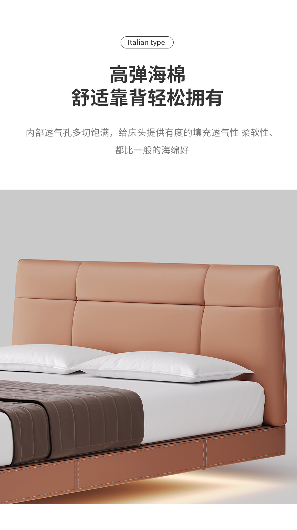 德卡图 现代简约 全头层黄牛皮 全实木整体床架俄罗斯落叶松+多层板+高弹海棉+紫罗兰海棉 1.8*2.0米悬浮床¥6505