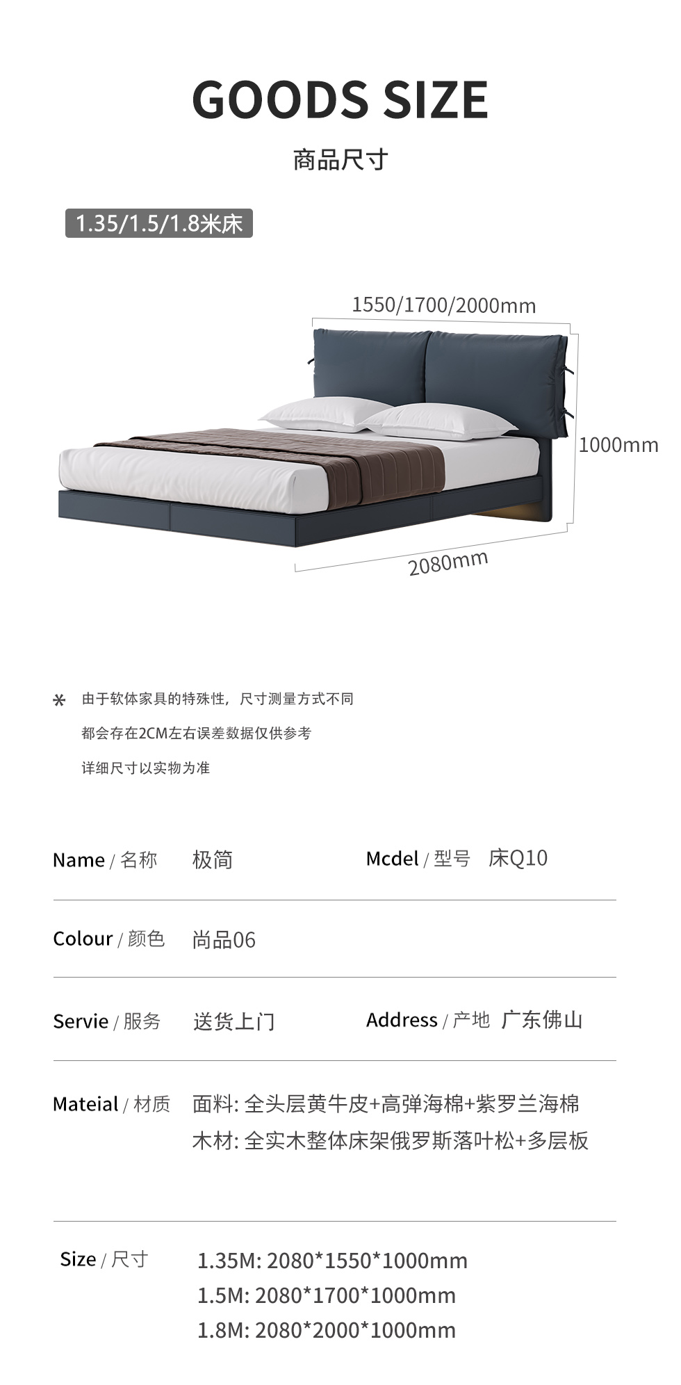 德卡图 现代简约 全头层黄牛皮 全实木整体床架俄罗斯落叶松+多层板+高弹海棉+紫罗兰海棉 1.8*2.0米悬浮床| 商品详情 | 规格参数 | 评价(0) | 购买咨询() | 产品实拍图 | 服务标准 |