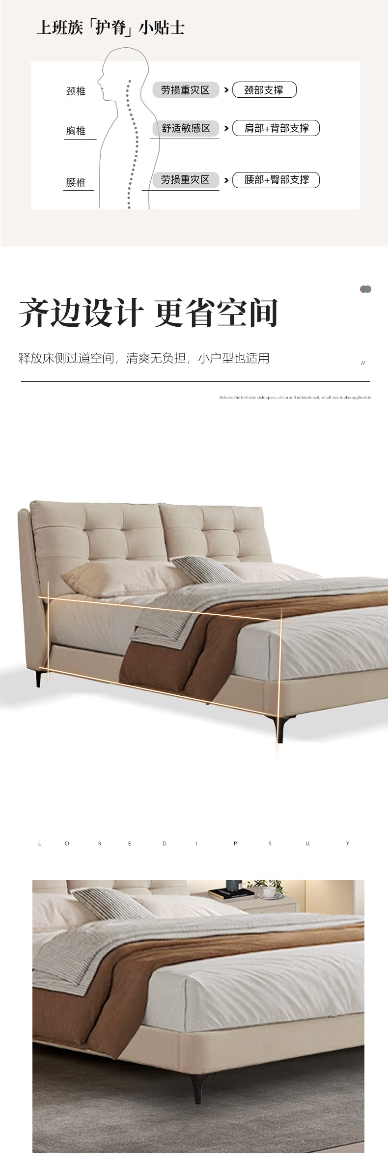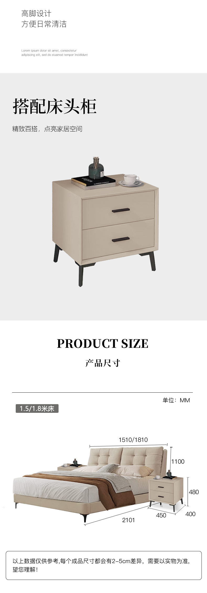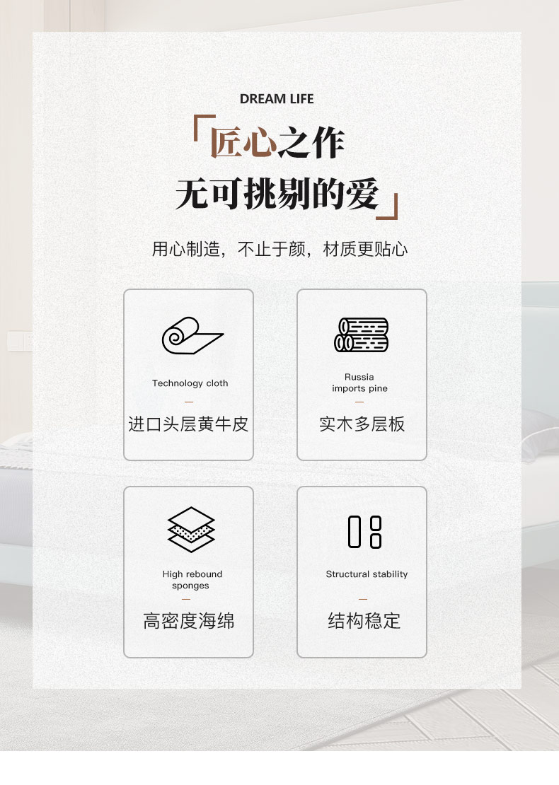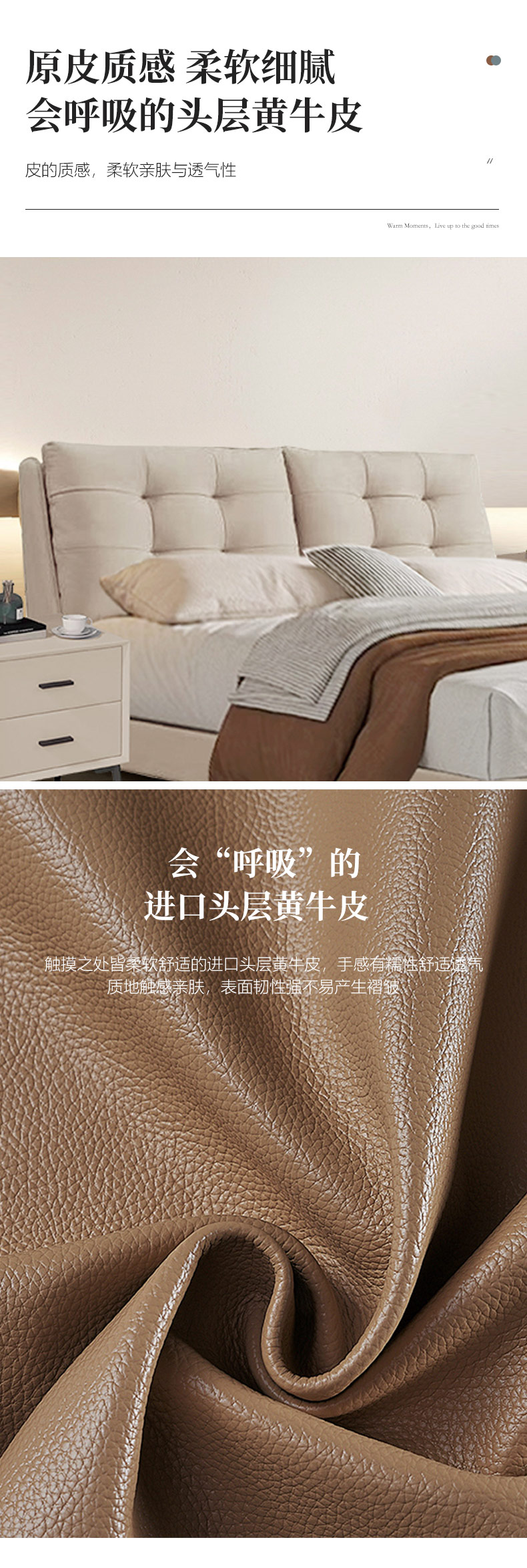 【套餐专享价】每屋优享系列 现代简约 接触面头层牛皮+仿皮+实木框架+钢木排骨架+胶脚 床头柜平面拉手/5分胶脚1.8米床+2床头柜¥3168