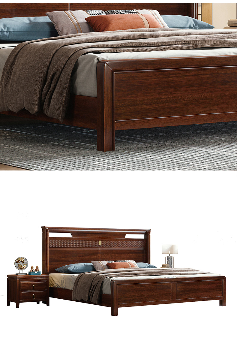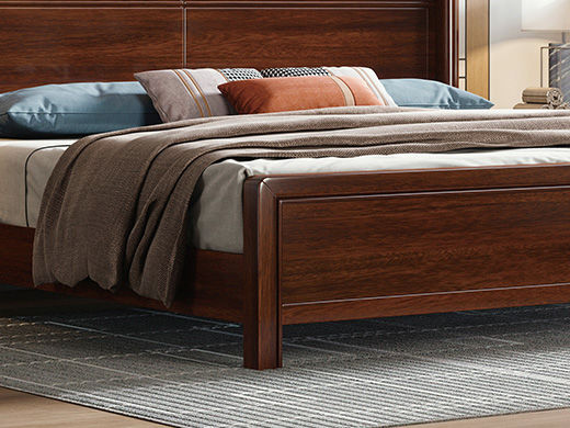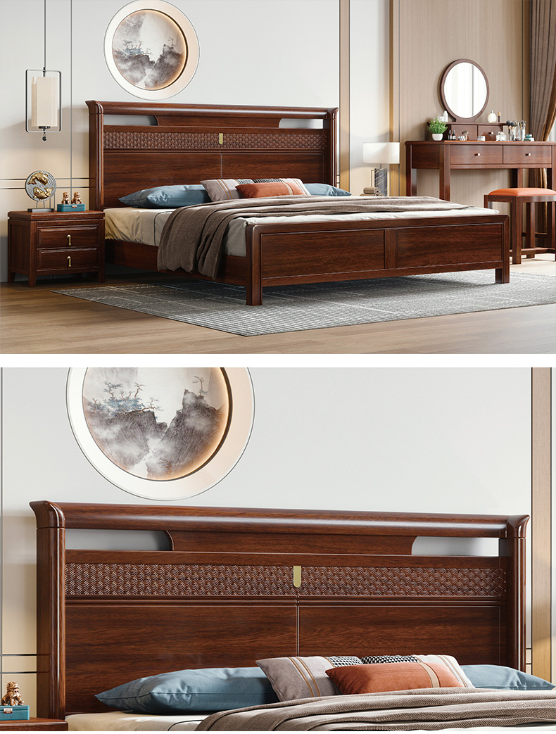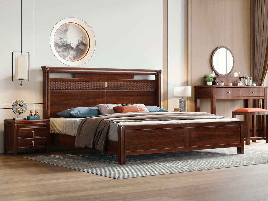 宝瑞·檀风 新中式 印尼金花梨木+多层实木板+木纹木皮+静音床板 紫檀色 1.8米床¥4853