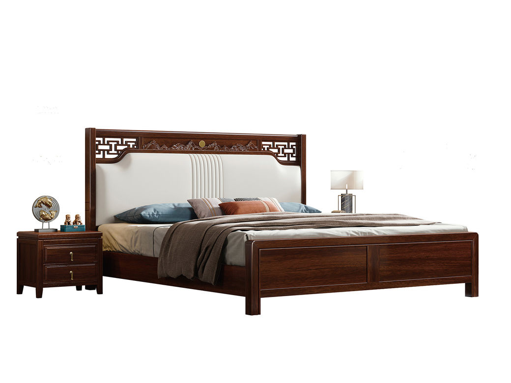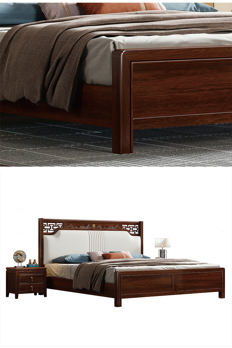 宝瑞·檀风 新中式 印尼金花梨木+多层实木板+木纹木皮+静音床板+仿真皮 紫檀色 1.8米床¥4096