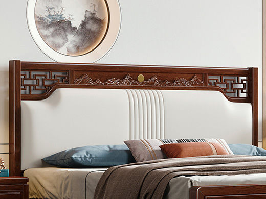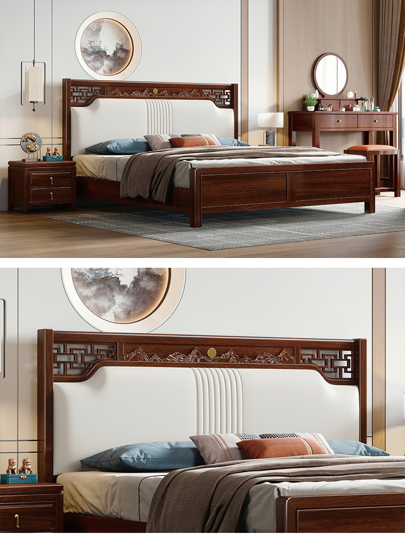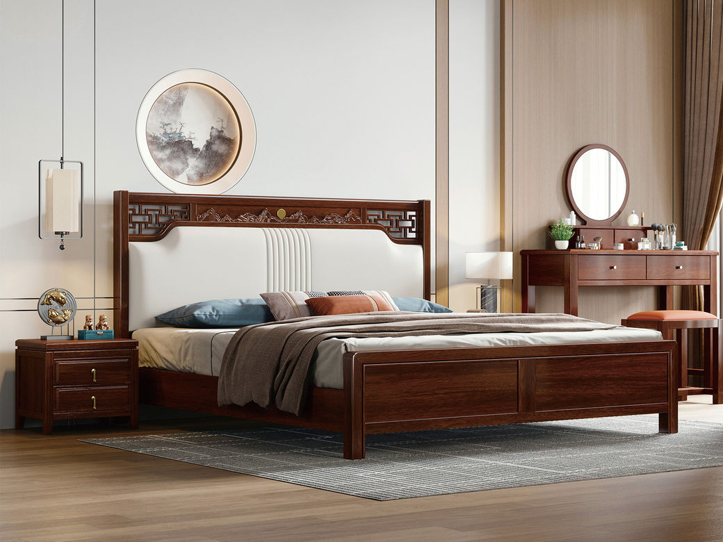宝瑞·檀风 新中式 印尼金花梨木+多层实木板+木纹木皮+静音床板+仿真皮 紫檀色 1.8米床¥4096