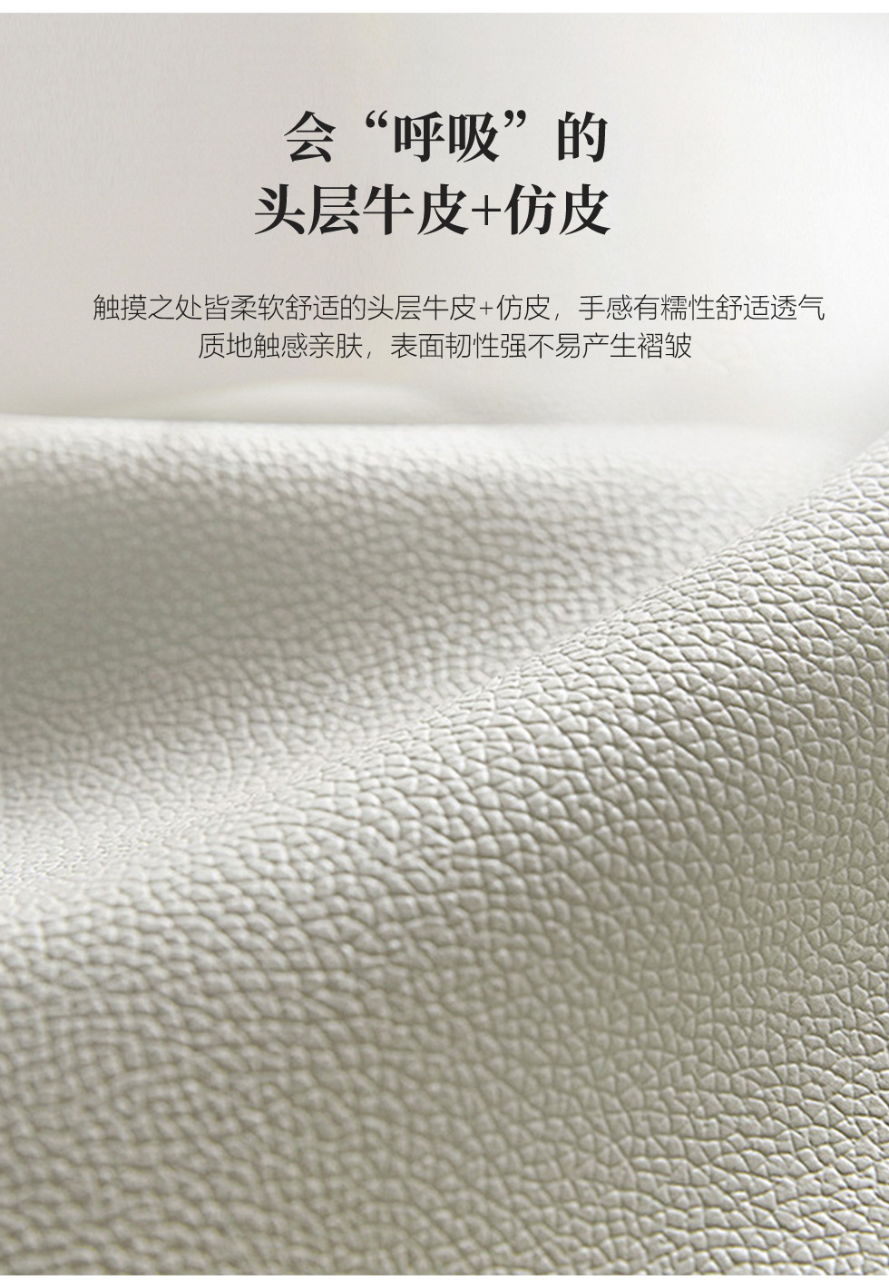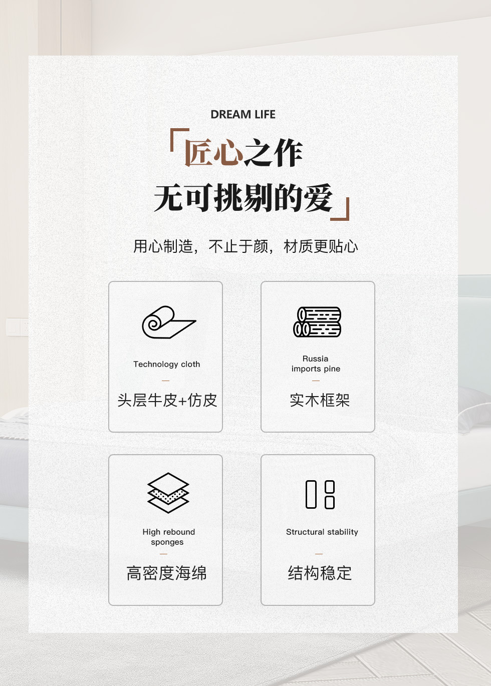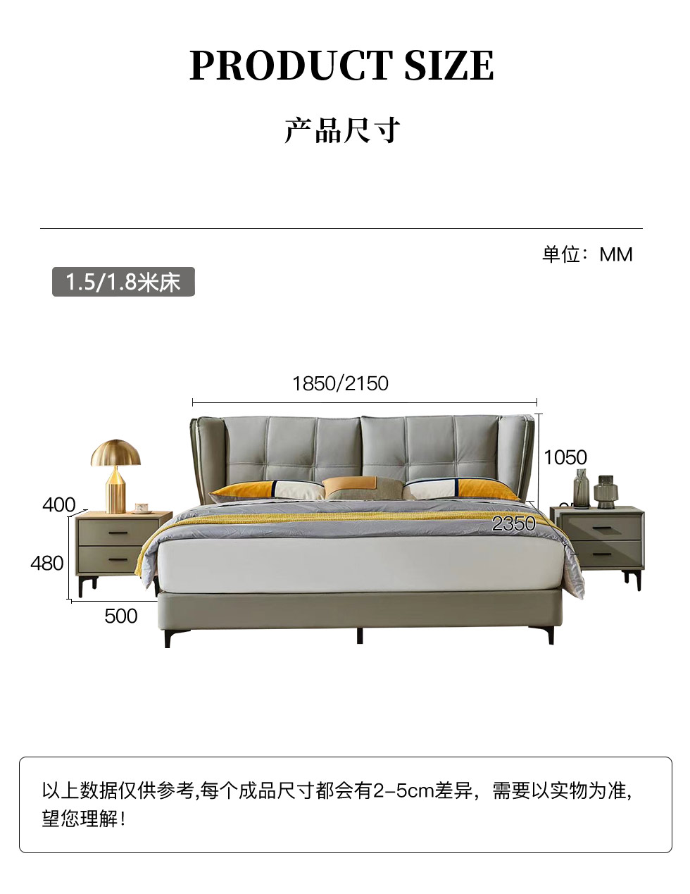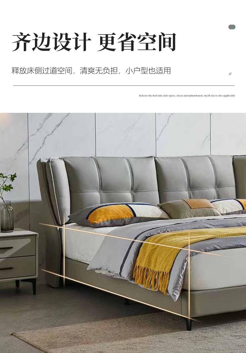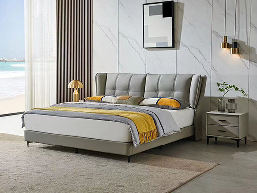 【套餐专享价】每屋优享系列 现代简约 接触面头层牛皮+仿皮+实木框架+钢木排骨架+胶脚 床头柜平面拉手/5分胶脚1.8米床+2床头柜 |