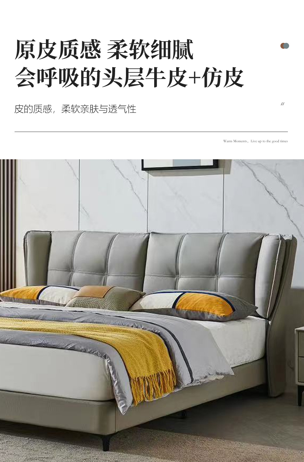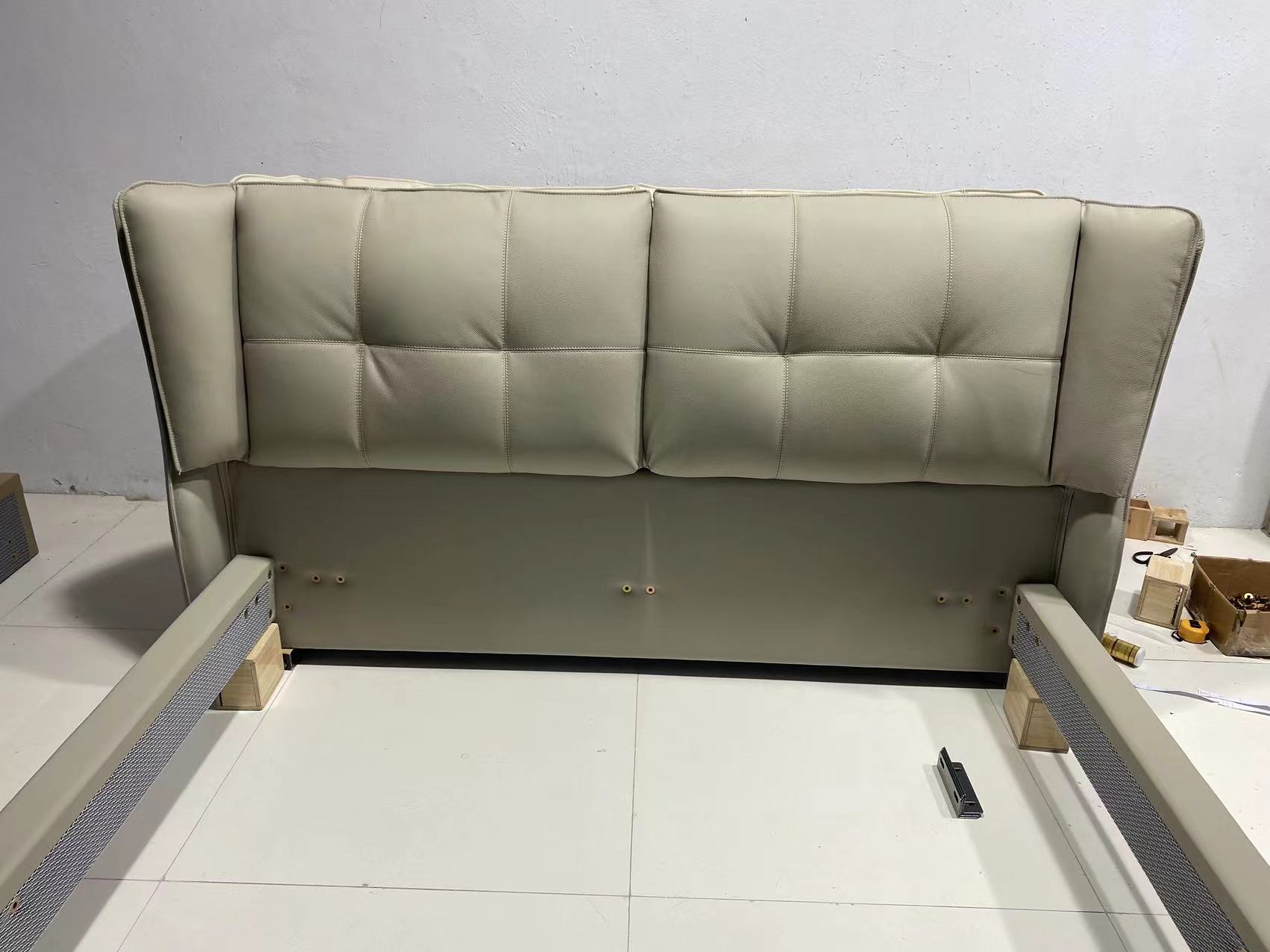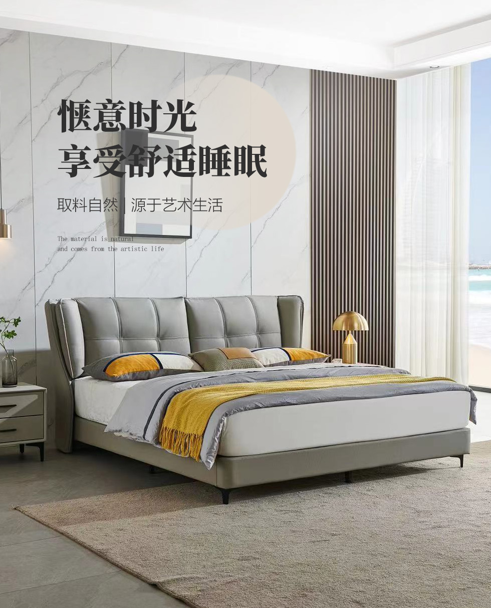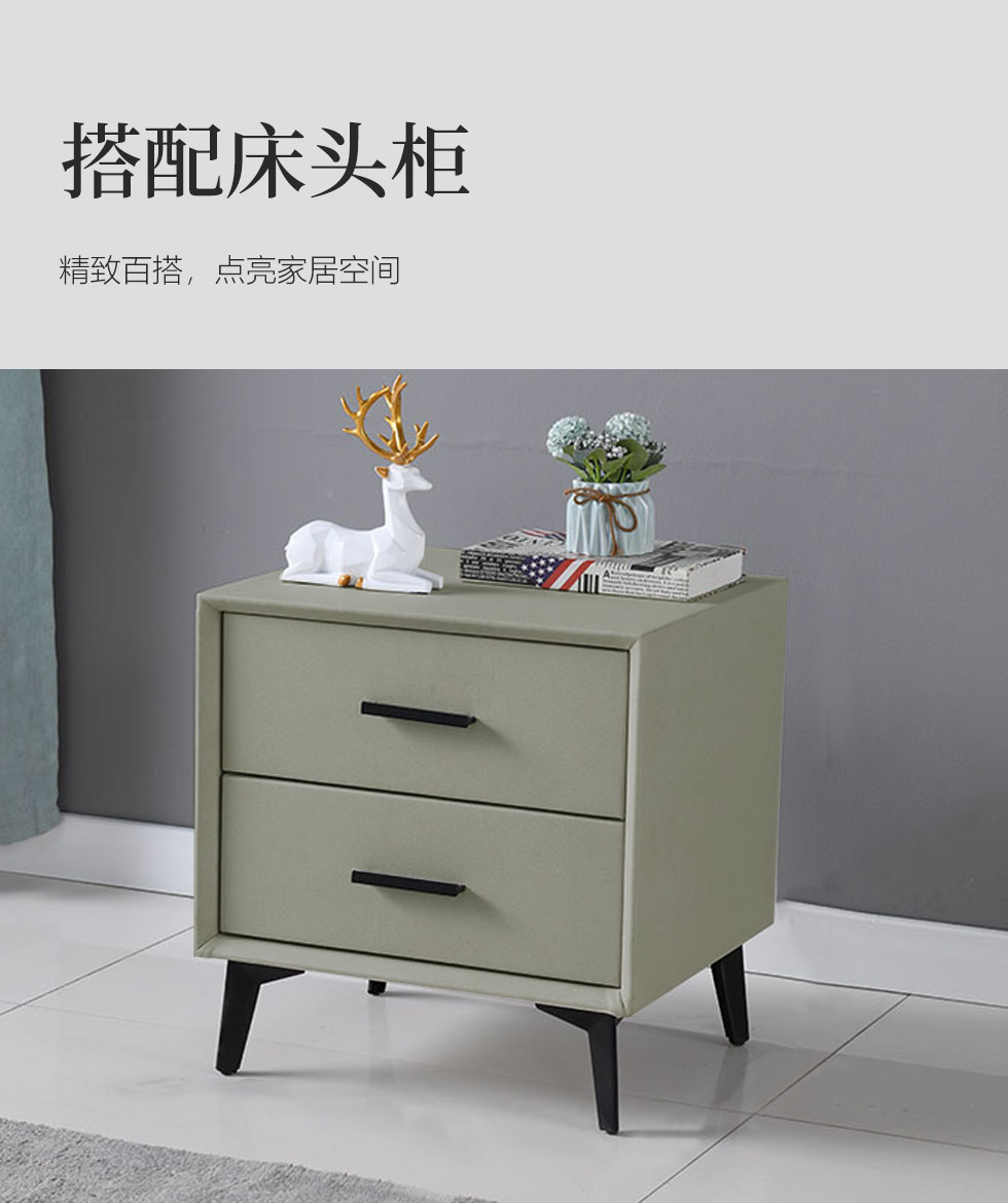 【套餐专享价】每屋优享系列 现代简约 接触面头层牛皮+仿皮+实木框架+钢木排骨架+胶脚 床头柜平面拉手/5分胶脚1.8米床+2床头柜