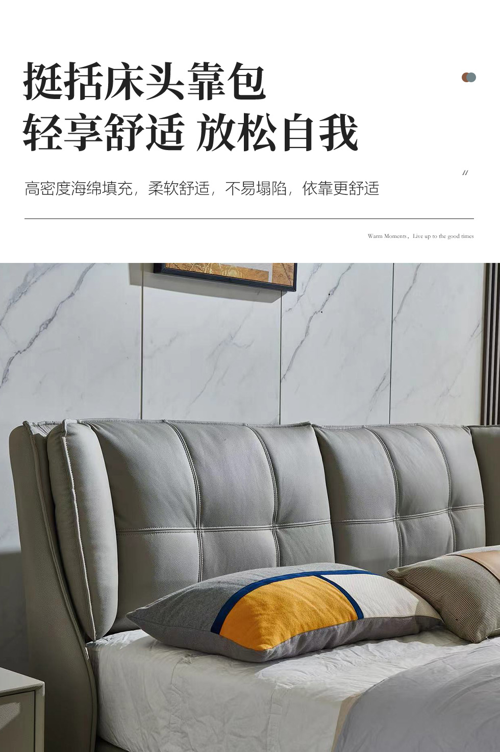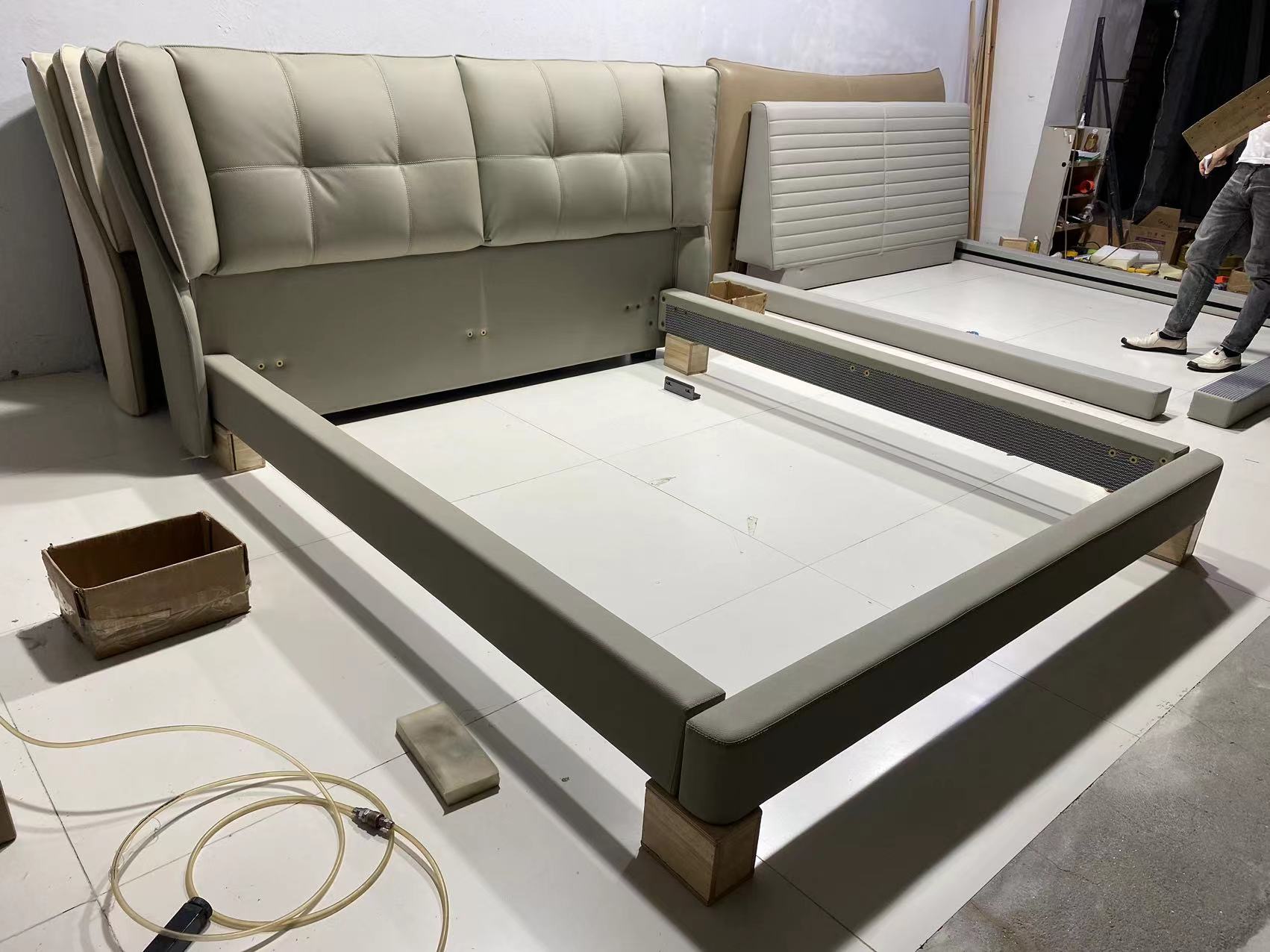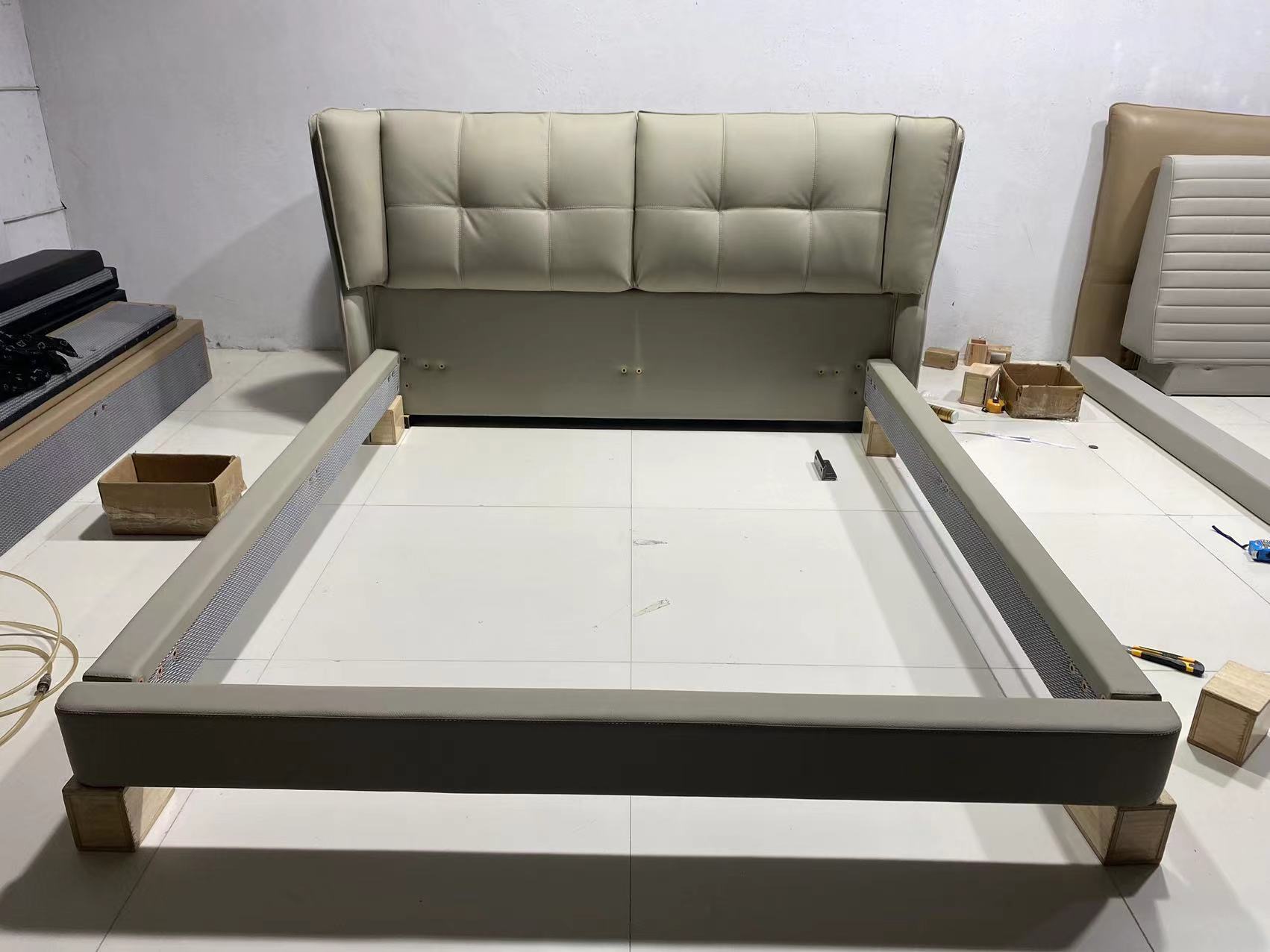 【套餐专享价】每屋优享系列 现代简约 接触面头层牛皮+仿皮+实木框架+钢木排骨架+胶脚 床头柜平面拉手/5分胶脚1.8米床+2床头柜