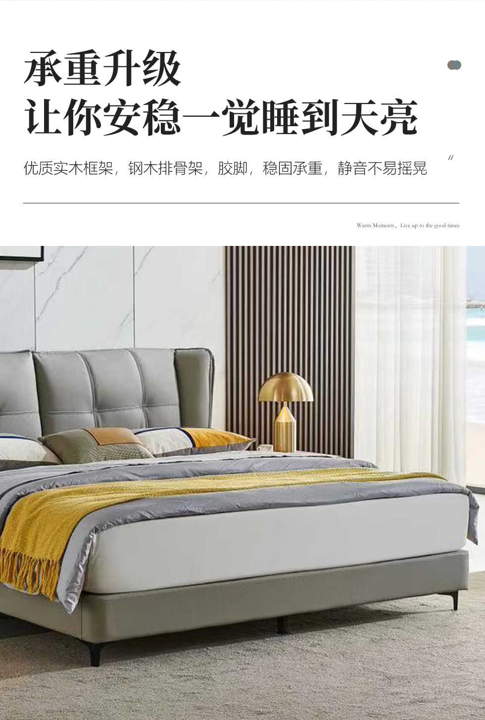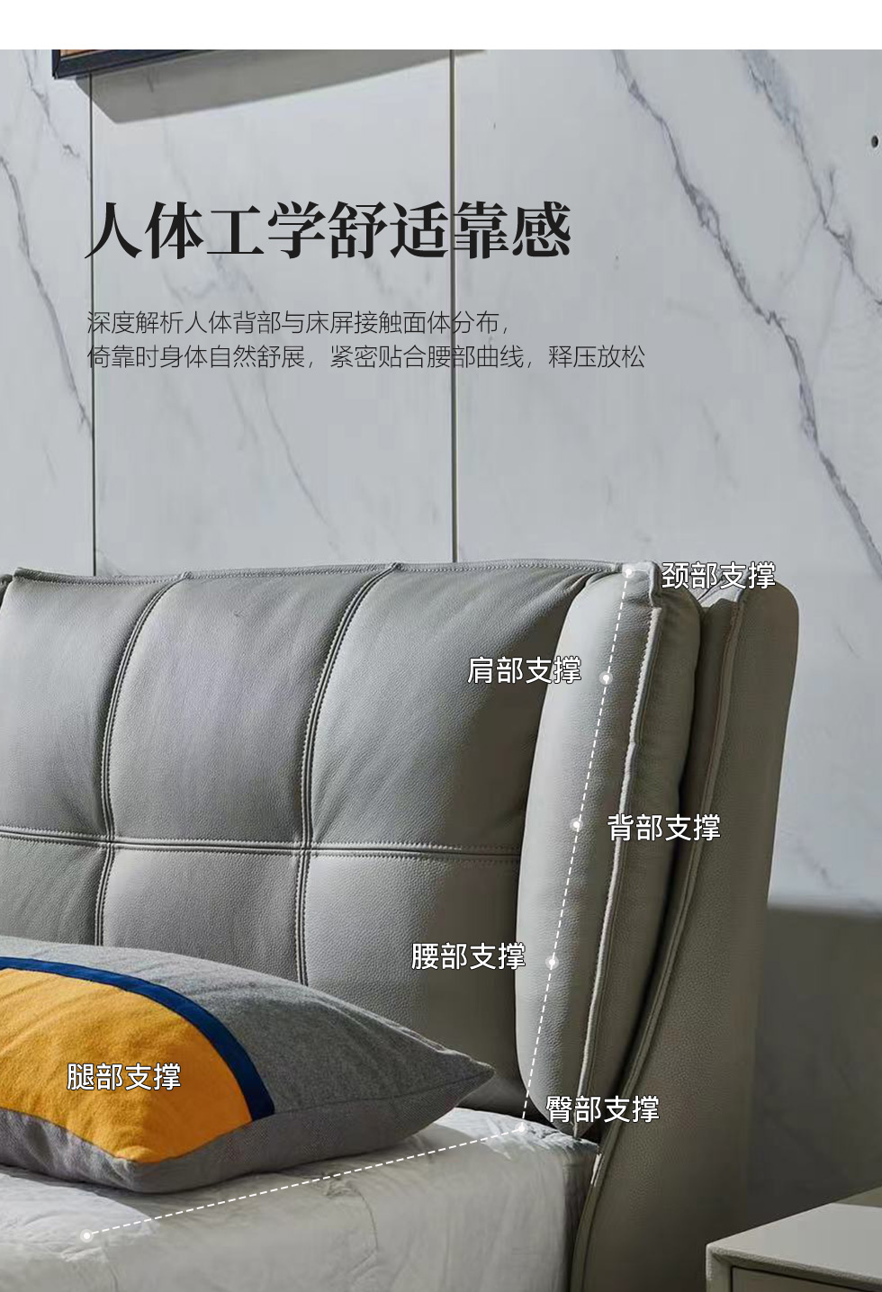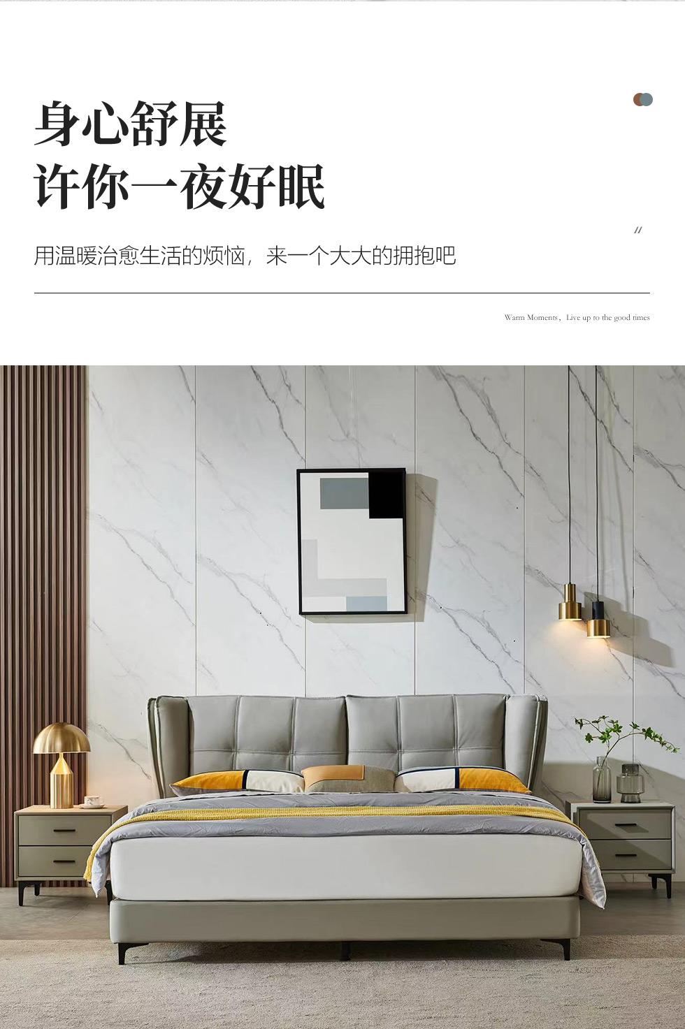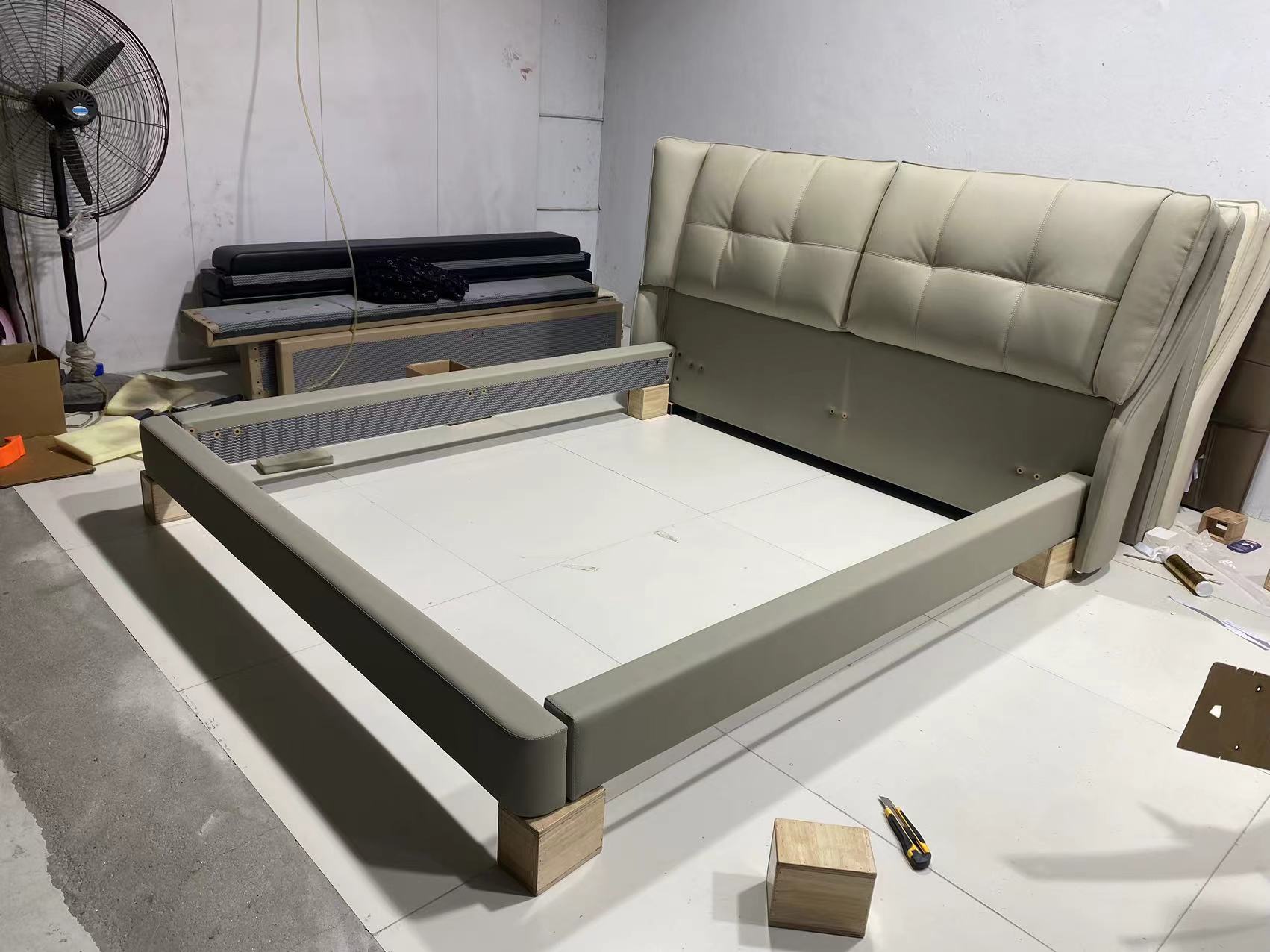 【套餐专享价】每屋优享系列 现代简约 接触面头层牛皮+仿皮+实木框架+钢木排骨架+胶脚 床头柜平面拉手/5分胶脚1.8米床+2床头柜