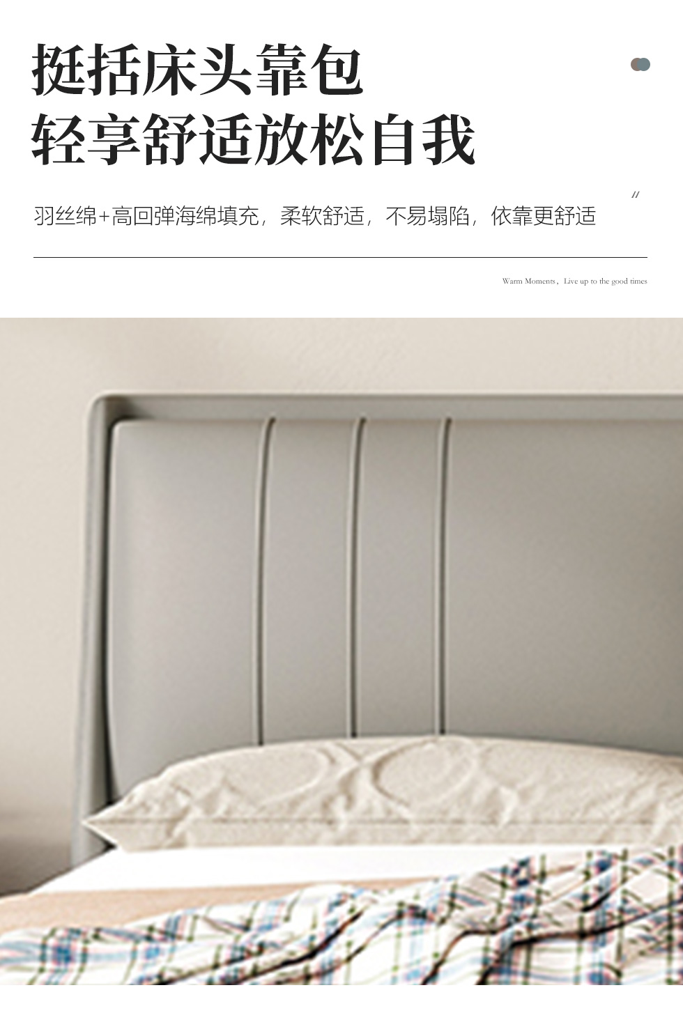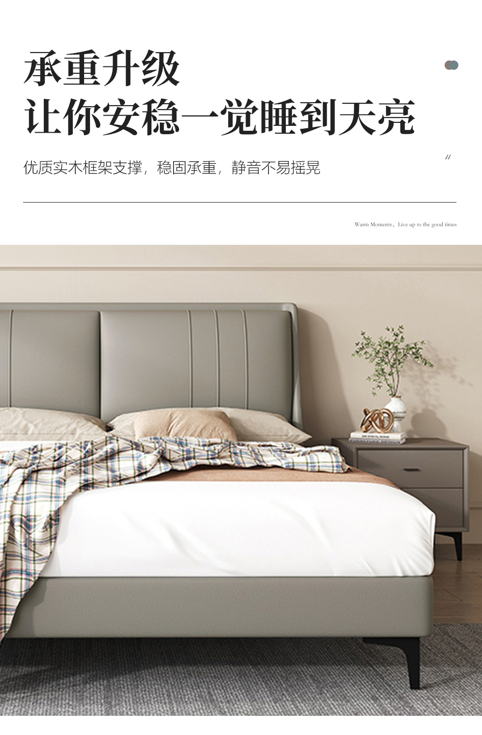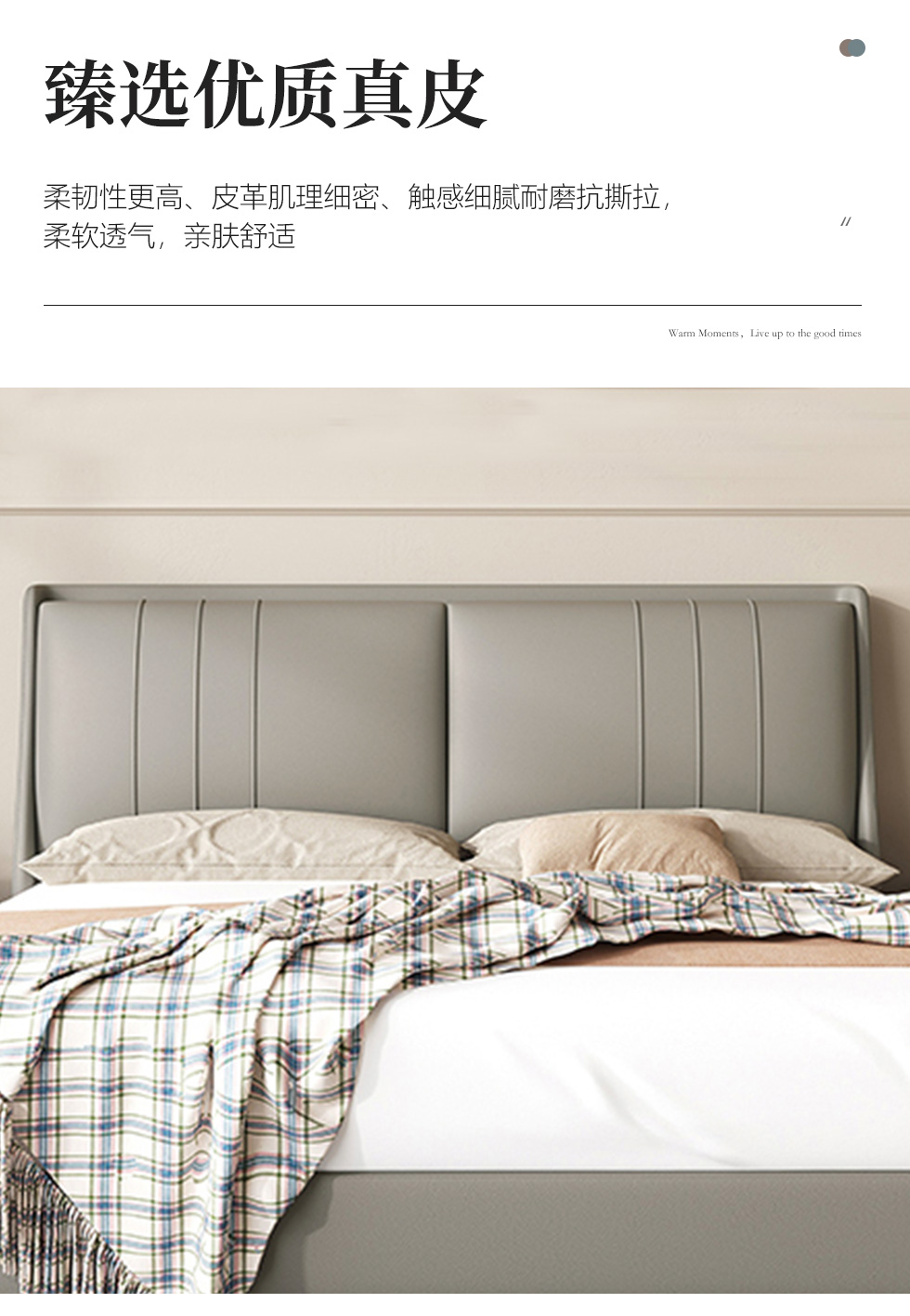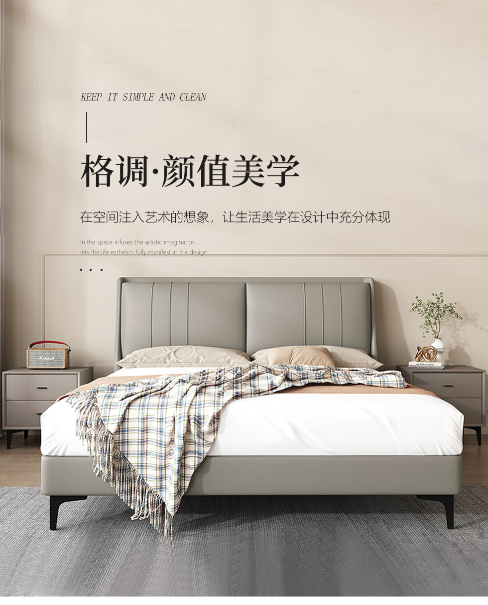 维利品尚 现代简约 接触面头层真皮+填充:竹炭海绵+实木内架+实木脚 1.8米床