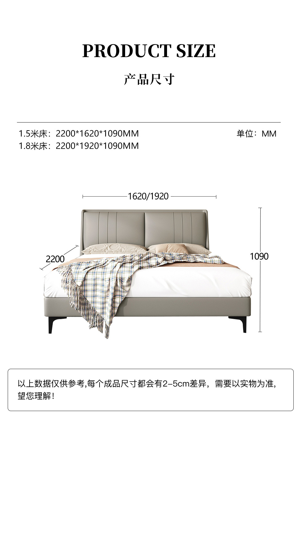 维利品尚 现代简约 接触面真皮+实木内架+碳素钢五金脚+10公分钢木+松木排骨架 1.5米床