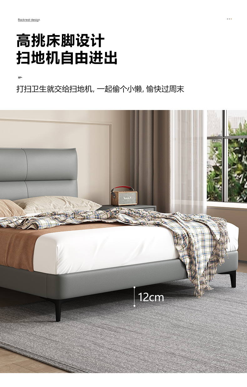 维利品尚 现代简约 接触面真皮+实木内架+碳素钢五金脚+10公分钢木+松木排骨架 1.8米床