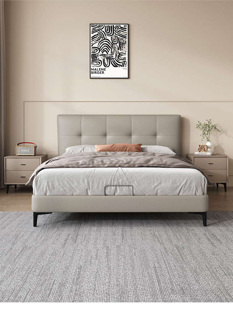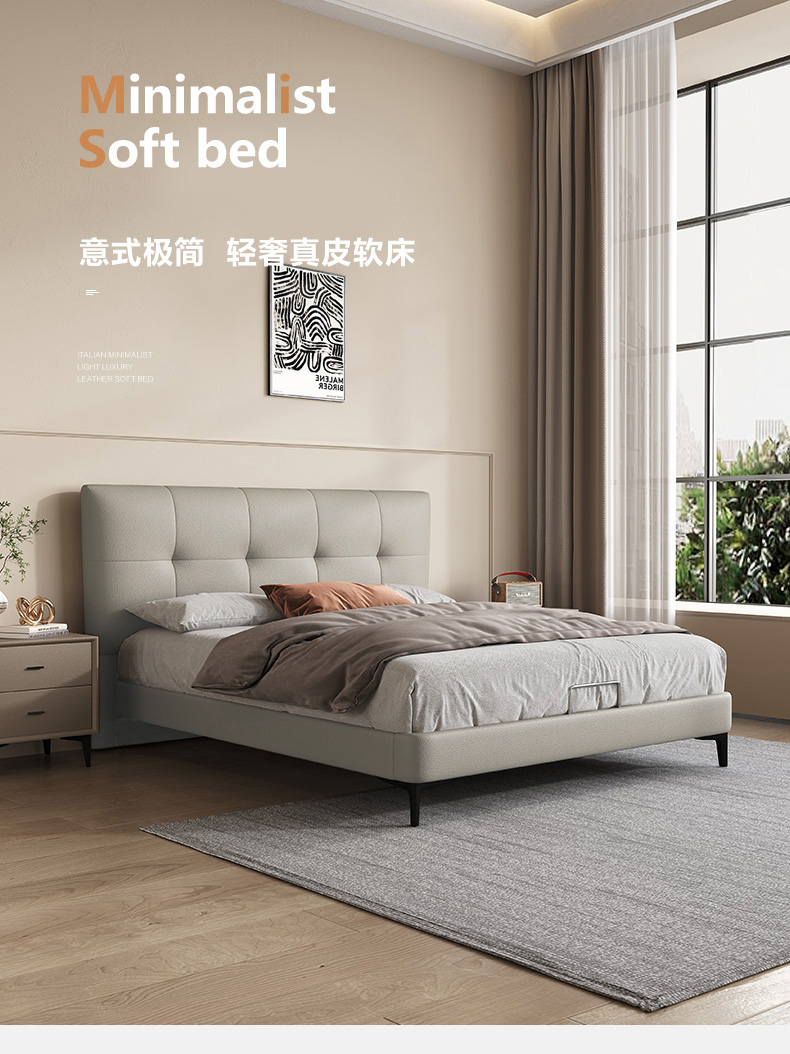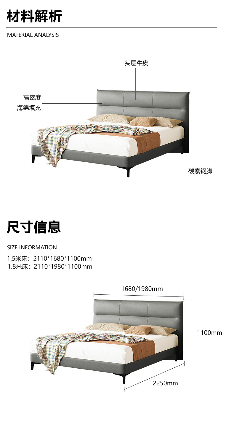 维利品尚 现代简约 接触面头层真皮+高密度海绵+10公分钢木排骨架+碳素钢脚 1.8米床