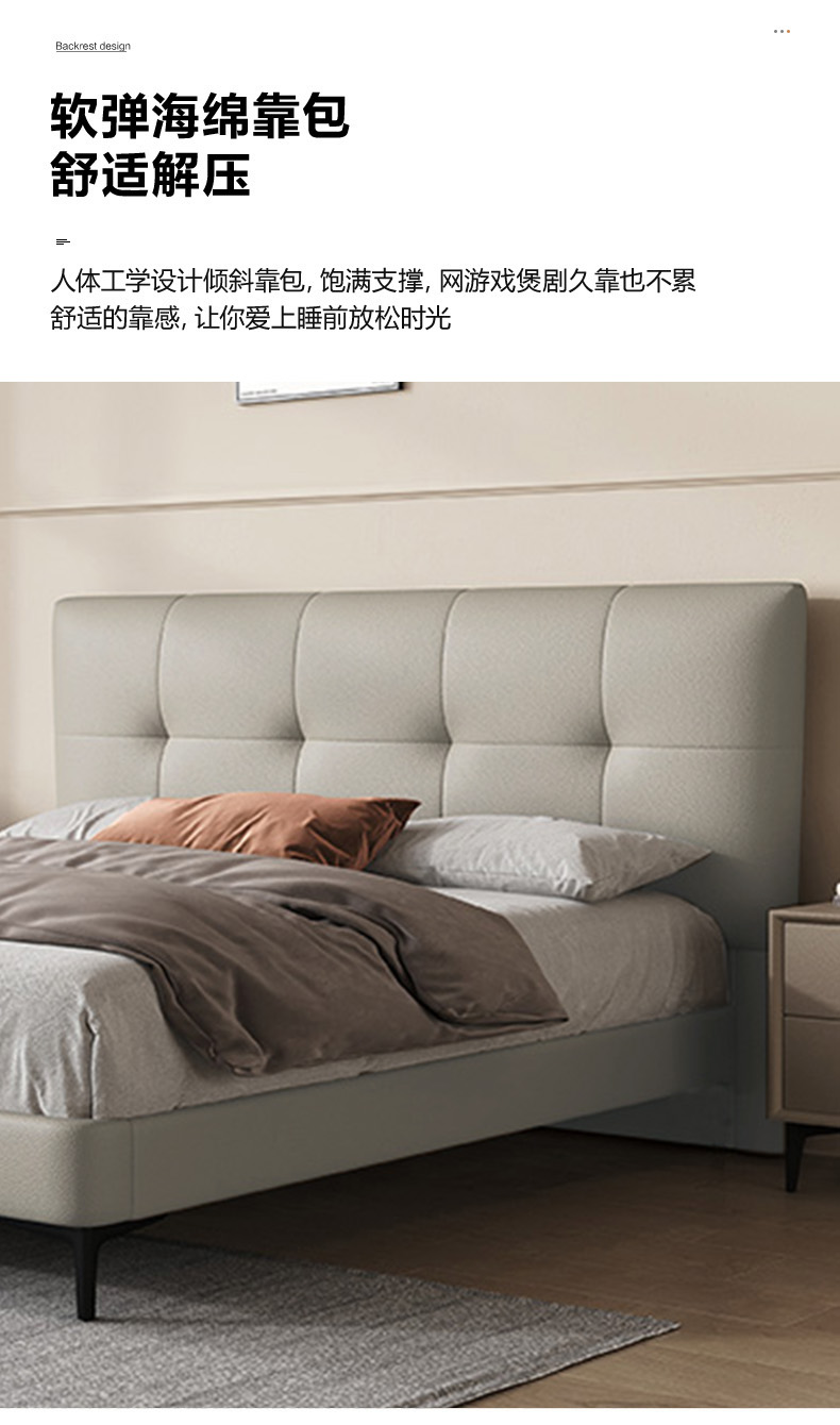 维利品尚 现代简约 接触面头层真皮+填充:竹炭海绵+实木内架+实木脚 1.8米床