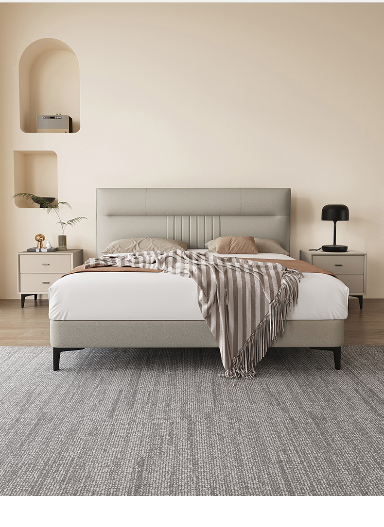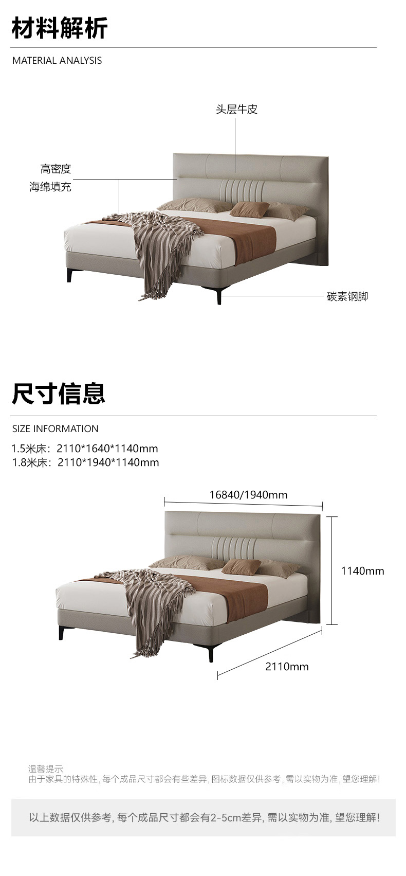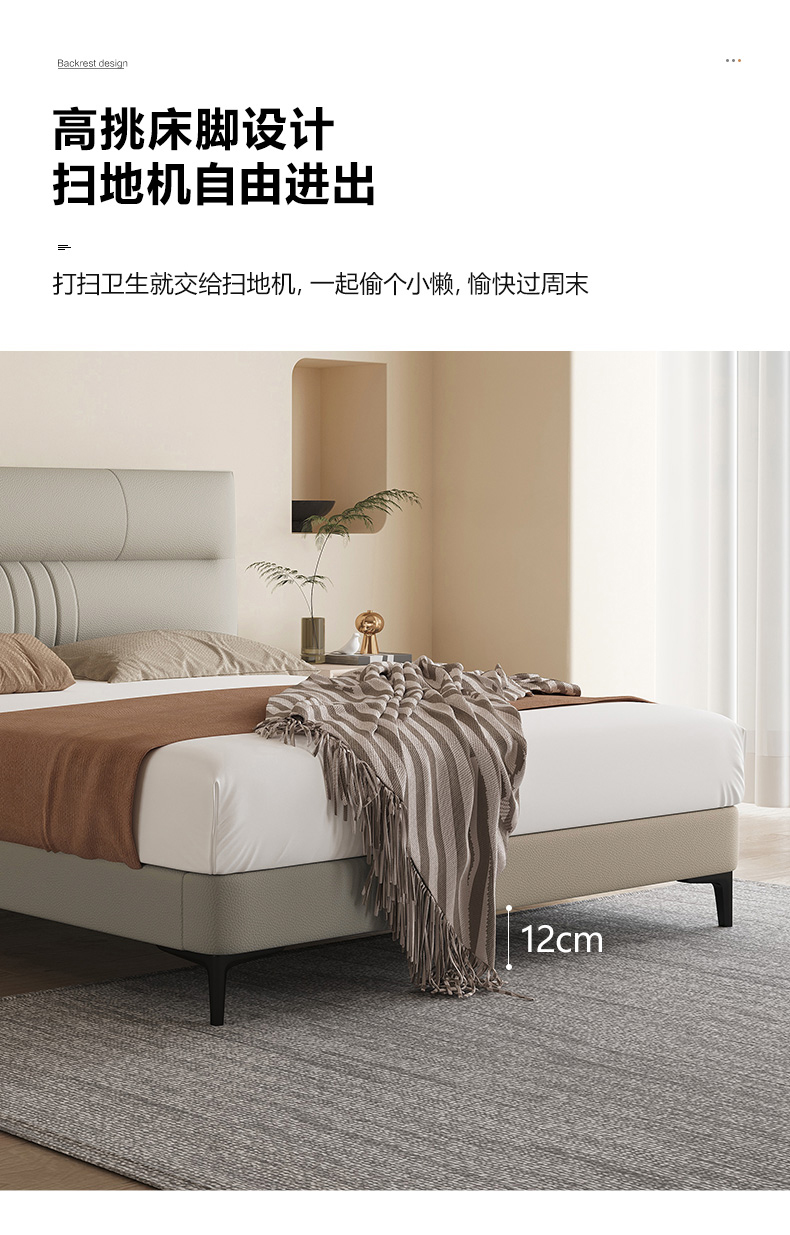维利品尚 现代简约 接触面真皮+实木内架+碳素钢五金脚+10公分钢木+松木排骨架 1.8米床