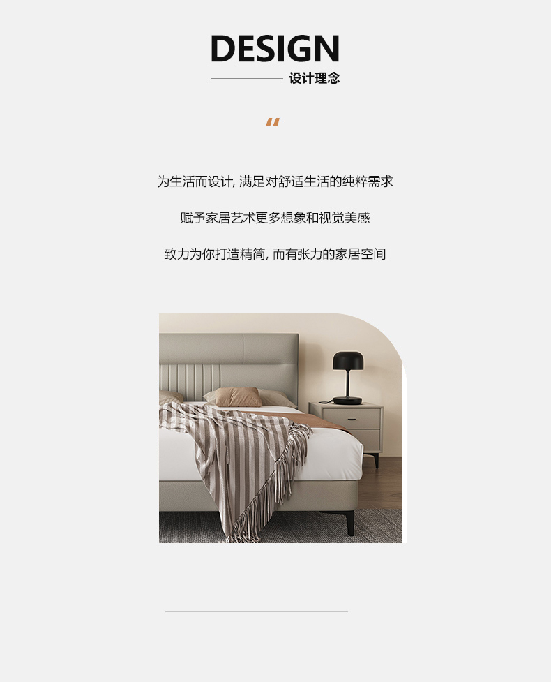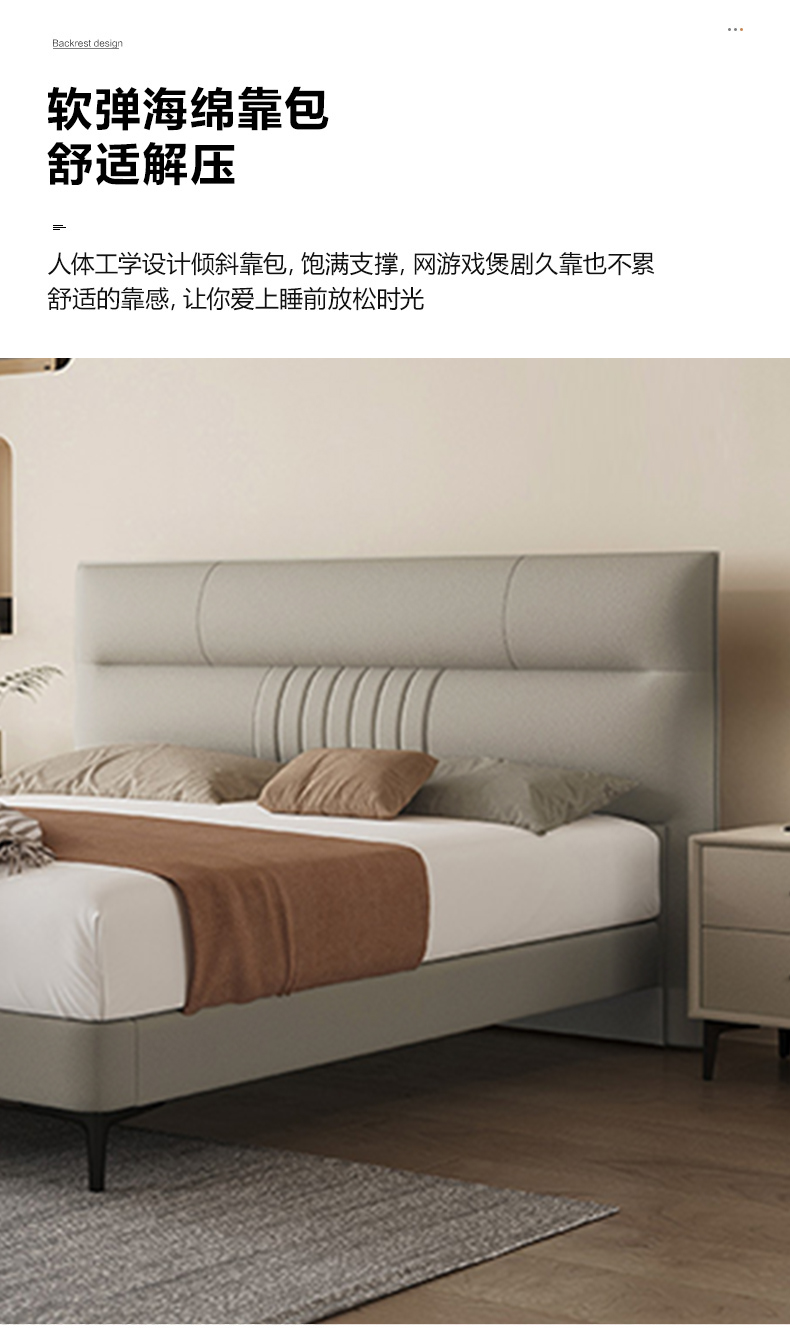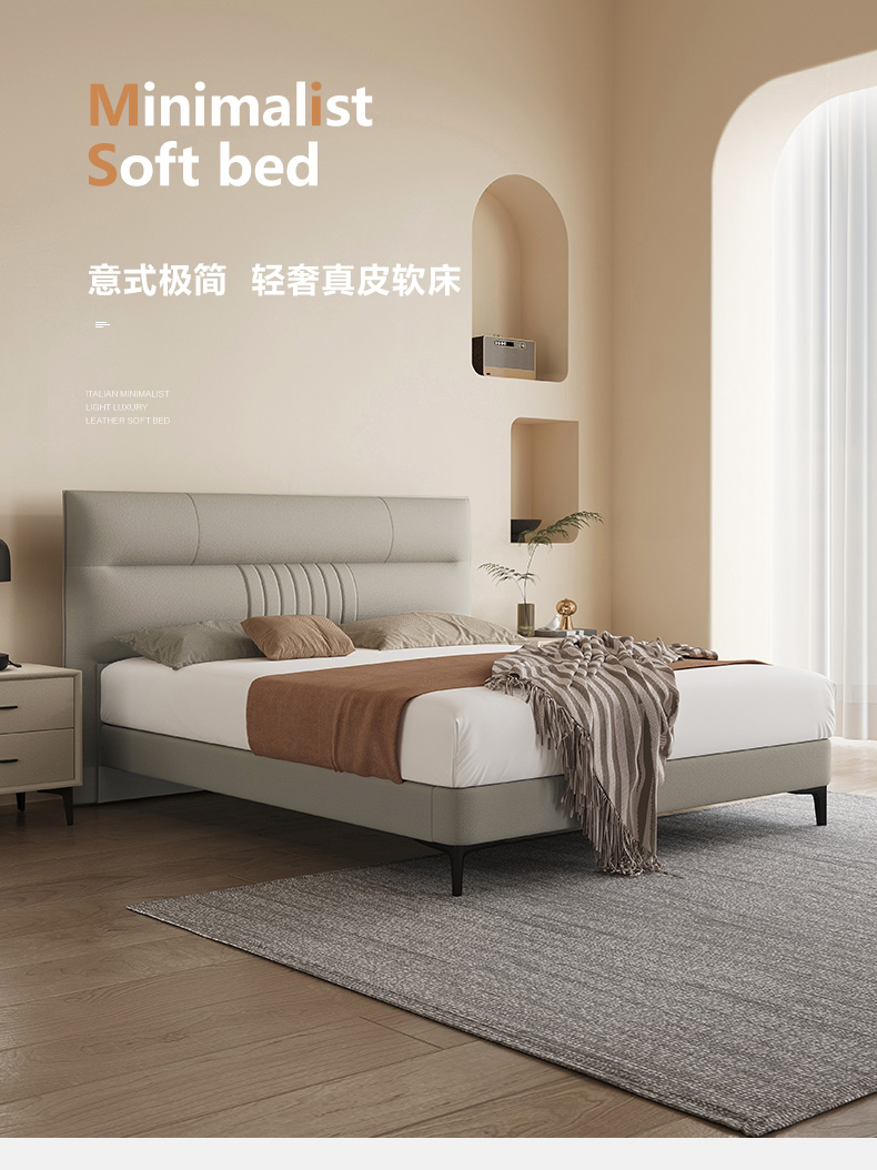 维利品尚 现代简约 接触面头层真皮+填充:竹炭海绵+实木内架+实木脚 1.8米床