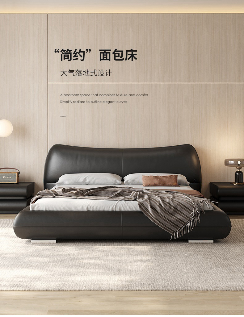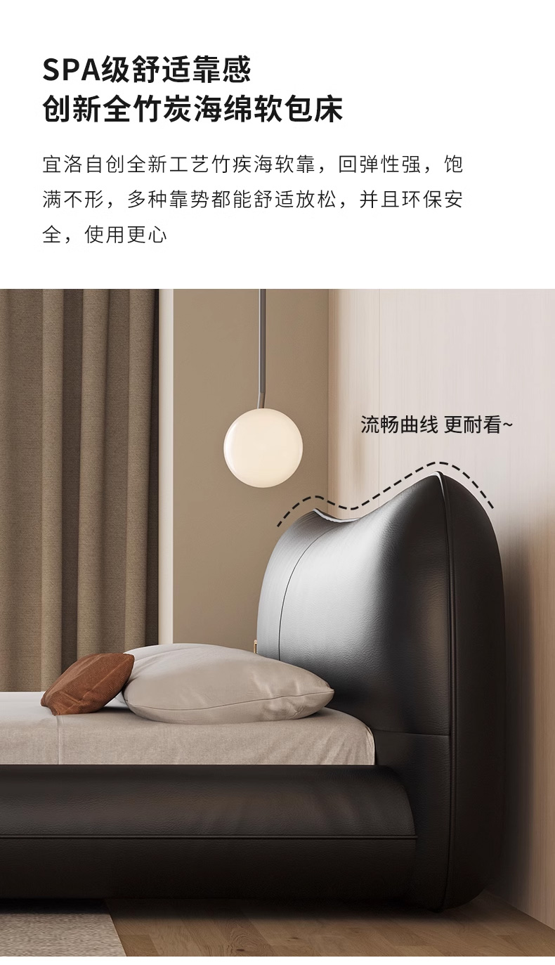 维利品尚 现代简约 接触面头层真皮+填充:竹炭海绵+实木内架+实木脚 1.8米床